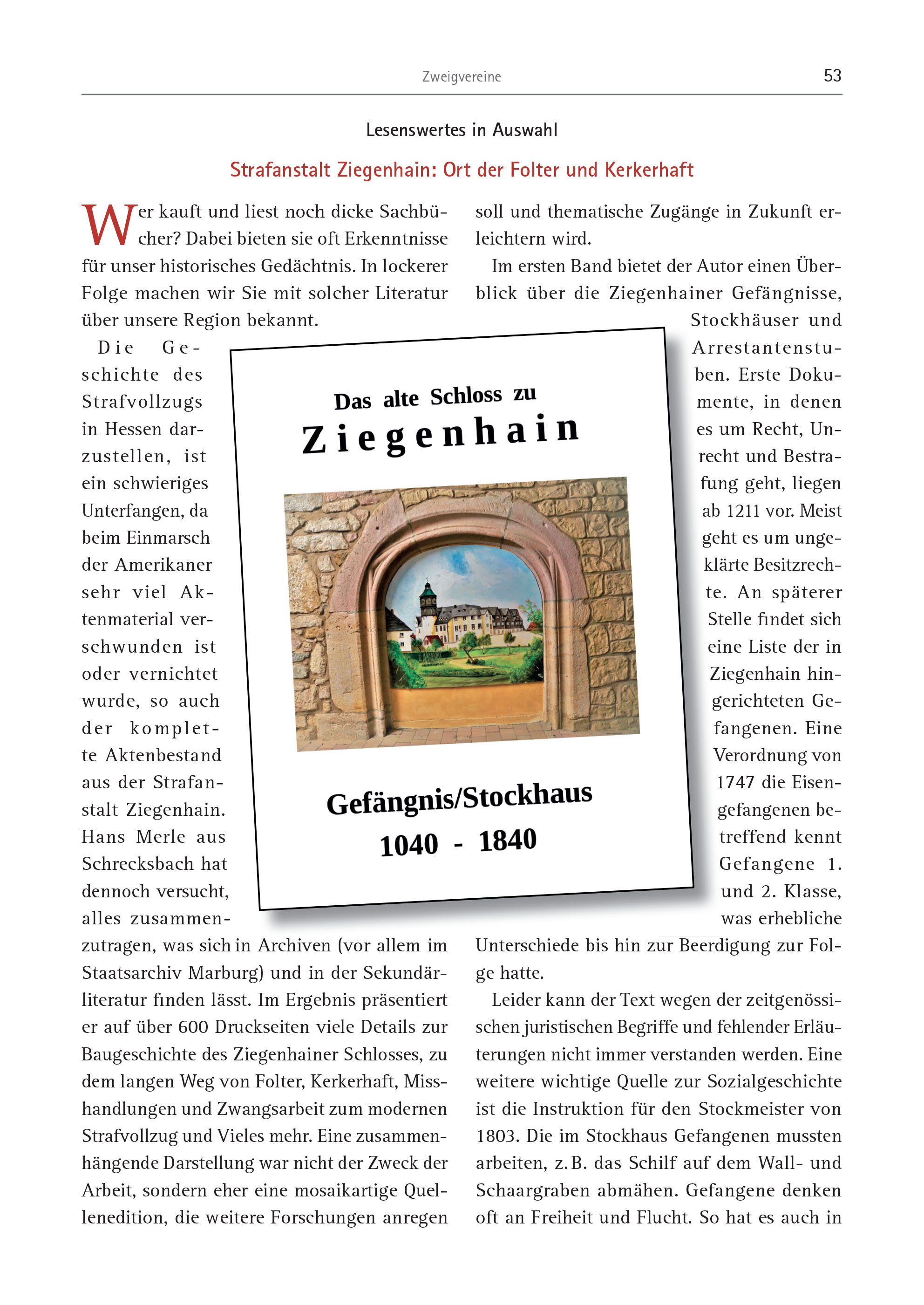 Zweigvereine 53 Wer kauft und liest noch dicke Sachbücher? Dabei bieten sie oft Erkenntnisse für unser historisches Gedächtnis. In lockerer Folge machen wir Sie mit solcher Literatur über unsere Region bekannt. D i e G e - schichte des Strafvollzugs in Hessen darzustellen, ist ein schwieriges Unterfangen, da beim Einmarsch der Amerikaner sehr viel Aktenmaterial verschwunden ist oder vernichtet wurde, so auch der komplette Aktenbestand aus der Strafanstalt Ziegenhain. Hans Merle aus Schrecksbach hat dennoch versucht, alles zusammenzutragen, was sich in Archiven (vor allem im Staatsarchiv Marburg) und in der Sekundärliteratur fi nden lässt. Im Ergebnis präsentiert er auf über 600 Druckseiten viele Details zur Baugeschichte des Ziegenhainer Schlosses, zu dem langen Weg von Folter, Kerkerhaft, Misshandlungen und Zwangsarbeit zum modernen Strafvollzug und Vieles mehr. Eine zusammenhängende Darstellung war nicht der Zweck der Arbeit, sondern eher eine mosaikartige Quellenedition, die weitere Forschungen anregen soll und thematische Zugänge in Zukunft erleichtern wird. Im ersten Band bietet der Autor einen Überblick über die Ziegenhainer Gefängnisse, Stockhäuser und Arrestantenstuben. Erste Dokumente, in denen es um Recht, Unrecht und Bestrafung geht, liegen ab 1211 vor. Meist geht es um ungeklärte Besitzrechte. An späterer Stelle fi ndet sich eine Liste der in Ziegenhain hingerichteten Gefangenen. Eine Verordnung von 1747 die Eisengefangenen betreffend kennt Gefangene 1. und 2. Klasse, was erhebliche Unterschiede bis hin zur Beerdigung zur Folge hatte. Leider kann der Text wegen der zeitgenössischen juristischen Begriffe und fehlender Erläuterungen nicht immer verstanden werden. Eine weitere wichtige Quelle zur Sozialgeschichte ist die Instruktion für den Stockmeister von 1803. Die im Stockhaus Gefangenen mussten arbeiten, z. B. das Schilf auf dem Wall- und Schaargraben abmähen. Gefangene denken oft an Freiheit und Flucht. So hat es auch in Lesenswertes in Auswahl Strafanstalt Ziegenhain: Ort der Folter und Kerkerhaft