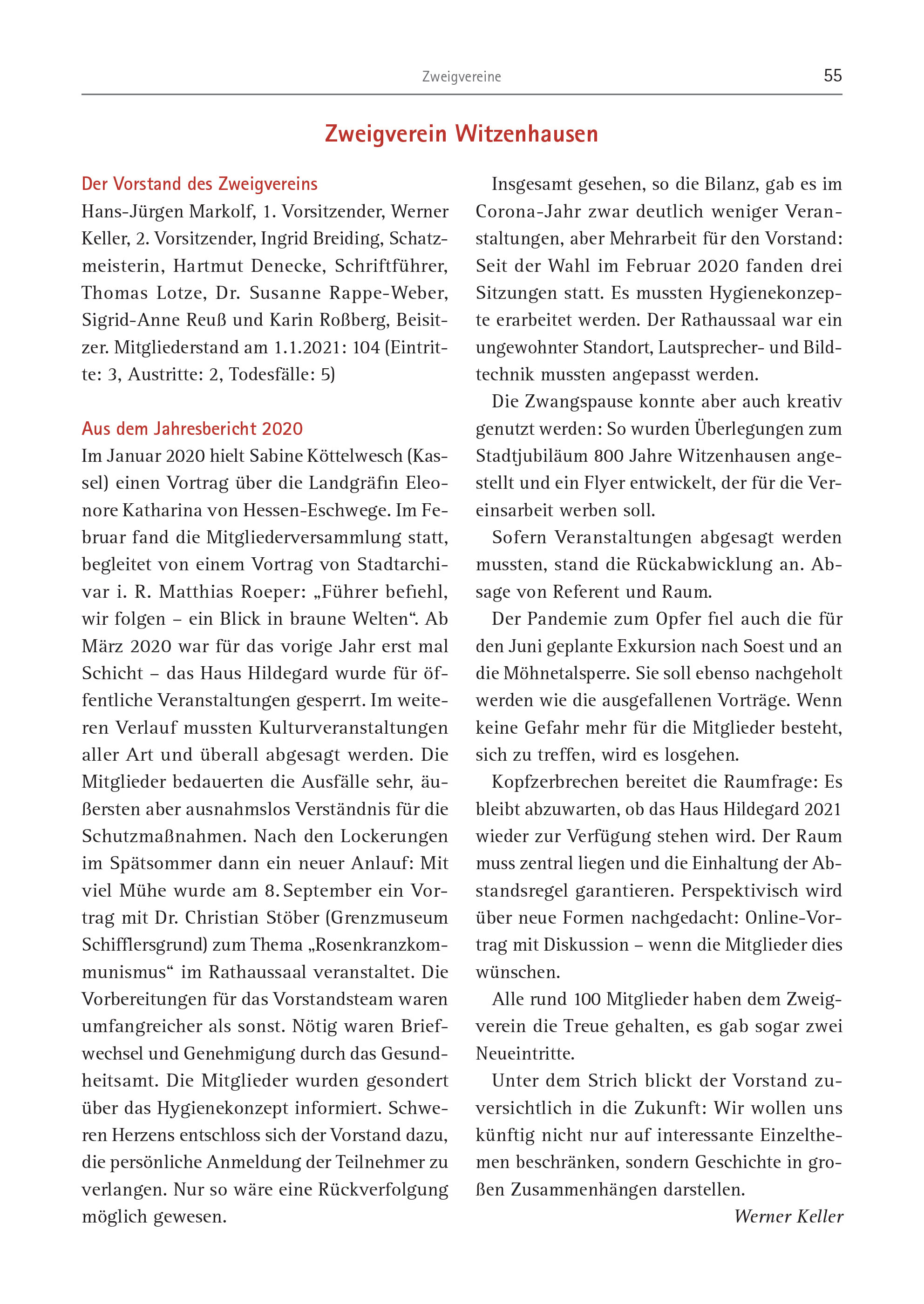 Zweigvereine 55 Der Vorstand des Zweigvereins Hans-Jürgen Markolf, 1. Vorsitzender, Werner Keller, 2. Vorsitzender, Ingrid Breiding, Schatzmeisterin, Hartmut Denecke, Schriftführer, Thomas Lotze, Dr. Susanne Rappe-Weber, Sigrid- Anne Reuß und Karin Roßberg, Beisitzer. Mitgliederstand am 1.1.2021: 104 (Eintritte: 3, Austritte: 2, Todesfälle: 5) Aus dem Jahresbericht 2020 Im Januar 2020 hielt Sabine Köttelwesch (Kassel) einen Vortrag über die Landgräfin Eleonore Katharina von Hessen-Eschwege. Im Februar fand die Mitgliederversammlung statt, begleitet von einem Vortrag von Stadtarchivar i. R. Matthias Roeper: „Führer befiehl, wir folgen – ein Blick in braune Welten“. Ab März 2020 war für das vorige Jahr erst mal Schicht – das Haus Hildegard wurde für öffentliche Veranstaltungen gesperrt. Im weiteren Verlauf mussten Kulturveranstaltungen aller Art und überall abgesagt werden. Die Mitglieder bedauerten die Ausfälle sehr, äußersten aber ausnahmslos Verständnis für die Schutzmaßnahmen. Nach den Lockerungen im Spätsommer dann ein neuer Anlauf: Mit viel Mühe wurde am 8. September ein Vortrag mit Dr. Christian Stöber (Grenzmuseum Schifflersgrund) zum Thema „Rosenkranzkommunismus“ im Rathaussaal veranstaltet. Die Vorbereitungen für das Vorstandsteam waren umfangreicher als sonst. Nötig waren Briefwechsel und Genehmigung durch das Gesundheitsamt. Die Mitglieder wurden gesondert über das Hygienekonzept informiert. Schweren Herzens entschloss sich der Vorstand dazu, die persönliche Anmeldung der Teilnehmer zu verlangen. Nur so wäre eine Rückverfolgung möglich gewesen. Zweigverein Witzenhausen Insgesamt gesehen, so die Bilanz, gab es im Corona-Jahr zwar deutlich weniger Veranstaltungen, aber Mehrarbeit für den Vorstand: Seit der Wahl im Februar 2020 fanden drei Sitzungen statt. Es mussten Hygienekonzepte erarbeitet werden. Der Rathaussaal war ein ungewohnter Standort, Lautsprecher- und Bildtechnik mussten angepasst werden. Die Zwangspause konnte aber auch kreativ genutzt werden: So wurden Überlegungen zum Stadtjubiläum 800 Jahre Witzenhausen angestellt und ein Flyer entwickelt, der für die Vereinsarbeit werben soll. Sofern Veranstaltungen abgesagt werden mussten, stand die Rückabwicklung an. Absage von Referent und Raum. Der Pandemie zum Opfer fiel auch die für den Juni geplante Exkursion nach Soest und an die Möhnetalsperre. Sie soll ebenso nachgeholt werden wie die ausgefallenen Vorträge. Wenn keine Gefahr mehr für die Mitglieder besteht, sich zu treffen, wird es losgehen. Kopfzerbrechen bereitet die Raumfrage: Es bleibt abzuwarten, ob das Haus Hildegard 2021 wieder zur Verfügung stehen wird. Der Raum muss zentral liegen und die Einhaltung der Abstandsregel garantieren. Perspektivisch wird über neue Formen nachgedacht: Online-Vortrag mit Diskussion – wenn die Mitglieder dies wünschen. Alle rund 100 Mitglieder haben dem Zweigverein die Treue gehalten, es gab sogar zwei Neueintritte. Unter dem Strich blickt der Vorstand zuversichtlich in die Zukunft: Wir wollen uns künftig nicht nur auf interessante Einzelthemen beschränken, sondern Geschichte in großen Zusammenhängen darstellen. Werner Keller