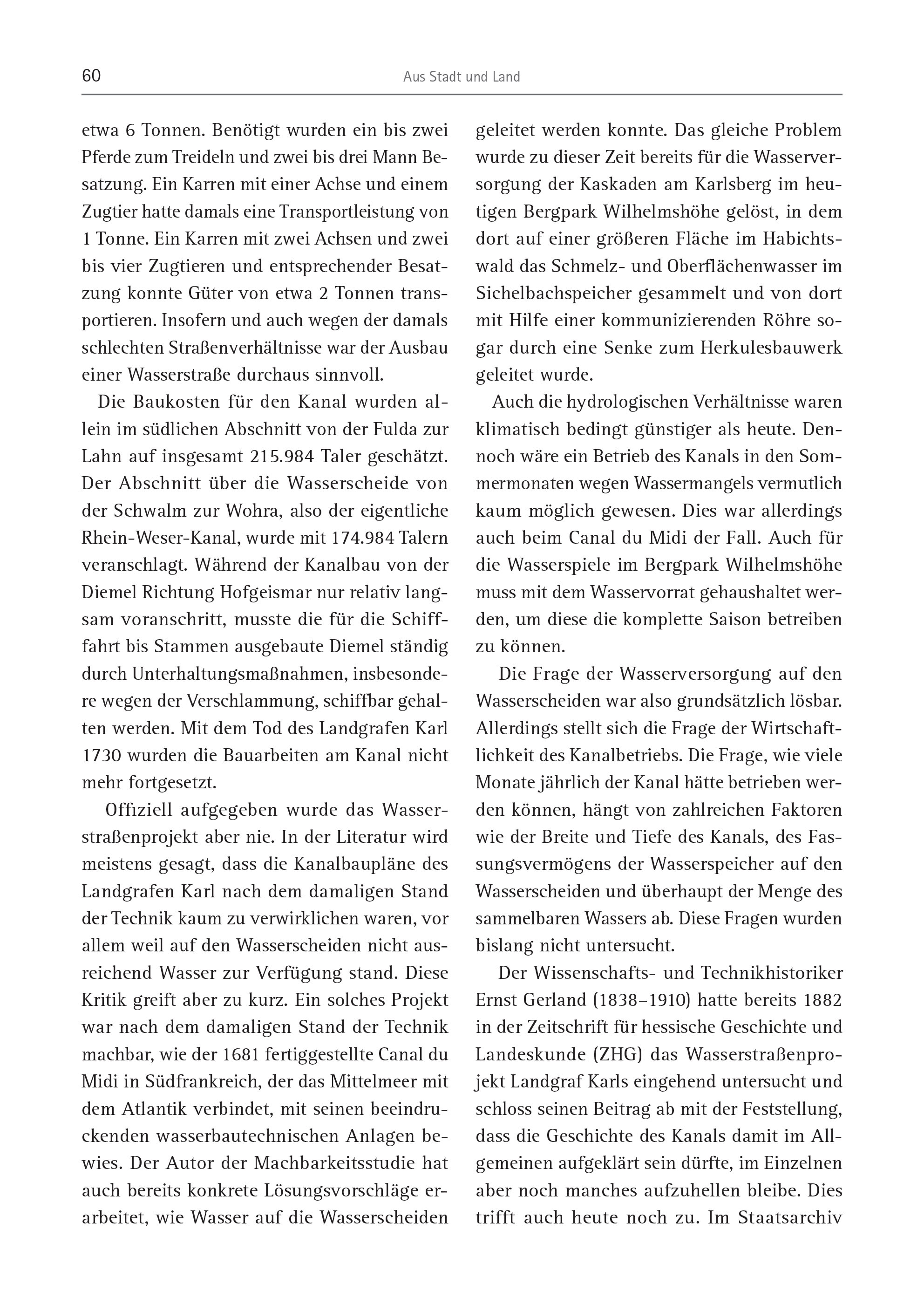 60 Aus Stadt und Land etwa 6 Tonnen. Benötigt wurden ein bis zwei Pferde zum Treideln und zwei bis drei Mann Besatzung. Ein Karren mit einer Achse und einem Zugtier hatte damals eine Transportleistung von 1 Tonne. Ein Karren mit zwei Achsen und zwei bis vier Zugtieren und entsprechender Besatzung konnte Güter von etwa 2 Tonnen transportieren. Insofern und auch wegen der damals schlechten Straßenverhältnisse war der Ausbau einer Wasserstraße durchaus sinnvoll. Die Baukosten für den Kanal wurden allein im südlichen Abschnitt von der Fulda zur Lahn auf insgesamt 215.984 Taler geschätzt. Der Abschnitt über die Wasserscheide von der Schwalm zur Wohra, also der eigentliche Rhein-Weser-Kanal, wurde mit 174.984 Talern veranschlagt. Während der Kanalbau von der Diemel Richtung Hofgeismar nur relativ langsam voranschritt, musste die für die Schifffahrt bis Stammen ausgebaute Diemel ständig durch Unterhaltungsmaßnahmen, insbesondere wegen der Verschlammung, schiffbar gehalten werden. Mit dem Tod des Landgrafen Karl 1730 wurden die Bauarbeiten am Kanal nicht mehr fortgesetzt. Offiziell aufgegeben wurde das Wasserstraßenprojekt aber nie. In der Literatur wird meistens gesagt, dass die Kanalbaupläne des Landgrafen Karl nach dem damaligen Stand der Technik kaum zu verwirklichen waren, vor allem weil auf den Wasserscheiden nicht ausreichend Wasser zur Verfügung stand. Diese Kritik greift aber zu kurz. Ein solches Projekt war nach dem damaligen Stand der Technik machbar, wie der 1681 fertiggestellte Canal du Midi in Südfrankreich, der das Mittelmeer mit dem Atlantik verbindet, mit seinen beeindruckenden wasserbautechnischen Anlagen bewies. Der Autor der Machbarkeitsstudie hat auch bereits konkrete Lösungsvorschläge erarbeitet, wie Wasser auf die Wasserscheiden geleitet werden konnte. Das gleiche Problem wurde zu dieser Zeit bereits für die Wasserversorgung der Kaskaden am Karlsberg im heutigen Bergpark Wilhelmshöhe gelöst, in dem dort auf einer größeren Fläche im Habichtswald das Schmelz- und Oberflächenwasser im Sichelbachspeicher gesammelt und von dort mit Hilfe einer kommunizierenden Röhre sogar durch eine Senke zum Herkulesbauwerk geleitet wurde. Auch die hydrologischen Verhältnisse waren klimatisch bedingt günstiger als heute. Dennoch wäre ein Betrieb des Kanals in den Sommermonaten wegen Wassermangels vermutlich kaum möglich gewesen. Dies war allerdings auch beim Canal du Midi der Fall. Auch für die Wasserspiele im Bergpark Wilhelmshöhe muss mit dem Wasservorrat gehaushaltet werden, um diese die komplette Saison betreiben zu können. Die Frage der Wasserversorgung auf den Wasserscheiden war also grundsätzlich lösbar. Allerdings stellt sich die Frage der Wirtschaftlichkeit des Kanalbetriebs. Die Frage, wie viele Monate jährlich der Kanal hätte betrieben werden können, hängt von zahlreichen Faktoren wie der Breite und Tiefe des Kanals, des Fassungsvermögens der Wasserspeicher auf den Wasserscheiden und überhaupt der Menge des sammelbaren Wassers ab. Diese Fragen wurden bislang nicht untersucht. Der Wissenschafts- und Technikhistoriker Ernst Gerland (1838–1910) hatte bereits 1882 in der Zeitschrift für hessische Geschichte und Landeskunde (ZHG) das Wasserstraßenprojekt Landgraf Karls eingehend untersucht und schloss seinen Beitrag ab mit der Feststellung, dass die Geschichte des Kanals damit im Allgemeinen aufgeklärt sein dürfte, im Einzelnen aber noch manches aufzuhellen bleibe. Dies trifft auch heute noch zu. Im Staatsarchiv