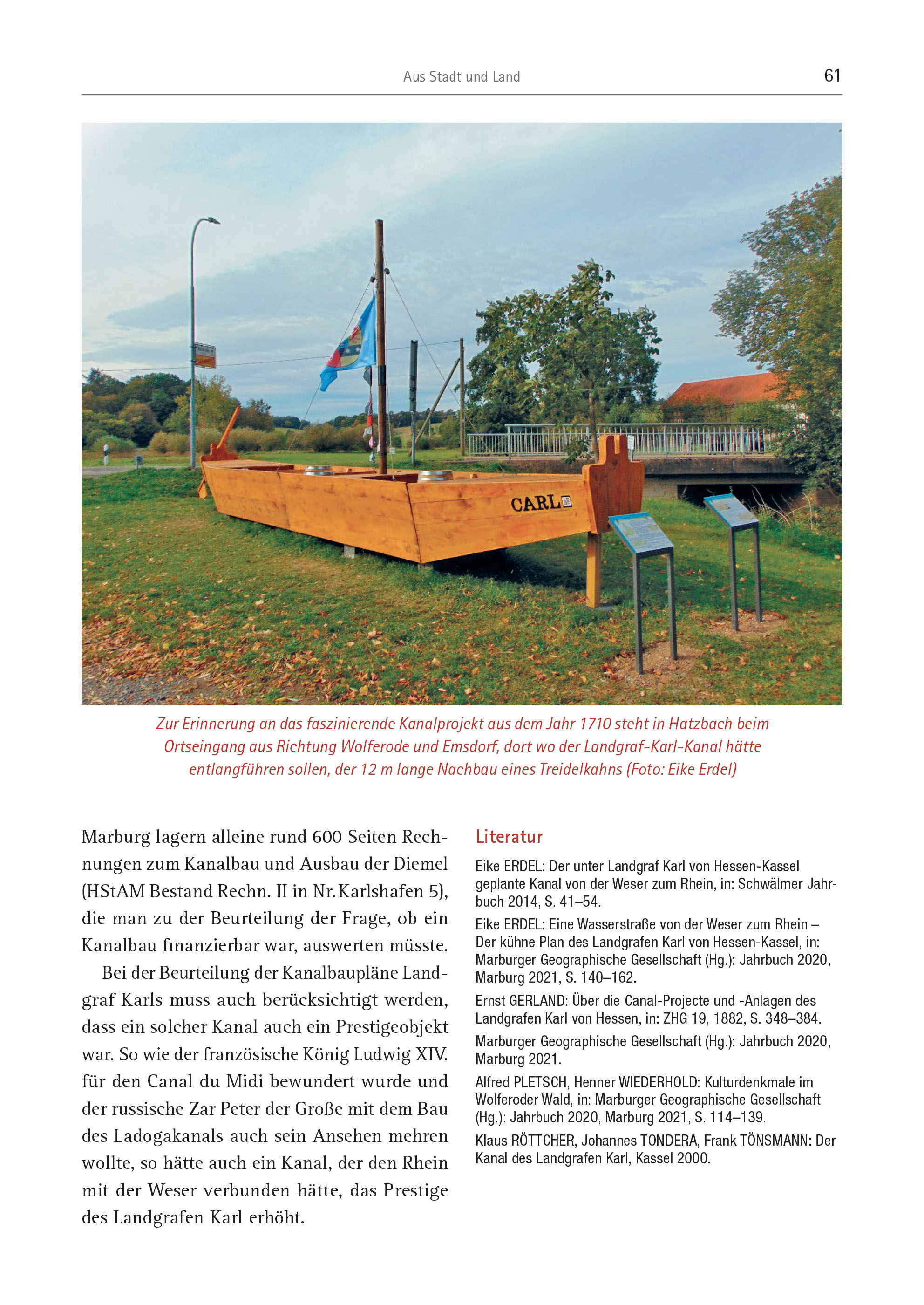 Aus Stadt und Land 61 Marburg lagern alleine rund 600 Seiten Rechnungen zum Kanalbau und Ausbau der Diemel (HStAM Bestand Rechn. II in Nr. Karlshafen 5), die man zu der Beurteilung der Frage, ob ein Kanalbau finanzierbar war, auswerten müsste. Bei der Beurteilung der Kanalbaupläne Landgraf Karls muss auch berücksichtigt werden, dass ein solcher Kanal auch ein Prestigeobjekt war. So wie der französische König Ludwig XIV. für den Canal du Midi bewundert wurde und der russische Zar Peter der Große mit dem Bau des Ladogakanals auch sein Ansehen mehren wollte, so hätte auch ein Kanal, der den Rhein mit der Weser verbunden hätte, das Prestige des Landgrafen Karl erhöht. Literatur Eike ERDEL: Der unter Landgraf Karl von Hessen-Kassel geplante Kanal von der Weser zum Rhein, in: Schwälmer Jahrbuch 2014, S. 41–54. Eike ERDEL: Eine Wasserstraße von der Weser zum Rhein – Der kühne Plan des Landgrafen Karl von Hessen-Kassel, in: Marburger Geographische Gesellschaft (Hg.): Jahrbuch 2020, Marburg 2021, S. 140–162. Ernst GERLAND: Über die Canal-Projecte und -Anlagen des Landgrafen Karl von Hessen, in: ZHG 19, 1882, S. 348–384. Marburger Geographische Gesellschaft (Hg.): Jahrbuch 2020, Marburg 2021. Alfred PLETSCH, Henner WIEDERHOLD: Kulturdenkmale im Wolferoder Wald, in: Marburger Geographische Gesellschaft (Hg.): Jahrbuch 2020, Marburg 2021, S. 114–139. Klaus RÖTTCHER, Johannes TONDERA, Frank TÖNSMANN: Der Kanal des Landgrafen Karl, Kassel 2000. Zur Erinnerung an das faszinierende Kanalprojekt aus dem Jahr 1710 steht in Hatzbach beim Ortseingang aus Richtung Wolferode und Emsdorf, dort wo der Landgraf-Karl-Kanal hätte entlangführen sollen, der 12 m lange Nachbau eines Treidelkahns (Foto: Eike Erdel)