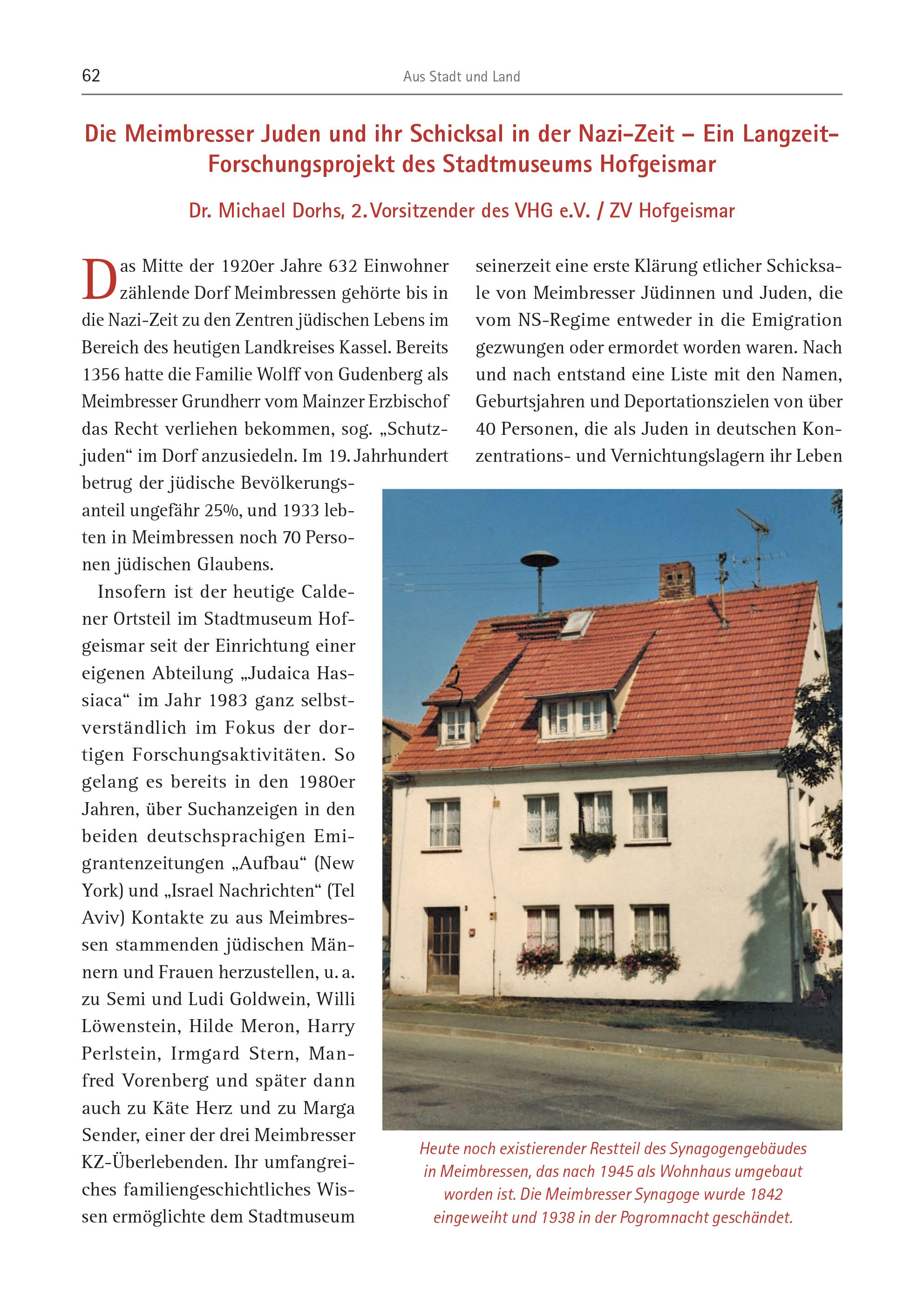62 Aus Stadt und Land Das Mitte der 1920er Jahre 632 Einwohner zählende Dorf Meimbressen gehörte bis in die Nazi-Zeit zu den Zentren jüdischen Lebens im Bereich des heutigen Landkreises Kassel. Bereits 1356 hatte die Familie Wolff von Gudenberg als Meimbresser Grundherr vom Mainzer Erzbischof das Recht verliehen bekommen, sog. „Schutzjuden“ im Dorf anzusiedeln. Im 19. Jahrhundert betrug der jüdische Bevölkerungsanteil ungefähr 25%, und 1933 lebten in Meimbressen noch 70 Personen jüdischen Glaubens. Insofern ist der heutige Caldener Ortsteil im Stadtmuseum Hofgeismar seit der Einrichtung einer eigenen Abteilung „Judaica Hassiaca“ im Jahr 1983 ganz selbstverständlich im Fokus der dortigen Forschungsaktivitäten. So gelang es bereits in den 1980er Jahren, über Suchanzeigen in den beiden deutschsprachigen Emigrantenzeitungen „Aufbau“ (New York) und „Israel Nachrichten“ (Tel Aviv) Kontakte zu aus Meimbressen stammenden jüdischen Männern und Frauen herzustellen, u. a. zu Semi und Ludi Goldwein, Willi Löwenstein, Hilde Meron, Harry Perlstein, Irmgard Stern, Manfred Vorenberg und später dann auch zu Käte Herz und zu Marga Sender, einer der drei Meimbresser KZ-Überlebenden. Ihr umfangreiches familiengeschichtliches Wissen ermöglichte dem Stadtmuseum seinerzeit eine erste Klärung etlicher Schicksale von Meimbresser Jüdinnen und Juden, die vom NS-Regime entweder in die Emigration gezwungen oder ermordet worden waren. Nach und nach entstand eine Liste mit den Namen, Geburtsjahren und Deportationszielen von über 40 Personen, die als Juden in deutschen Konzentrations- und Vernichtungslagern ihr Leben Die Meimbresser Juden und ihr Schicksal in der Nazi-Zeit – Ein Langzeit- Forschungsprojekt des Stadtmuseums Hofgeismar Dr. Michael Dorhs, 2. Vorsitzender des VHG e.V. / ZV Hofgeismar Heute noch existierender Restteil des Synagogengebäudes in Meimbressen, das nach 1945 als Wohnhaus umgebaut worden ist. Die Meimbresser Synagoge wurde 1842 eingeweiht und 1938 in der Pogromnacht geschändet.