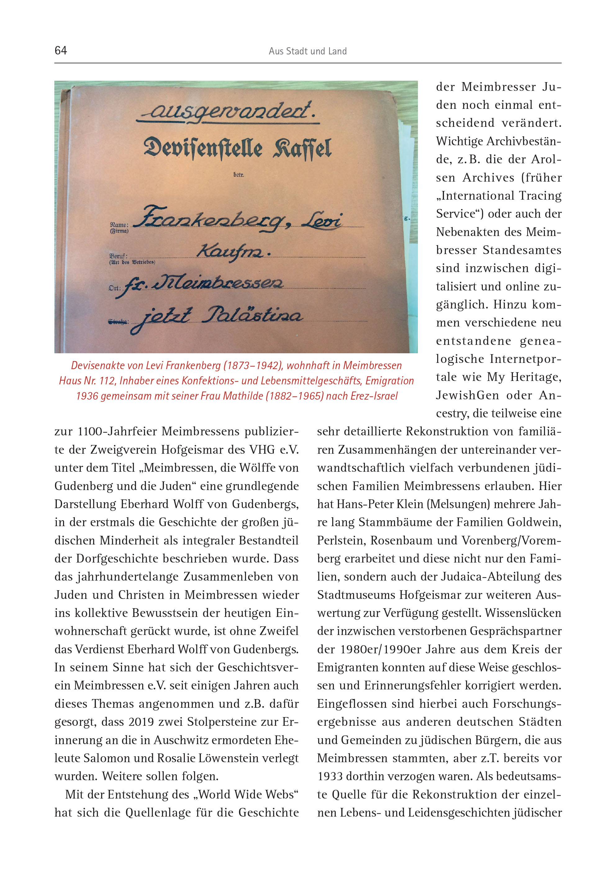 64 Aus Stadt und Land zur 1100-Jahrfeier Meimbressens publizierte der Zweigverein Hofgeismar des VHG e.V. unter dem Titel „Meimbressen, die Wölffe von Gudenberg und die Juden“ eine grundlegende Darstellung Eberhard Wolff von Gudenbergs, in der erstmals die Geschichte der großen jüdischen Minderheit als integraler Bestandteil der Dorfgeschichte beschrieben wurde. Dass das jahrhundertelange Zusammenleben von Juden und Christen in Meimbressen wieder ins kollektive Bewusstsein der heutigen Einwohnerschaft gerückt wurde, ist ohne Zweifel das Verdienst Eberhard Wolff von Gudenbergs. In seinem Sinne hat sich der Geschichtsverein Meimbressen e.V. seit einigen Jahren auch dieses Themas angenommen und z.B. dafür gesorgt, dass 2019 zwei Stolpersteine zur Erinnerung an die in Auschwitz ermordeten Eheleute Salomon und Rosalie Löwenstein verlegt wurden. Weitere sollen folgen. Mit der Entstehung des „World Wide Webs“ hat sich die Quellenlage für die Geschichte der Meimbresser Juden noch einmal entscheidend verändert. Wichtige Archivbestände, z. B. die der Arolsen Archives (früher „International Tracing Service“) oder auch der Nebenakten des Meimbresser Standesamtes sind inzwischen digitalisiert und online zugänglich. Hinzu kommen verschiedene neu entstandene genealogische Internetportale wie My Heritage, JewishGen oder Ancestry, die teilweise eine sehr detaillierte Rekonstruktion von familiären Zusammenhängen der untereinander verwandtschaftlich vielfach verbundenen jüdischen Familien Meimbressens erlauben. Hier hat Hans-Peter Klein (Melsungen) mehrere Jahre lang Stammbäume der Familien Goldwein, Perlstein, Rosenbaum und Vorenberg/Voremberg erarbeitet und diese nicht nur den Familien, sondern auch der Judaica-Abteilung des Stadtmuseums Hofgeismar zur weiteren Auswertung zur Verfügung gestellt. Wissenslücken der inzwischen verstorbenen Gesprächspartner der 1980er/1990er Jahre aus dem Kreis der Emigranten konnten auf diese Weise geschlossen und Erinnerungsfehler korrigiert werden. Eingeflossen sind hierbei auch Forschungsergebnisse aus anderen deutschen Städten und Gemeinden zu jüdischen Bürgern, die aus Meimbressen stammten, aber z.T. bereits vor 1933 dorthin verzogen waren. Als bedeutsamste Quelle für die Rekonstruktion der einzelnen Lebens- und Leidensgeschichten jüdischer Devisenakte von Levi Frankenberg (1873–1942), wohnhaft in Meimbressen Haus Nr. 112, Inhaber eines Konfektions- und Lebensmittelgeschäfts, Emigration 1936 gemeinsam mit seiner Frau Mathilde (1882–1965) nach Erez-Israel