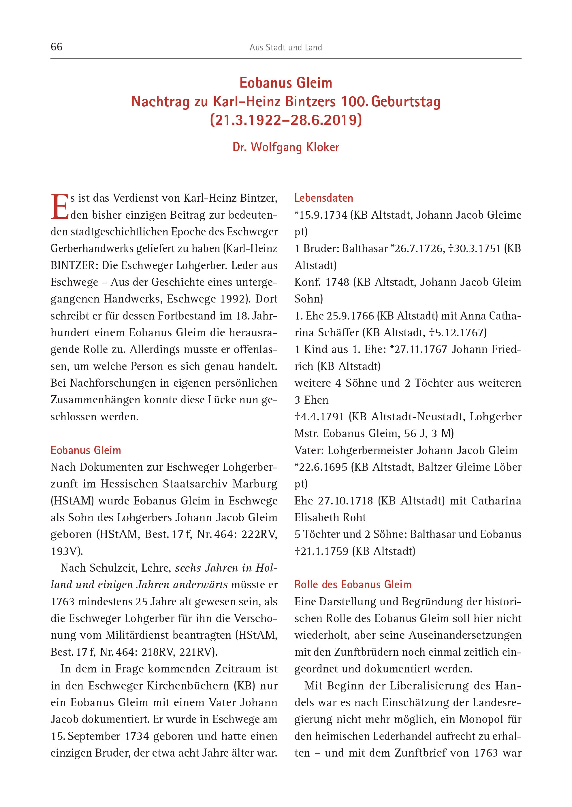 66 Aus Stadt und Land Es ist das Verdienst von Karl-Heinz Bintzer, den bisher einzigen Beitrag zur bedeutenden stadtgeschichtlichen Epoche des Eschweger Gerberhandwerks geliefert zu haben (Karl-Heinz BINTZER: Die Eschweger Lohgerber. Leder aus Eschwege – Aus der Geschichte eines untergegangenen Handwerks, Eschwege 1992). Dort schreibt er für dessen Fortbestand im 18. Jahrhundert einem Eobanus Gleim die herausragende Rolle zu. Allerdings musste er offenlassen, um welche Person es sich genau handelt. Bei Nachforschungen in eigenen persönlichen Zusammenhängen konnte diese Lücke nun geschlossen werden. Eobanus Gleim Nach Dokumenten zur Eschweger Lohgerberzunft im Hessischen Staatsarchiv Marburg (HStAM) wurde Eobanus Gleim in Eschwege als Sohn des Lohgerbers Johann Jacob Gleim geboren (HStAM, Best. 17 f, Nr. 464: 222RV, 193V). Nach Schulzeit, Lehre, sechs Jahren in Holland und einigen Jahren anderwärts müsste er 1763 mindestens 25 Jahre alt gewesen sein, als die Eschweger Lohgerber für ihn die Verschonung vom Militärdienst beantragten (HStAM, Best. 17 f, Nr. 464: 218RV, 221RV). In dem in Frage kommenden Zeitraum ist in den Eschweger Kirchenbüchern (KB) nur ein Eobanus Gleim mit einem Vater Johann Jacob dokumentiert. Er wurde in Eschwege am 15. September 1734 geboren und hatte einen einzigen Bruder, der etwa acht Jahre älter war. Lebensdaten *15.9.1734 (KB Altstadt, Johann Jacob Gleime pt) 1 Bruder: Balthasar *26.7.1726, †30.3.1751 (KB Altstadt) Konf. 1748 (KB Altstadt, Johann Jacob Gleim Sohn) 1. Ehe 25.9.1766 (KB Altstadt) mit Anna Catharina Schäffer (KB Altstadt, †5.12.1767) 1 Kind aus 1. Ehe: *27.11.1767 Johann Friedrich (KB Altstadt) weitere 4 Söhne und 2 Töchter aus weiteren 3 Ehen †4.4.1791 (KB Altstadt-Neustadt, Lohgerber Mstr. Eobanus Gleim, 56 J, 3 M) Vater: Lohgerbermeister Johann Jacob Gleim *22.6.1695 (KB Altstadt, Baltzer Gleime Löber pt) Ehe 27.10.1718 (KB Altstadt) mit Catharina Elisabeth Roht 5 Töchter und 2 Söhne: Balthasar und Eobanus †21.1.1759 (KB Altstadt) Rolle des Eobanus Gleim Eine Darstellung und Begründung der historischen Rolle des Eobanus Gleim soll hier nicht wiederholt, aber seine Auseinandersetzungen mit den Zunftbrüdern noch einmal zeitlich eingeordnet und dokumentiert werden. Mit Beginn der Liberalisierung des Handels war es nach Einschätzung der Landesregierung nicht mehr möglich, ein Monopol für den heimischen Lederhandel aufrecht zu erhalten – und mit dem Zunftbrief von 1763 war Eobanus Gleim Nachtrag zu Karl-Heinz Bintzers 100. Geburtstag (21.3.1922–28.6.2019) Dr. Wolfgang Kloker