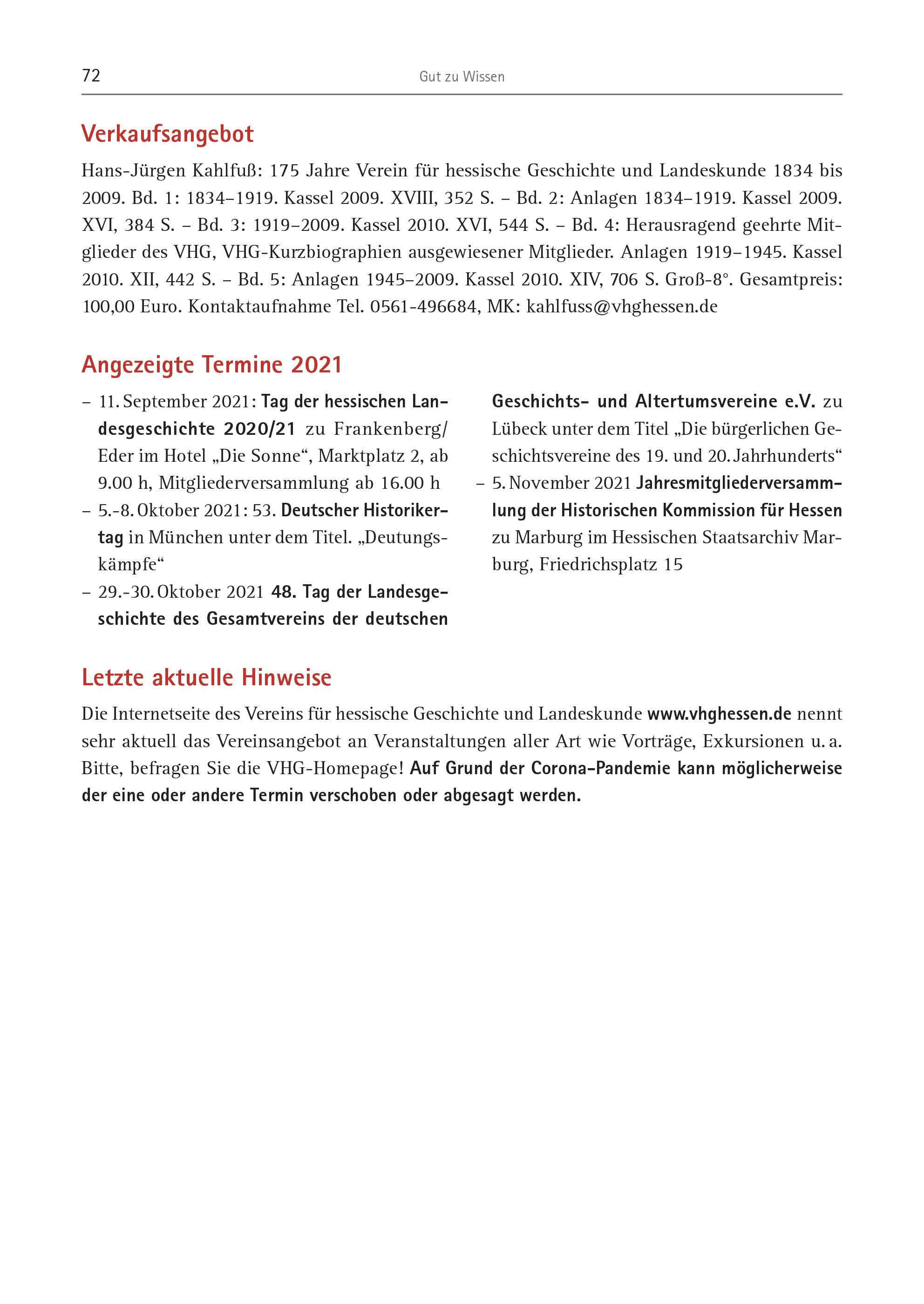 72 Gut zu Wissen – 11. September 2021: Tag der hessischen Landesgeschichte 2020/21 zu Frankenberg/ Eder im Hotel „Die Sonne“, Marktplatz 2, ab 9.00 h, Mitgliederversammlung ab 16.00 h – 5.-8. Oktober 2021: 53. Deutscher Historikertag in München unter dem Titel. „Deutungskämpfe“ – 29.-30. Oktober 2021 48. Tag der Landesgeschichte des Gesamtvereins der deutschen Geschichts- und Altertumsvereine e.V. zu Lübeck unter dem Titel „Die bürgerlichen Geschichtsvereine des 19. und 20. Jahrhunderts“ – 5. November 2021 Jahresmitgliederversammlung der Historischen Kommission für Hessen zu Marburg im Hessischen Staatsarchiv Marburg, Friedrichsplatz 15 Angezeigte Termine 2021 Die Internetseite des Vereins für hessische Geschichte und Landeskunde www.vhghessen.de nennt sehr aktuell das Vereinsangebot an Veranstaltungen aller Art wie Vorträge, Exkursionen u. a. Bitte, befragen Sie die VHG-Homepage! Auf Grund der Corona-Pandemie kann möglicherweise der eine oder andere Termin verschoben oder abgesagt werden. Hans-Jürgen Kahlfuß: 175 Jahre Verein für hessische Geschichte und Landeskunde 1834 bis 2009. Bd. 1: 1834–1919. Kassel 2009. XVIII, 352 S. – Bd. 2: Anlagen 1834–1919. Kassel 2009. XVI, 384 S. – Bd. 3: 1919–2009. Kassel 2010. XVI, 544 S. – Bd. 4: Herausragend geehrte Mitglieder des VHG, VHG-Kurzbiographien ausgewiesener Mitglieder. Anlagen 1919–1945. Kassel 2010. XII, 442 S. – Bd. 5: Anlagen 1945–2009. Kassel 2010. XIV, 706 S. Groß-8°. Gesamtpreis: 100,00 Euro. Kontaktaufnahme Tel. 0561-496684, MK: kahlfuss@vhghessen.de Letzte aktuelle Hinweise Verkaufsangebot