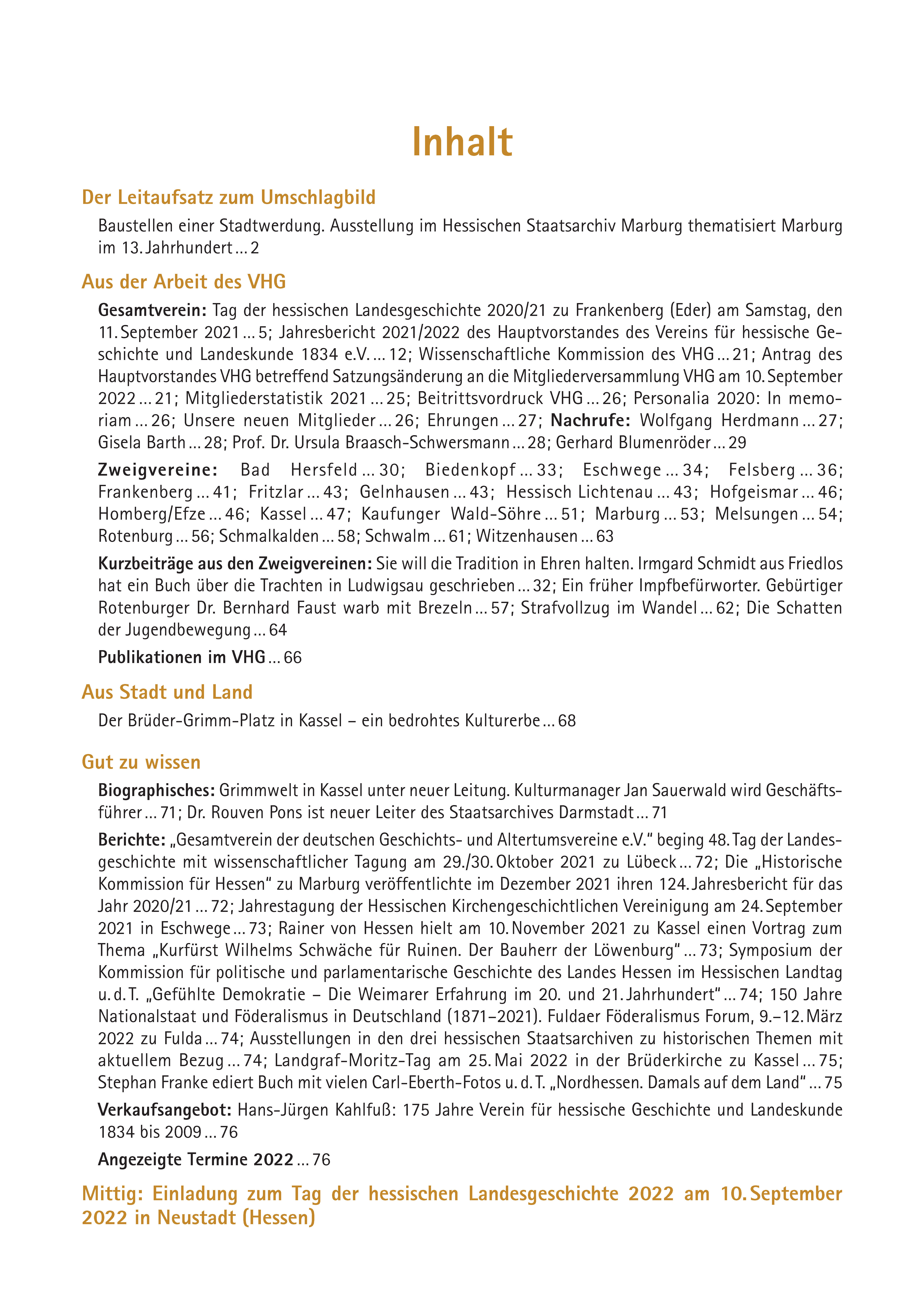 Inhalt Der Leitaufsatz zum Umschlagbild Baustellen einer Stadtwerdung. Ausstellung im Hessischen Staatsarchiv Marburg thematisiert Marburg im 13. Jahrhundert … 2 Aus der Arbeit des VHG Gesamtverein: Tag der hessischen Landesgeschichte 2020/21 zu Frankenberg (Eder) am Samstag, den 11. September 2021 … 5; Jahresbericht 2021/2022 des Hauptvorstandes des Vereins für hessische Geschichte und Landeskunde 1834 e.V. … 12; Wissenschaftliche Kommission des VHG … 21; Antrag des Hauptvorstandes VHG betreffend Satzungsänderung an die Mitgliederversammlung VHG am 10. September 2022 … 21; Mitgliederstatistik 2021 … 25; Beitrittsvordruck VHG … 26; Personalia 2020: In memoriam … 26; Unsere neuen Mitglieder … 26; Ehrungen … 27; Nachrufe: Wolfgang Herdmann … 27; Gisela Barth … 28; Prof. Dr. Ursula Braasch-Schwersmann … 28; Gerhard Blumenröder … 29 Zweigvereine: Bad Hersfeld … 30; Biedenkopf … 33; Eschwege … 34; Felsberg … 36; Frankenberg … 41; Fritzlar … 43; Gelnhausen … 43; Hessisch Lichtenau … 43; Hofgeismar … 46; Homberg/ Efze … 46; Kassel … 47; Kaufunger Wald-Söhre … 51; Marburg … 53; Melsungen … 54; Rotenburg … 56; Schmalkalden … 58; Schwalm … 61; Witzenhausen … 63 Kurzbeiträge aus den Zweigvereinen: Sie will die Tradition in Ehren halten. Irmgard Schmidt aus Friedlos hat ein Buch über die Trachten in Ludwigsau geschrieben … 32; Ein früher Impfbefürworter. Gebürtiger Rotenburger Dr. Bernhard Faust warb mit Brezeln … 57; Strafvollzug im Wandel … 62; Die Schatten der Jugendbewegung … 64 Publikationen im VHG … 66 Aus Stadt und Land Der Brüder-Grimm-Platz in Kassel – ein bedrohtes Kulturerbe … 68 Gut zu wissen Biographisches: Grimmwelt in Kassel unter neuer Leitung. Kulturmanager Jan Sauerwald wird Geschäftsführer … 71; Dr. Rouven Pons ist neuer Leiter des Staatsarchives Darmstadt … 71 Berichte: „Gesamtverein der deutschen Geschichts- und Altertumsvereine e.V.“ beging 48. Tag der Landesgeschichte mit wissenschaftlicher Tagung am 29./30. Oktober 2021 zu Lübeck … 72; Die „Historische Kommission für Hessen“ zu Marburg veröffentlichte im Dezember 2021 ihren 124. Jahresbericht für das Jahr 2020/21 … 72; Jahrestagung der Hessischen Kirchengeschichtlichen Vereinigung am 24. September 2021 in Eschwege … 73; Rainer von Hessen hielt am 10. November 2021 zu Kassel einen Vortrag zum Thema „Kurfürst Wilhelms Schwäche für Ruinen. Der Bauherr der Löwenburg“ … 73; Symposium der Kommission für politische und parlamentarische Geschichte des Landes Hessen im Hessischen Landtag u. d. T. „Gefühlte Demokratie – Die Weimarer Erfahrung im 20. und 21. Jahrhundert“ … 74; 150 Jahre Nationalstaat und Föderalismus in Deutschland (1871–2021). Fuldaer Föderalismus Forum, 9.–12. März 2022 zu Fulda … 74; Ausstellungen in den drei hessischen Staatsarchiven zu historischen Themen mit aktuellem Bezug … 74; Landgraf-Moritz-Tag am 25. Mai 2022 in der Brüderkirche zu Kassel … 75; Stephan Franke ediert Buch mit vielen Carl-Eberth-Fotos u. d. T. „Nordhessen. Damals auf dem Land“ … 75 Verkaufsangebot: Hans-Jürgen Kahlfuß: 175 Jahre Verein für hessische Geschichte und Landeskunde 1834 bis 2009 … 76 Angezeigte Termine 2022 … 76 Mittig: Einladung zum Tag der hessischen Landesgeschichte 2022 am 10. September 2022 in Neustadt (Hessen)