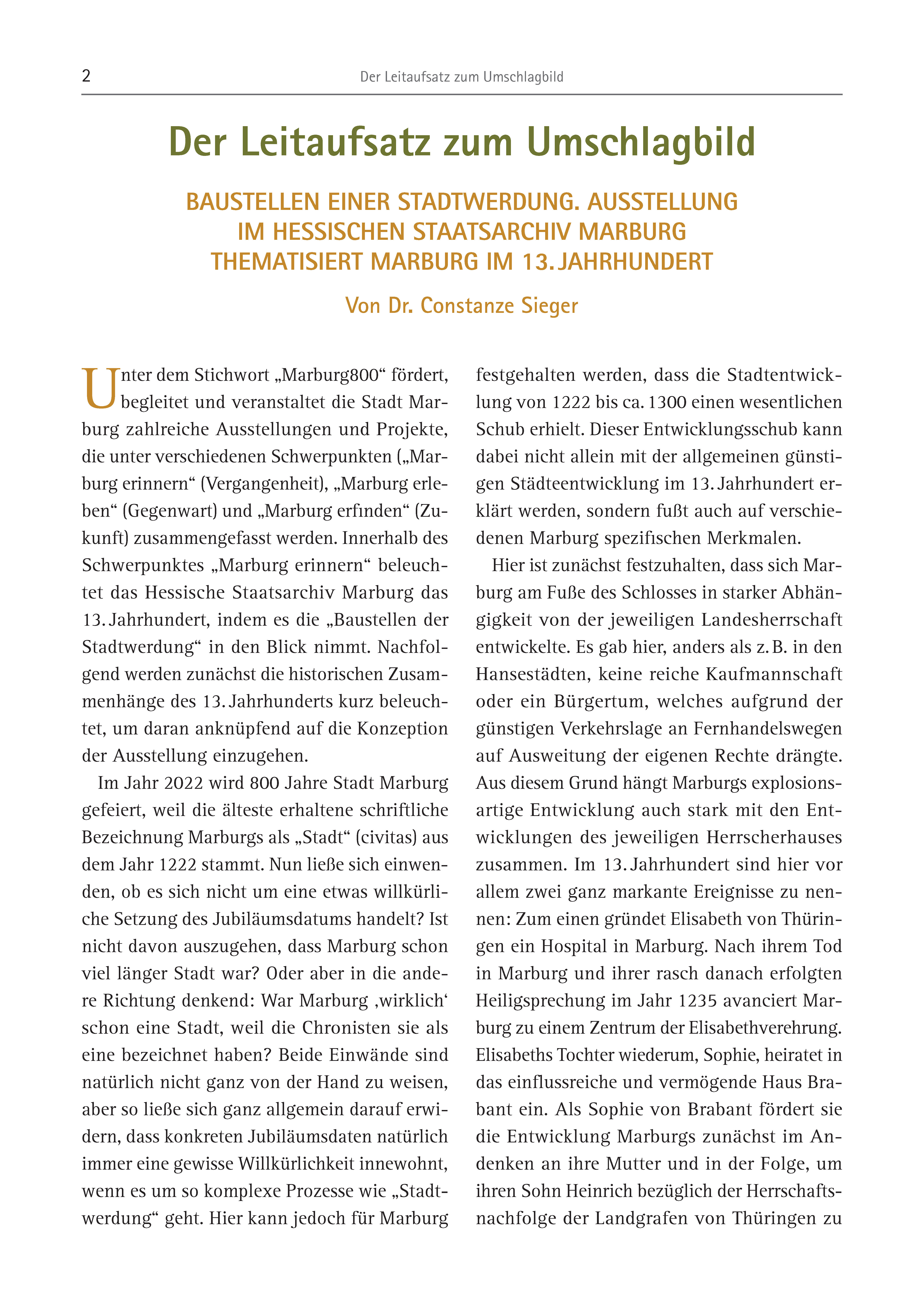 2 Der Leitaufsatz zum Umschlagbild BAUSTELLEN EINER STADTWERDUNG. AUSSTELLUNG IM HESSISCHEN STAATSARCHIV MARBURG THEMATISIERT MARBURG IM 13. JAHRHUNDERT Von Dr. Constanze Sieger Unter dem Stichwort „Marburg800“ fördert, begleitet und veranstaltet die Stadt Marburg zahlreiche Ausstellungen und Projekte, die unter verschiedenen Schwerpunkten („Marburg erinnern“ (Vergangenheit), „Marburg erleben“ (Gegenwart) und „Marburg erfinden“ (Zukunft) zusammengefasst werden. Innerhalb des Schwerpunktes „Marburg erinnern“ beleuchtet das Hessische Staatsarchiv Marburg das 13. Jahrhundert, indem es die „Baustellen der Stadtwerdung“ in den Blick nimmt. Nachfolgend werden zunächst die historischen Zusammenhänge des 13. Jahrhunderts kurz beleuchtet, um daran anknüpfend auf die Konzeption der Ausstellung einzugehen. Im Jahr 2022 wird 800 Jahre Stadt Marburg gefeiert, weil die älteste erhaltene schriftliche Bezeichnung Marburgs als „Stadt“ (civitas) aus dem Jahr 1222 stammt. Nun ließe sich einwenden, ob es sich nicht um eine etwas willkürliche Setzung des Jubiläumsdatums handelt? Ist nicht davon auszugehen, dass Marburg schon viel länger Stadt war? Oder aber in die andere Richtung denkend: War Marburg ‚wirklich‘ schon eine Stadt, weil die Chronisten sie als eine bezeichnet haben? Beide Einwände sind natürlich nicht ganz von der Hand zu weisen, aber so ließe sich ganz allgemein darauf erwidern, dass konkreten Jubiläumsdaten natürlich immer eine gewisse Willkürlichkeit innewohnt, wenn es um so komplexe Prozesse wie „Stadtwerdung“ geht. Hier kann jedoch für Marburg Der Leitaufsatz zum Umschlagbild festgehalten werden, dass die Stadtentwicklung von 1222 bis ca. 1300 einen wesentlichen Schub erhielt. Dieser Entwicklungsschub kann dabei nicht allein mit der allgemeinen günstigen Städteentwicklung im 13. Jahrhundert erklärt werden, sondern fußt auch auf verschiedenen Marburg spezifischen Merkmalen. Hier ist zunächst festzuhalten, dass sich Marburg am Fuße des Schlosses in starker Abhängigkeit von der jeweiligen Landesherrschaft entwickelte. Es gab hier, anders als z. B. in den Hansestädten, keine reiche Kaufmannschaft oder ein Bürgertum, welches aufgrund der günstigen Verkehrslage an Fernhandelswegen auf Ausweitung der eigenen Rechte drängte. Aus diesem Grund hängt Marburgs explosionsartige Entwicklung auch stark mit den Entwicklungen des jeweiligen Herrscherhauses zusammen. Im 13. Jahrhundert sind hier vor allem zwei ganz markante Ereignisse zu nennen: Zum einen gründet Elisabeth von Thüringen ein Hospital in Marburg. Nach ihrem Tod in Marburg und ihrer rasch danach erfolgten Heiligsprechung im Jahr 1235 avanciert Marburg zu einem Zentrum der Elisabethverehrung. Elisabeths Tochter wiederum, Sophie, heiratet in das einflussreiche und vermögende Haus Brabant ein. Als Sophie von Brabant fördert sie die Entwicklung Marburgs zunächst im Andenken an ihre Mutter und in der Folge, um ihren Sohn Heinrich bezüglich der Herrschaftsnachfolge der Landgrafen von Thüringen zu