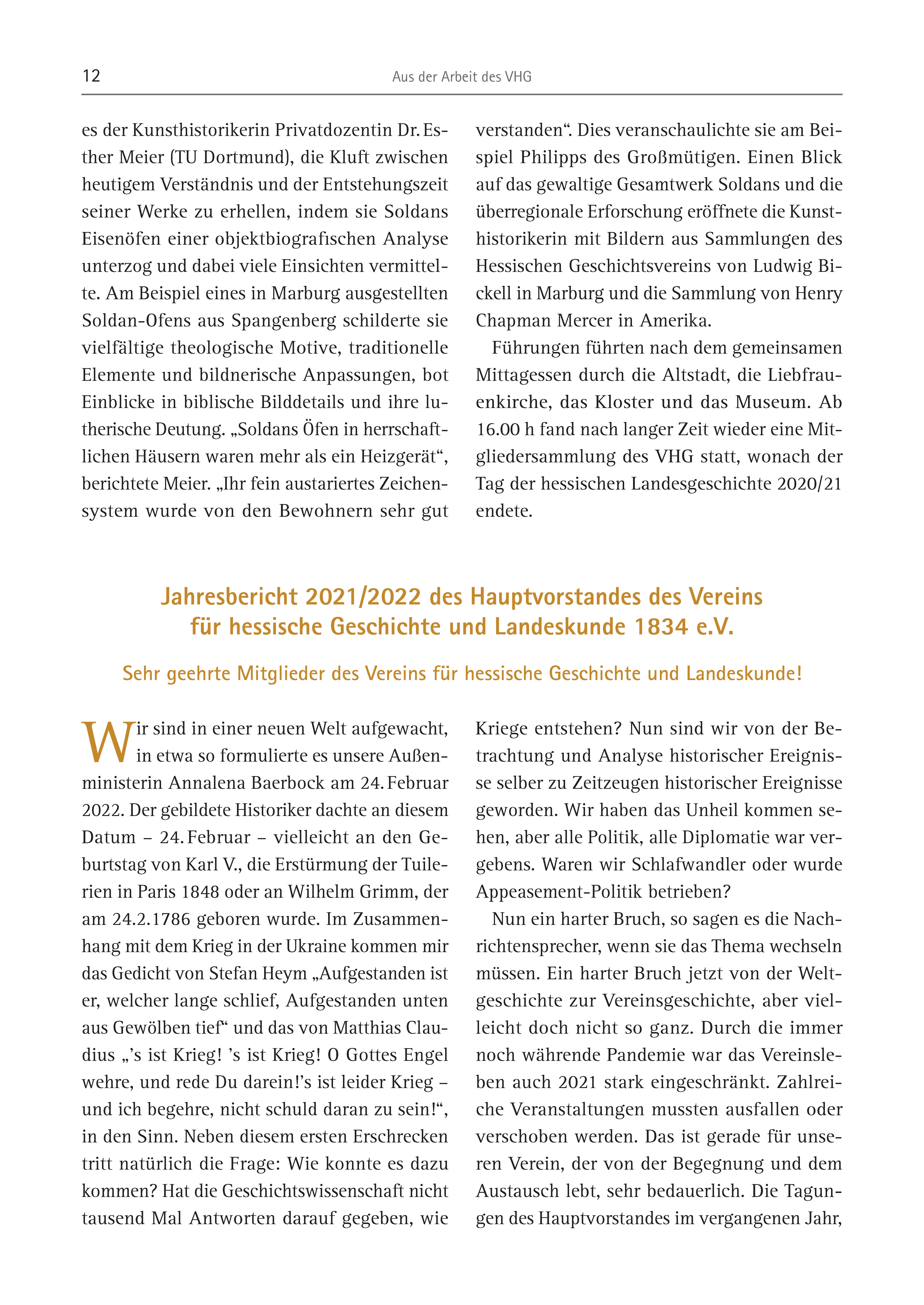 12 Aus der Arbeit des VHG Wir sind in einer neuen Welt aufgewacht, in etwa so formulierte es unsere Außenministerin Annalena Baerbock am 24. Februar 2022. Der gebildete Historiker dachte an diesem Datum – 24. Februar – vielleicht an den Geburtstag von Karl V., die Erstürmung der Tuilerien in Paris 1848 oder an Wilhelm Grimm, der am 24.2.1786 geboren wurde. Im Zusammenhang mit dem Krieg in der Ukraine kommen mir das Gedicht von Stefan Heym „Aufgestanden ist er, welcher lange schlief, Aufgestanden unten aus Gewölben tief“ und das von Matthias Claudius „’s ist Krieg! ’s ist Krieg! O Gottes Engel wehre, und rede Du darein!’s ist leider Krieg – und ich begehre, nicht schuld daran zu sein!“, in den Sinn. Neben diesem ersten Erschrecken tritt natürlich die Frage: Wie konnte es dazu kommen? Hat die Geschichtswissenschaft nicht tausend Mal Antworten darauf gegeben, wie Jahresbericht 2021/2022 des Hauptvorstandes des Vereins für hessische Geschichte und Landeskunde 1834 e.V. Sehr geehrte Mitglieder des Vereins für hessische Geschichte und Landeskunde! Kriege entstehen? Nun sind wir von der Betrachtung und Analyse historischer Ereignisse selber zu Zeitzeugen historischer Ereignisse geworden. Wir haben das Unheil kommen sehen, aber alle Politik, alle Diplomatie war vergebens. Waren wir Schlafwandler oder wurde Appeasement-Politik betrieben? Nun ein harter Bruch, so sagen es die Nachrichtensprecher, wenn sie das Thema wechseln müssen. Ein harter Bruch jetzt von der Weltgeschichte zur Vereinsgeschichte, aber vielleicht doch nicht so ganz. Durch die immer noch währende Pandemie war das Vereinsleben auch 2021 stark eingeschränkt. Zahlreiche Veranstaltungen mussten ausfallen oder verschoben werden. Das ist gerade für unseren Verein, der von der Begegnung und dem Austausch lebt, sehr bedauerlich. Die Tagungen des Hauptvorstandes im vergangenen Jahr, es der Kunsthistorikerin Privatdozentin Dr. Esther Meier (TU Dortmund), die Kluft zwischen heutigem Verständnis und der Entstehungszeit seiner Werke zu erhellen, indem sie Soldans Eisenöfen einer objektbiografischen Analyse unterzog und dabei viele Einsichten vermittelte. Am Beispiel eines in Marburg ausgestellten Soldan-Ofens aus Spangenberg schilderte sie vielfältige theologische Motive, traditionelle Elemente und bildnerische Anpassungen, bot Einblicke in biblische Bilddetails und ihre lutherische Deutung. „Soldans Öfen in herrschaftlichen Häusern waren mehr als ein Heizgerät“, berichtete Meier. „Ihr fein austariertes Zeichensystem wurde von den Bewohnern sehr gut verstanden“. Dies veranschaulichte sie am Beispiel Philipps des Großmütigen. Einen Blick auf das gewaltige Gesamtwerk Soldans und die überregionale Erforschung eröffnete die Kunsthistorikerin mit Bildern aus Sammlungen des Hessischen Geschichtsvereins von Ludwig Bickell in Marburg und die Sammlung von Henry Chapman Mercer in Amerika. Führungen führten nach dem gemeinsamen Mittagessen durch die Altstadt, die Liebfrauenkirche, das Kloster und das Museum. Ab 16.00 h fand nach langer Zeit wieder eine Mitgliedersammlung des VHG statt, wonach der Tag der hessischen Landesgeschichte 2020/21 endete.