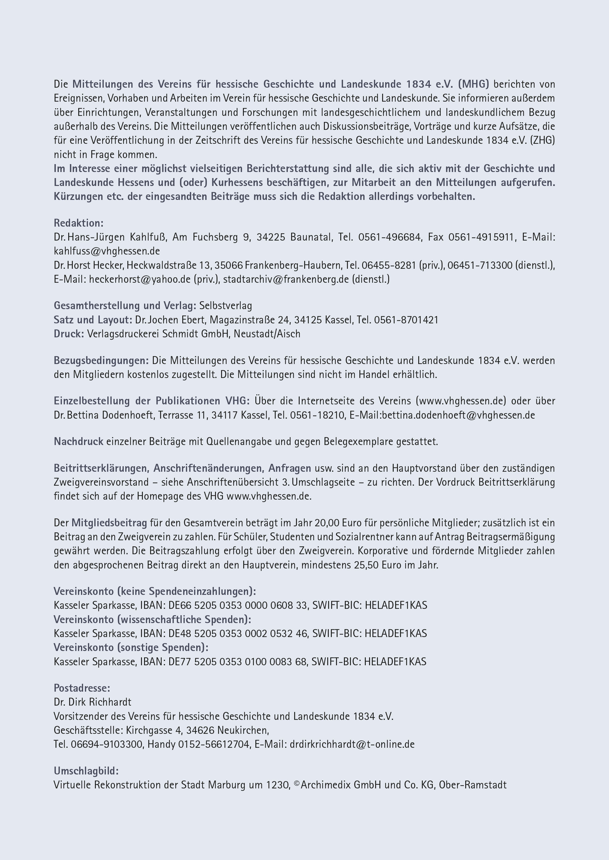 Die Mitteilungen des Vereins für hessische Geschichte und Landeskunde 1834 e.V. (MHG) berichten von Ereignissen, Vorhaben und Arbeiten im Verein für hessische Geschichte und Landeskunde. Sie informieren außerdem über Einrichtungen, Veranstaltungen und Forschungen mit landesgeschichtlichem und landeskundlichem Bezug außerhalb des Vereins. Die Mitteilungen veröffentlichen auch Diskussionsbeiträge, Vorträge und kurze Aufsätze, die für eine Veröffentlichung in der Zeitschrift des Vereins für hessische Geschichte und Landeskunde 1834 e.V. (ZHG) nicht in Frage kommen. Im Interesse einer möglichst vielseitigen Berichterstattung sind alle, die sich aktiv mit der Geschichte und Landeskunde Hessens und (oder) Kurhessens beschäftigen, zur Mitarbeit an den Mitteilungen aufgerufen. Kürzungen etc. der eingesandten Beiträge muss sich die Redaktion allerdings vorbehalten. Redaktion: Dr. Hans-Jürgen Kahlfuß, Am Fuchsberg 9, 34225 Baunatal, Tel. 0561-496684, Fax 0561-4915911, E-Mail: kahlfuss@vhghessen.de Dr. Horst Hecker, Heckwaldstraße 13, 35066 Frankenberg-Haubern, Tel. 06455-8281 (priv.), 06451-713300 (dienstl.), E-Mail: heckerhorst@yahoo.de (priv.), stadtarchiv@frankenberg.de (dienstl.) Gesamtherstellung und Verlag: Selbstverlag Satz und Layout: Dr. Jochen Ebert, Magazinstraße 24, 34125 Kassel, Tel. 0561-8701421 Druck: Verlagsdruckerei Schmidt GmbH, Neustadt/Aisch Bezugsbedingungen: Die Mitteilungen des Vereins für hessische Geschichte und Landeskunde 1834 e.V. werden den Mitgliedern kostenlos zugestellt. Die Mitteilungen sind nicht im Handel erhältlich. Einzelbestellung der Publikationen VHG: Über die Internetseite des Vereins (www.vhghessen.de) oder über Dr. Bettina Dodenhoeft, Terrasse 11, 34117 Kassel, Tel. 0561-18210, E-Mail:bettina.dodenhoeft@vhghessen.de Nachdruck einzelner Beiträge mit Quellenangabe und gegen Belegexemplare gestattet. Beitrittserklärungen, Anschriftenänderungen, Anfragen usw. sind an den Hauptvorstand über den zuständigen Zweigvereinsvorstand – siehe Anschriftenübersicht 3. Umschlagseite – zu richten. Der Vordruck Beitrittserklärung findet sich auf der Homepage des VHG www.vhghessen.de. Der Mitgliedsbeitrag für den Gesamtverein beträgt im Jahr 20,00 Euro für persönliche Mitglieder; zusätzlich ist ein Beitrag an den Zweigverein zu zahlen. Für Schüler, Studenten und Sozialrentner kann auf Antrag Beitragsermäßigung gewährt werden. Die Beitragszahlung erfolgt über den Zweigverein. Korporative und fördernde Mitglieder zahlen den abgesprochenen Beitrag direkt an den Hauptverein, mindestens 25,50 Euro im Jahr. Vereinskonto (keine Spendeneinzahlungen): Kasseler Sparkasse, IBAN: DE66 5205 0353 0000 0608 33, SWIFT-BIC: HELADEF1KAS Vereinskonto (wissenschaftliche Spenden): Kasseler Sparkasse, IBAN: DE48 5205 0353 0002 0532 46, SWIFT-BIC: HELADEF1KAS Vereinskonto (sonstige Spenden): Kasseler Sparkasse, IBAN: DE77 5205 0353 0100 0083 68, SWIFT-BIC: HELADEF1KAS Postadresse: Dr. Dirk Richhardt Vorsitzender des Vereins für hessische Geschichte und Landeskunde 1834 e.V. Geschäftsstelle: Kirchgasse 4, 34626 Neukirchen, Tel. 06694-9103300, Handy 0152-56612704, E-Mail: drdirkrichhardt@t-online.de Umschlagbild: Virtuelle Rekonstruktion der Stadt Marburg um 1230, © Archimedix GmbH und Co. KG, Ober-Ramstadt