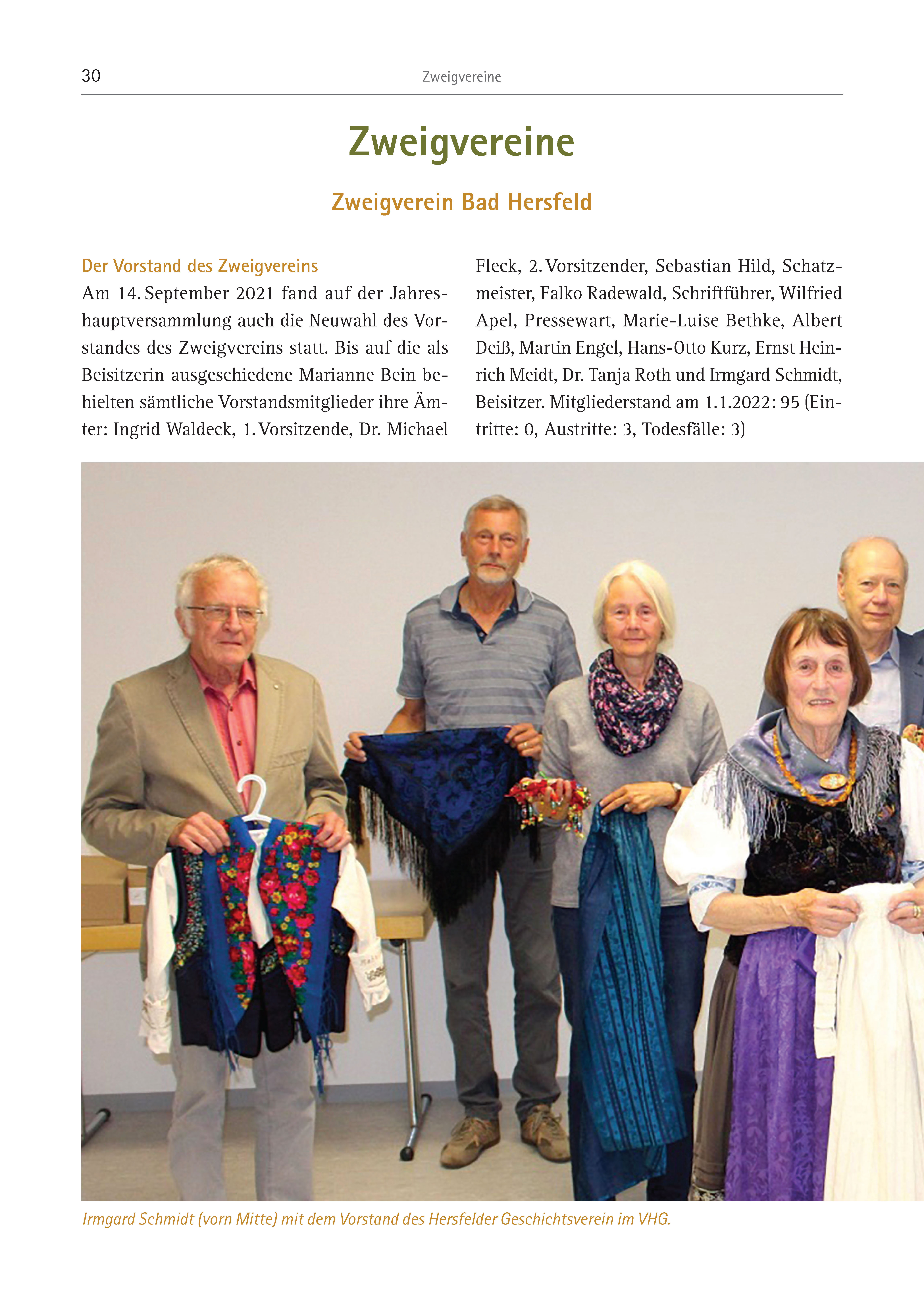 30 Zweigvereine Zweigvereine Zweigverein Bad Hersfeld Der Vorstand des Zweigvereins Am 14. September 2021 fand auf der Jahreshauptversammlung auch die Neuwahl des Vorstandes des Zweigvereins statt. Bis auf die als Beisitzerin ausgeschiedene Marianne Bein behielten sämtliche Vorstandsmitglieder ihre Ämter: Ingrid Waldeck, 1. Vorsitzende, Dr. Michael Fleck, 2. Vorsitzender, Sebastian Hild, Schatzmeister, Falko Radewald, Schriftführer, Wilfried Apel, Pressewart, Marie-Luise Bethke, Albert Deiß, Martin Engel, Hans-Otto Kurz, Ernst Heinrich Meidt, Dr. Tanja Roth und Irmgard Schmidt, Beisitzer. Mitgliederstand am 1.1.2022: 95 (Eintritte: 0, Austritte: 3, Todesfälle: 3) Irmgard Schmidt (vorn Mitte) mit dem Vorstand des Hersfelder Geschichtsverein im VHG.