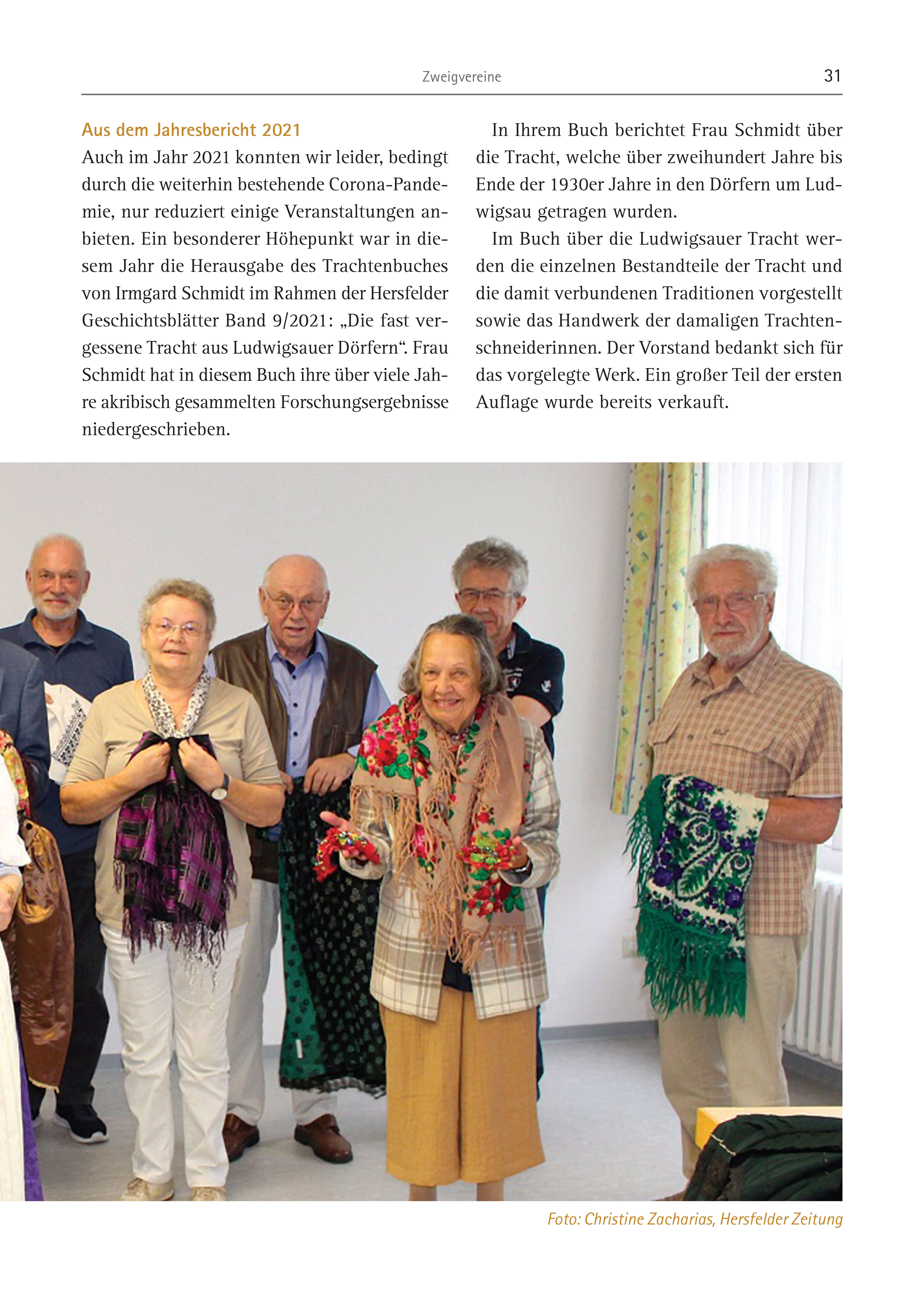 Zweigvereine 31 Aus dem Jahresbericht 2021 Auch im Jahr 2021 konnten wir leider, bedingt durch die weiterhin bestehende Corona-Pandemie, nur reduziert einige Veranstaltungen anbieten. Ein besonderer Höhepunkt war in diesem Jahr die Herausgabe des Trachtenbuches von Irmgard Schmidt im Rahmen der Hersfelder Geschichtsblätter Band 9/2021: „Die fast vergessene Tracht aus Ludwigsauer Dörfern“. Frau Schmidt hat in diesem Buch ihre über viele Jahre akribisch gesammelten Forschungsergebnisse niedergeschrieben. In Ihrem Buch berichtet Frau Schmidt über die Tracht, welche über zweihundert Jahre bis Ende der 1930er Jahre in den Dörfern um Ludwigsau getragen wurden. Im Buch über die Ludwigsauer Tracht werden die einzelnen Bestandteile der Tracht und die damit verbundenen Traditionen vorgestellt sowie das Handwerk der damaligen Trachtenschneiderinnen. Der Vorstand bedankt sich für das vorgelegte Werk. Ein großer Teil der ersten Auflage wurde bereits verkauft. Foto: Christine Zacharias, Hersfelder Zeitung
