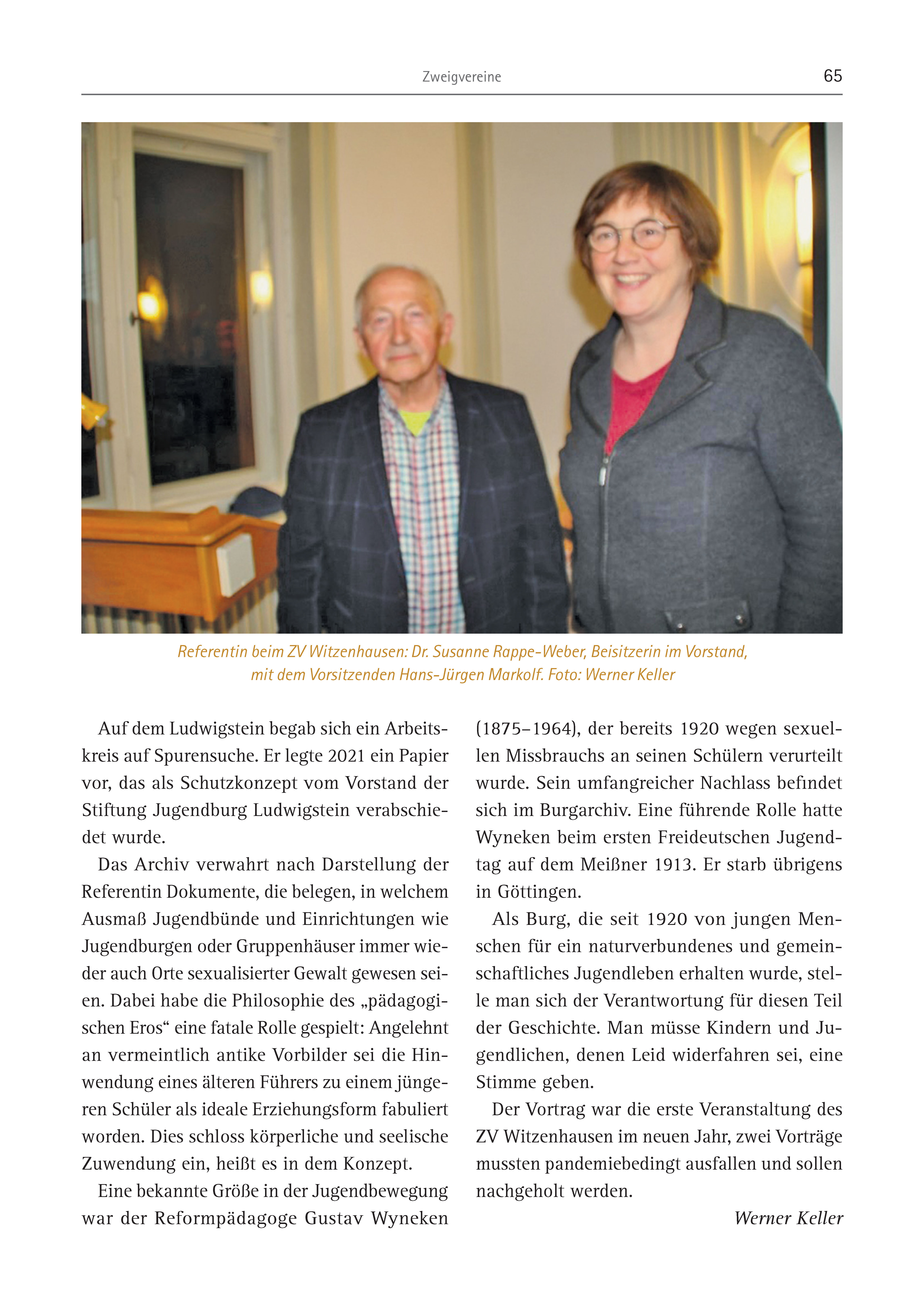 Zweigvereine 65 Auf dem Ludwigstein begab sich ein Arbeitskreis auf Spurensuche. Er legte 2021 ein Papier vor, das als Schutzkonzept vom Vorstand der Stiftung Jugendburg Ludwigstein verabschiedet wurde. Das Archiv verwahrt nach Darstellung der Referentin Dokumente, die belegen, in welchem Ausmaß Jugendbünde und Einrichtungen wie Jugendburgen oder Gruppenhäuser immer wieder auch Orte sexualisierter Gewalt gewesen seien. Dabei habe die Philosophie des „pädagogischen Eros“ eine fatale Rolle gespielt: Angelehnt an vermeintlich antike Vorbilder sei die Hinwendung eines älteren Führers zu einem jüngeren Schüler als ideale Erziehungsform fabuliert worden. Dies schloss körperliche und seelische Zuwendung ein, heißt es in dem Konzept. Eine bekannte Größe in der Jugendbewegung war der Reformpädagoge Gustav Wyneken (1875–1964), der bereits 1920 wegen sexuellen Missbrauchs an seinen Schülern verurteilt wurde. Sein umfangreicher Nachlass befindet sich im Burgarchiv. Eine führende Rolle hatte Wyneken beim ersten Freideutschen Jugendtag auf dem Meißner 1913. Er starb übrigens in Göttingen. Als Burg, die seit 1920 von jungen Menschen für ein naturverbundenes und gemeinschaftliches Jugendleben erhalten wurde, stelle man sich der Verantwortung für diesen Teil der Geschichte. Man müsse Kindern und Jugendlichen, denen Leid widerfahren sei, eine Stimme geben. Der Vortrag war die erste Veranstaltung des ZV Witzenhausen im neuen Jahr, zwei Vorträge mussten pandemiebedingt ausfallen und sollen nachgeholt werden. Werner Keller Referentin beim ZV Witzenhausen: Dr. Susanne Rappe-Weber, Beisitzerin im Vorstand, mit dem Vorsitzenden Hans-Jürgen Markolf. Foto: Werner Keller