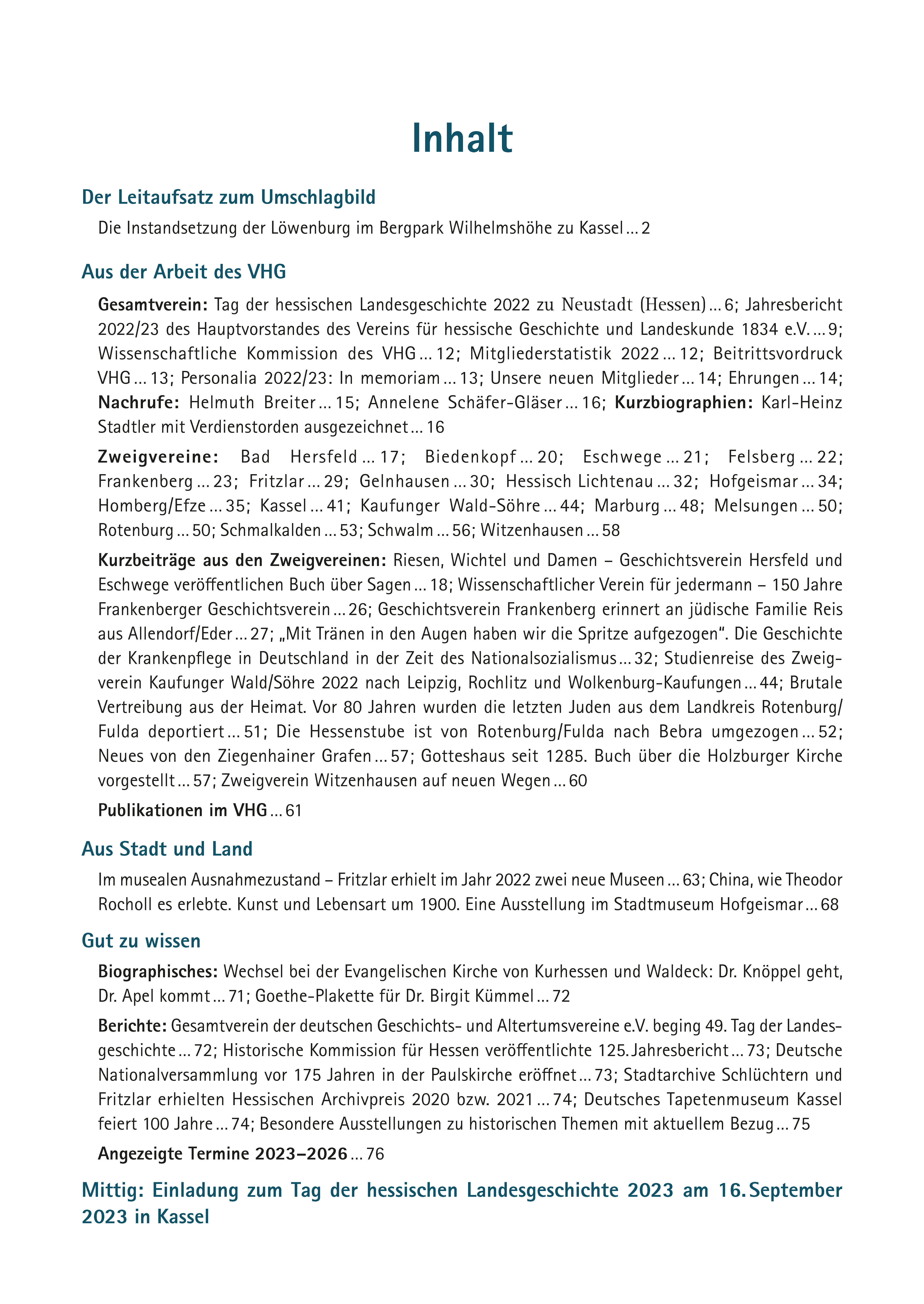 Inhalt Der Leitaufsatz zum Umschlagbild Die Instandsetzung der Löwenburg im Bergpark Wilhelmshöhe zu Kassel … 2 Aus der Arbeit des VHG Gesamtverein: Tag der hessischen Landesgeschichte 2022 zu Neustadt (Hessen) … 6; Jahresbericht 2022/23 des Hauptvorstandes des Vereins für hessische Geschichte und Landeskunde 1834 e.V. … 9; Wissenschaftliche Kommission des VHG … 12; Mitgliederstatistik 2022 … 12; Beitrittsvordruck VHG … 13; Personalia 2022/23: In memoriam … 13; Unsere neuen Mitglieder … 14; Ehrungen … 14; Nachrufe: Helmuth Breiter … 15; Annelene Schäfer-Gläser … 16; Kurzbiographien: Karl-Heinz Stadtler mit Verdienstorden ausgezeichnet … 16 Zweigvereine: Bad Hersfeld … 17; Biedenkopf … 20; Eschwege … 21; Felsberg … 22; Frankenberg … 23; Fritzlar … 29; Gelnhausen … 30; Hessisch Lichtenau … 32; Hofgeismar … 34; Homberg/ Efze … 35; Kassel … 41; Kaufunger Wald-Söhre … 44; Marburg … 48; Melsungen … 50; Rotenburg … 50; Schmalkalden … 53; Schwalm … 56; Witzenhausen … 58 Kurzbeiträge aus den Zweigvereinen: Riesen, Wichtel und Damen – Geschichtsverein Hersfeld und Eschwege veröffentlichen Buch über Sagen … 18; Wissenschaftlicher Verein für jedermann – 150 Jahre Frankenberger Geschichtsverein … 26; Geschichtsverein Frankenberg erinnert an jüdische Familie Reis aus Allendorf/Eder … 27; „Mit Tränen in den Augen haben wir die Spritze aufgezogen“. Die Geschichte der Krankenpflege in Deutschland in der Zeit des Nationalsozialismus … 32; Studienreise des Zweigverein Kaufunger Wald/Söhre 2022 nach Leipzig, Rochlitz und Wolkenburg-Kaufungen … 44; Brutale Vertreibung aus der Heimat. Vor 80 Jahren wurden die letzten Juden aus dem Landkreis Rotenburg/ Fulda deportiert … 51; Die Hessenstube ist von Rotenburg/Fulda nach Bebra umgezogen … 52; Neues von den Ziegenhainer Grafen … 57; Gotteshaus seit 1285. Buch über die Holzburger Kirche vorgestellt … 57; Zweigverein Witzenhausen auf neuen Wegen … 60 Publikationen im VHG … 61 Aus Stadt und Land Im musealen Ausnahmezustand – Fritzlar erhielt im Jahr 2022 zwei neue Museen … 63; China, wie Theodor Rocholl es erlebte. Kunst und Lebensart um 1900. Eine Ausstellung im Stadtmuseum Hofgeismar … 68 Gut zu wissen Biographisches: Wechsel bei der Evangelischen Kirche von Kurhessen und Waldeck: Dr. Knöppel geht, Dr. Apel kommt … 71; Goethe-Plakette für Dr. Birgit Kümmel … 72 Berichte: Gesamtverein der deutschen Geschichts- und Altertumsvereine e.V. beging 49. Tag der Landesgeschichte … 72; Historische Kommission für Hessen veröffentlichte 125. Jahresbericht … 73; Deutsche Nationalversammlung vor 175 Jahren in der Paulskirche eröffnet … 73; Stadtarchive Schlüchtern und Fritzlar erhielten Hessischen Archivpreis 2020 bzw. 2021 … 74; Deutsches Tapetenmuseum Kassel feiert 100 Jahre … 74; Besondere Ausstellungen zu historischen Themen mit aktuellem Bezug … 75 Angezeigte Termine 2023–2026 … 76 Mittig: Einladung zum Tag der hessischen Landesgeschichte 2023 am 16. September 2023 in Kassel