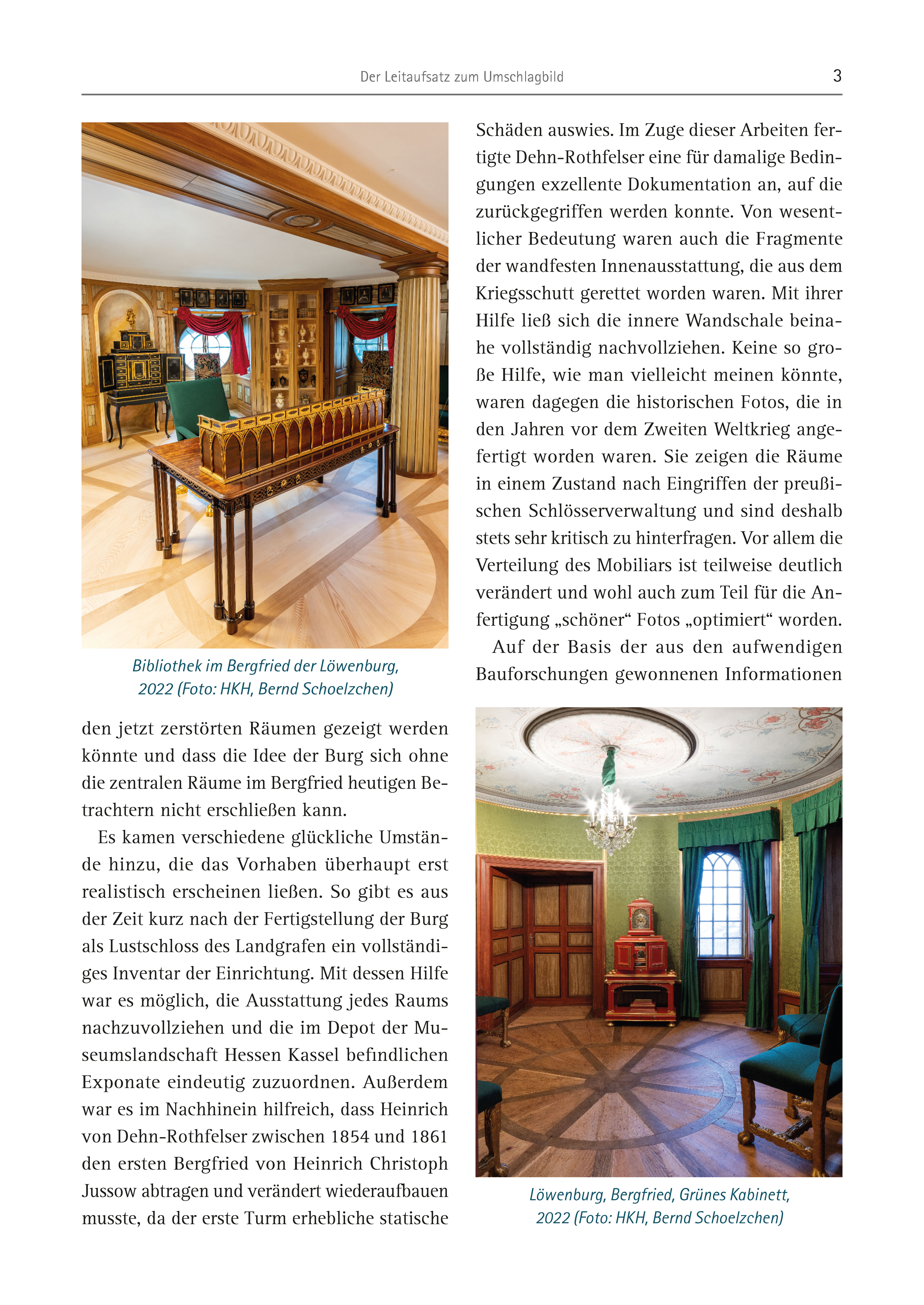Der Leitaufsatz zum Umschlagbild 3 den jetzt zerstörten Räumen gezeigt werden könnte und dass die Idee der Burg sich ohne die zentralen Räume im Bergfried heutigen Betrachtern nicht erschließen kann. Es kamen verschiedene glückliche Umstände hinzu, die das Vorhaben überhaupt erst realistisch erscheinen ließen. So gibt es aus der Zeit kurz nach der Fertigstellung der Burg als Lustschloss des Landgrafen ein vollständiges Inventar der Einrichtung. Mit dessen Hilfe war es möglich, die Ausstattung jedes Raums nachzuvollziehen und die im Depot der Museumslandschaft Hessen Kassel befindlichen Exponate eindeutig zuzuordnen. Außerdem war es im Nachhinein hilfreich, dass Heinrich von Dehn-Rothfelser zwischen 1854 und 1861 den ersten Bergfried von Heinrich Christoph Jussow abtragen und verändert wiederaufbauen musste, da der erste Turm erhebliche statische Schäden auswies. Im Zuge dieser Arbeiten fertigte Dehn-Rothfelser eine für damalige Bedingungen exzellente Dokumentation an, auf die zurückgegriffen werden konnte. Von wesentlicher Bedeutung waren auch die Fragmente der wandfesten Innenausstattung, die aus dem Kriegsschutt gerettet worden waren. Mit ihrer Hilfe ließ sich die innere Wandschale beinahe vollständig nachvollziehen. Keine so große Hilfe, wie man vielleicht meinen könnte, waren dagegen die historischen Fotos, die in den Jahren vor dem Zweiten Weltkrieg angefertigt worden waren. Sie zeigen die Räume in einem Zustand nach Eingriffen der preußischen Schlösserverwaltung und sind deshalb stets sehr kritisch zu hinterfragen. Vor allem die Verteilung des Mobiliars ist teilweise deutlich verändert und wohl auch zum Teil für die Anfertigung „schöner“ Fotos „optimiert“ worden. Auf der Basis der aus den aufwendigen Bibliothek im Bergfried der Löwenburg, Bauforschungen gewonnenen Informationen 2022 (Foto: HKH, Bernd Schoelzchen) Löwenburg, Bergfried, Grünes Kabinett, 2022 (Foto: HKH, Bernd Schoelzchen)