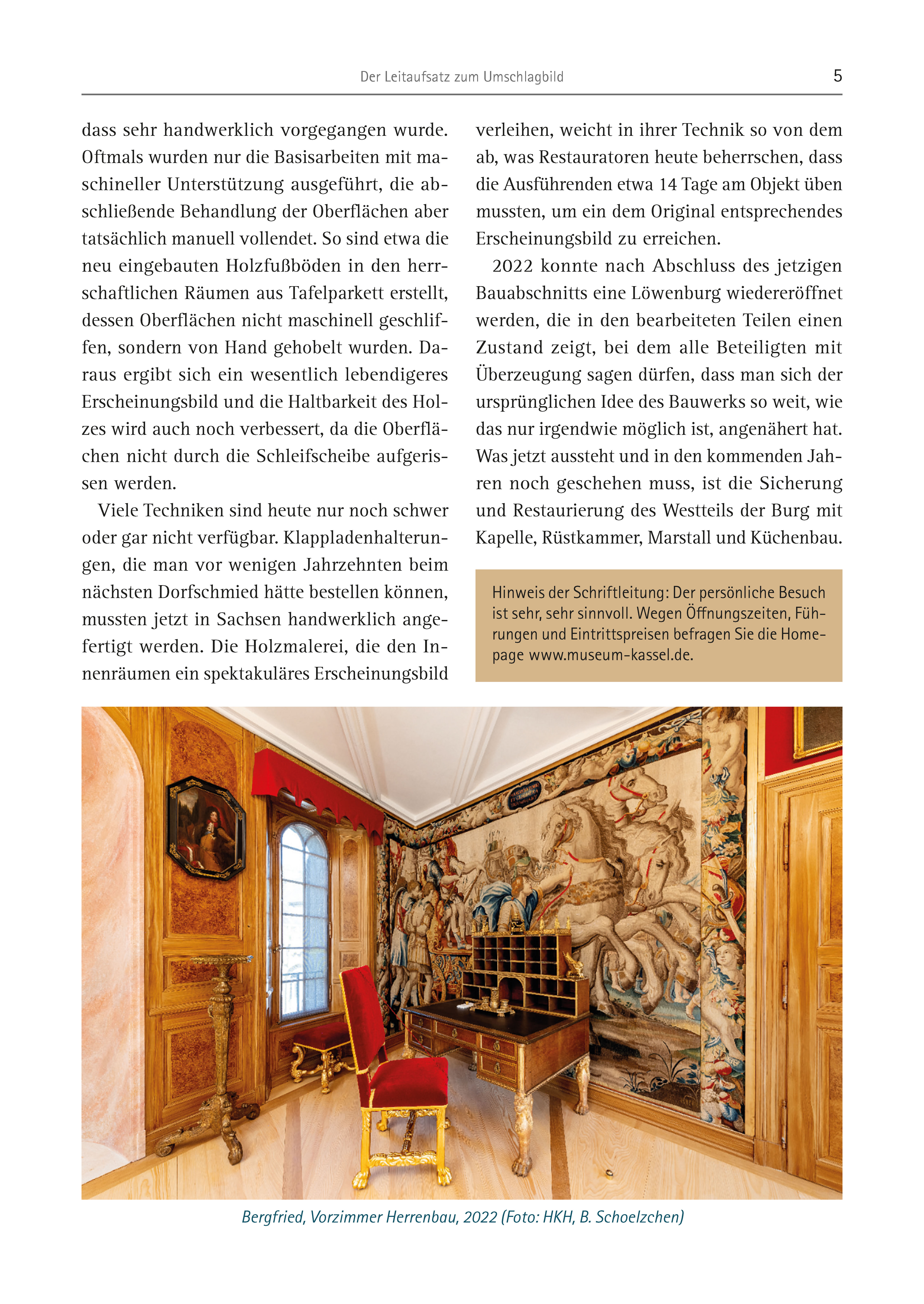 Der Leitaufsatz zum Umschlagbild 5 dass sehr handwerklich vorgegangen wurde. Oftmals wurden nur die Basisarbeiten mit maschineller Unterstützung ausgeführt, die abschließende Behandlung der Oberflächen aber tatsächlich manuell vollendet. So sind etwa die neu eingebauten Holzfußböden in den herrschaftlichen Räumen aus Tafelparkett erstellt, dessen Oberflächen nicht maschinell geschliffen, sondern von Hand gehobelt wurden. Daraus ergibt sich ein wesentlich lebendigeres Erscheinungsbild und die Haltbarkeit des Holzes wird auch noch verbessert, da die Oberflächen nicht durch die Schleifscheibe aufgerissen werden. Viele Techniken sind heute nur noch schwer oder gar nicht verfügbar. Klappladenhalterungen, die man vor wenigen Jahrzehnten beim nächsten Dorfschmied hätte bestellen können, mussten jetzt in Sachsen handwerklich angefertigt werden. Die Holzmalerei, die den Innenräumen ein spektakuläres Erscheinungsbild verleihen, weicht in ihrer Technik so von dem ab, was Restauratoren heute beherrschen, dass die Ausführenden etwa 14 Tage am Objekt üben mussten, um ein dem Original entsprechendes Erscheinungsbild zu erreichen. 2022 konnte nach Abschluss des jetzigen Bauabschnitts eine Löwenburg wiedereröffnet werden, die in den bearbeiteten Teilen einen Zustand zeigt, bei dem alle Beteiligten mit Überzeugung sagen dürfen, dass man sich der ursprünglichen Idee des Bauwerks so weit, wie das nur irgendwie möglich ist, angenähert hat. Was jetzt aussteht und in den kommenden Jahren noch geschehen muss, ist die Sicherung und Restaurierung des Westteils der Burg mit Kapelle, Rüstkammer, Marstall und Küchenbau. Hinweis der Schriftleitung: Der persönliche Besuch ist sehr, sehr sinnvoll. Wegen Öffnungszeiten, Führungen und Eintrittspreisen befragen Sie die Homepage www.museum-kassel.de. Bergfried, Vorzimmer Herrenbau, 2022 (Foto: HKH, B. Schoelzchen)