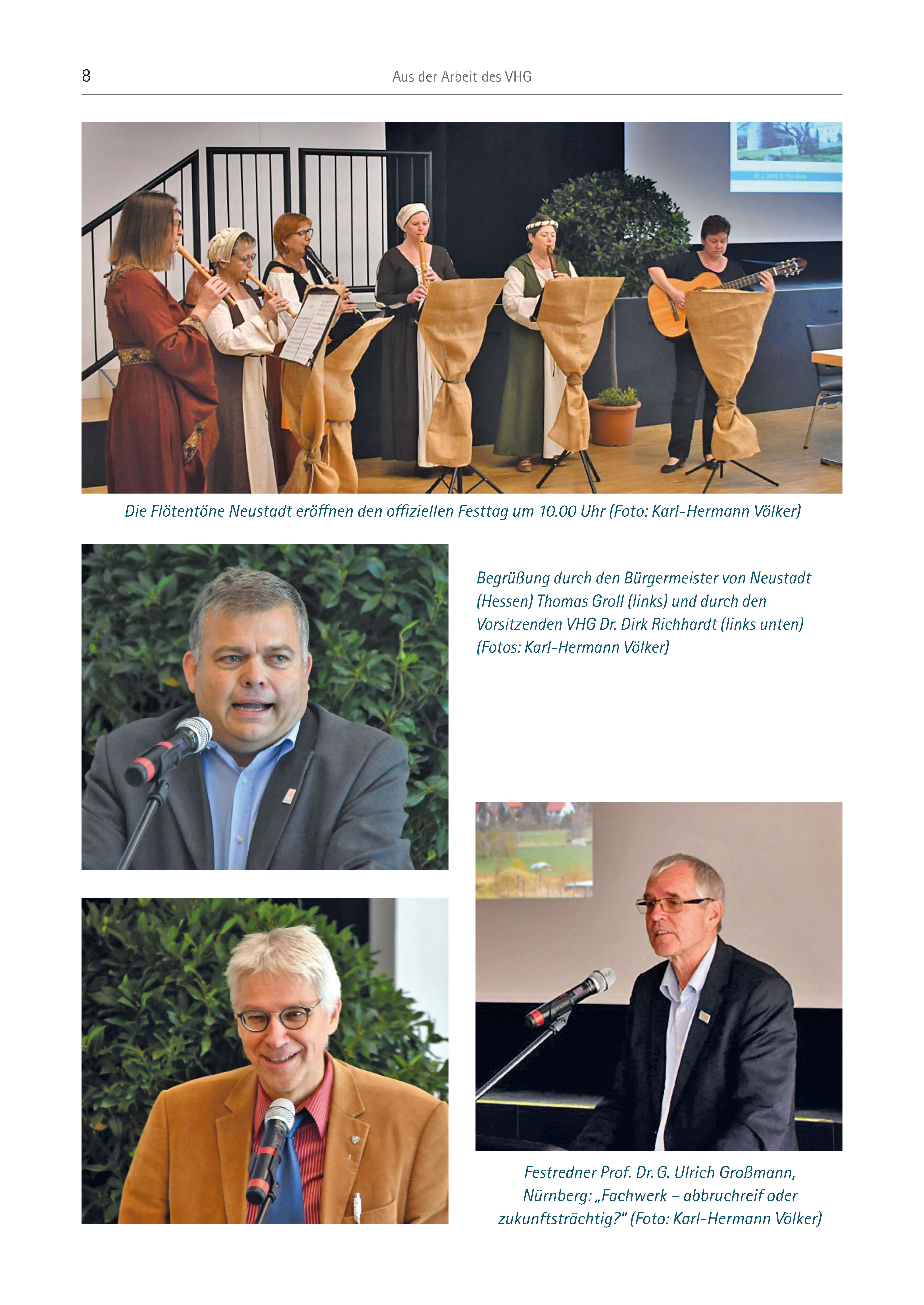 8 Aus der Arbeit des VHG Die Flötentöne Neustadt eröffnen den offiziellen Festtag um 10.00 Uhr (Foto: Karl-Hermann Völker) Begrüßung durch den Bürgermeister von Neustadt (Hessen) Thomas Groll (links) und durch den Vorsitzenden VHG Dr. Dirk Richhardt (links unten) (Fotos: Karl-Hermann Völker) Festredner Prof. Dr. G. Ulrich Großmann, Nürnberg: „Fachwerk – abbruchreif oder zukunftsträchtig?“ (Foto: Karl-Hermann Völker)