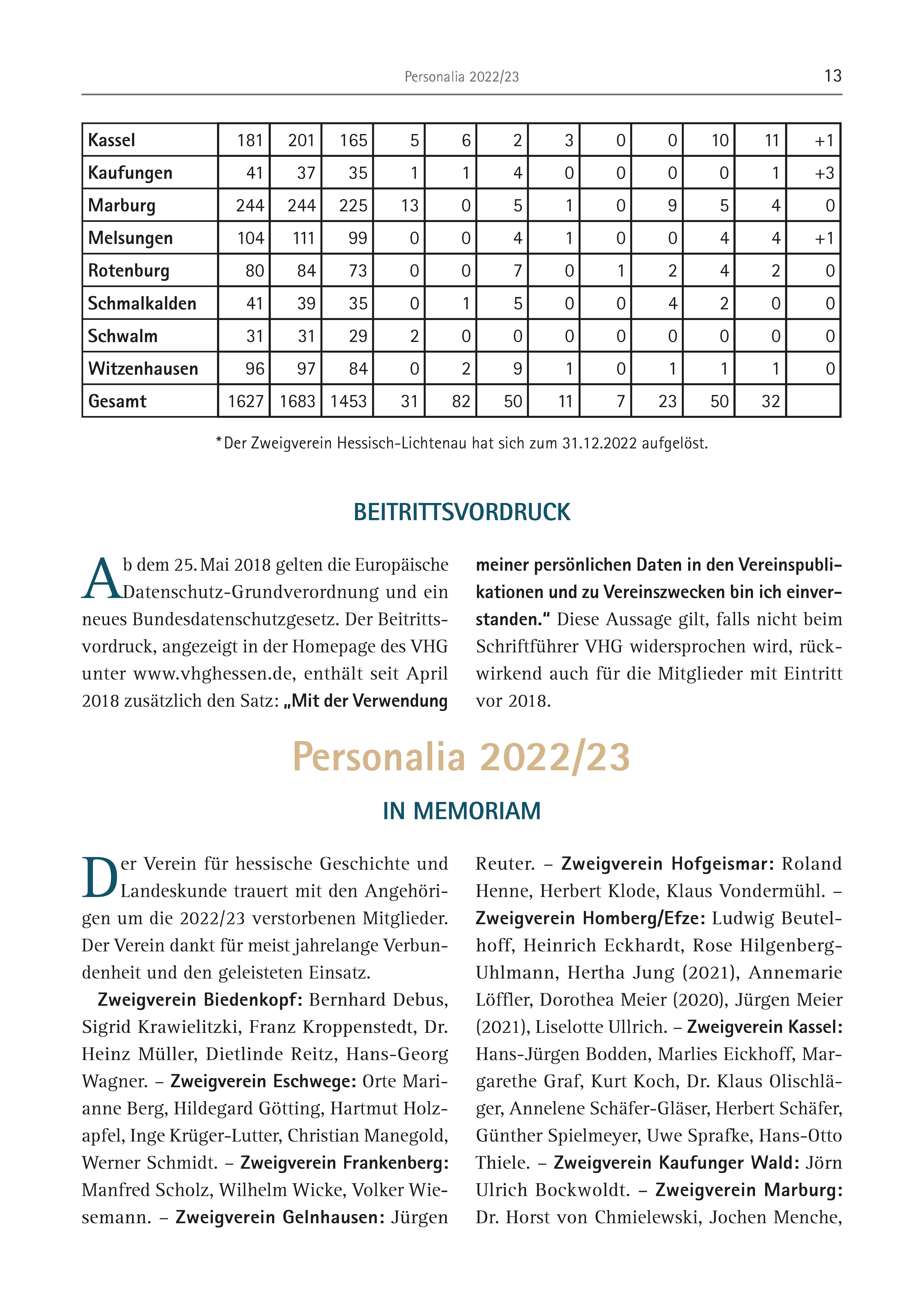 Personalia 2022/23 13 Kassel 181 201 165 5 6 2 3 0 0 10 11 +1 Kaufungen 41 37 35 1 1 4 0 0 0 0 1 +3 Marburg 244 244 225 13 0 5 1 0 9 5 4 0 Melsungen 104 111 99 0 0 4 1 0 0 4 4 +1 Rotenburg 80 84 73 0 0 7 0 1 2 4 2 0 Schmalkalden 41 39 35 0 1 5 0 0 4 2 0 0 Schwalm 31 31 29 2 0 0 0 0 0 0 0 0 Witzenhausen 96 97 84 0 2 9 1 0 1 1 1 0 Gesamt 1627 1683 1453 31 82 50 11 7 23 50 32 * Der Zweigverein Hessisch-Lichtenau hat sich zum 31.12.2022 aufgelöst. Ab dem 25. Mai 2018 gelten die Europäische Datenschutz-Grundverordnung und ein neues Bundesdatenschutzgesetz. Der Beitrittsvordruck, angezeigt in der Homepage des VHG unter www.vhghessen.de, enthält seit April 2018 zusätzlich den Satz: „Mit der Verwendung BEITRITTSVORDRUCK meiner persönlichen Daten in den Vereinspublikationen und zu Vereinszwecken bin ich einverstanden.“ Diese Aussage gilt, falls nicht beim Schriftführer VHG widersprochen wird, rückwirkend auch für die Mitglieder mit Eintritt vor 2018. Personalia 2022/23 IN MEMORIAM Der Verein für hessische Geschichte und Landeskunde trauert mit den Angehörigen um die 2022/23 verstorbenen Mitglieder. Der Verein dankt für meist jahrelange Verbundenheit und den geleisteten Einsatz. Zweigverein Biedenkopf: Bernhard Debus, Sigrid Krawielitzki, Franz Kroppenstedt, Dr. Heinz Müller, Dietlinde Reitz, Hans-Georg Wagner. – Zweigverein Eschwege: Orte Marianne Berg, Hildegard Götting, Hartmut Holzapfel, Inge Krüger-Lutter, Christian Manegold, Werner Schmidt. – Zweigverein Frankenberg: Manfred Scholz, Wilhelm Wicke, Volker Wiesemann. – Zweigverein Gelnhausen: Jürgen Reuter. – Zweigverein Hofgeismar: Roland Henne, Herbert Klode, Klaus Vondermühl. – Zweigverein Homberg/Efze: Ludwig Beutelhoff, Heinrich Eckhardt, Rose Hilgenberg- Uhlmann, Hertha Jung (2021), Annemarie Löffler, Dorothea Meier (2020), Jürgen Meier (2021), Liselotte Ullrich. – Zweigverein Kassel: Hans-Jürgen Bodden, Marlies Eickhoff, Margarethe Graf, Kurt Koch, Dr. Klaus Olischläger, Annelene Schäfer-Gläser, Herbert Schäfer, Günther Spielmeyer, Uwe Sprafke, Hans-Otto Thiele. – Zweigverein Kaufunger Wald: Jörn Ulrich Bockwoldt. – Zweigverein Marburg: Dr. Horst von Chmielewski, Jochen Menche,