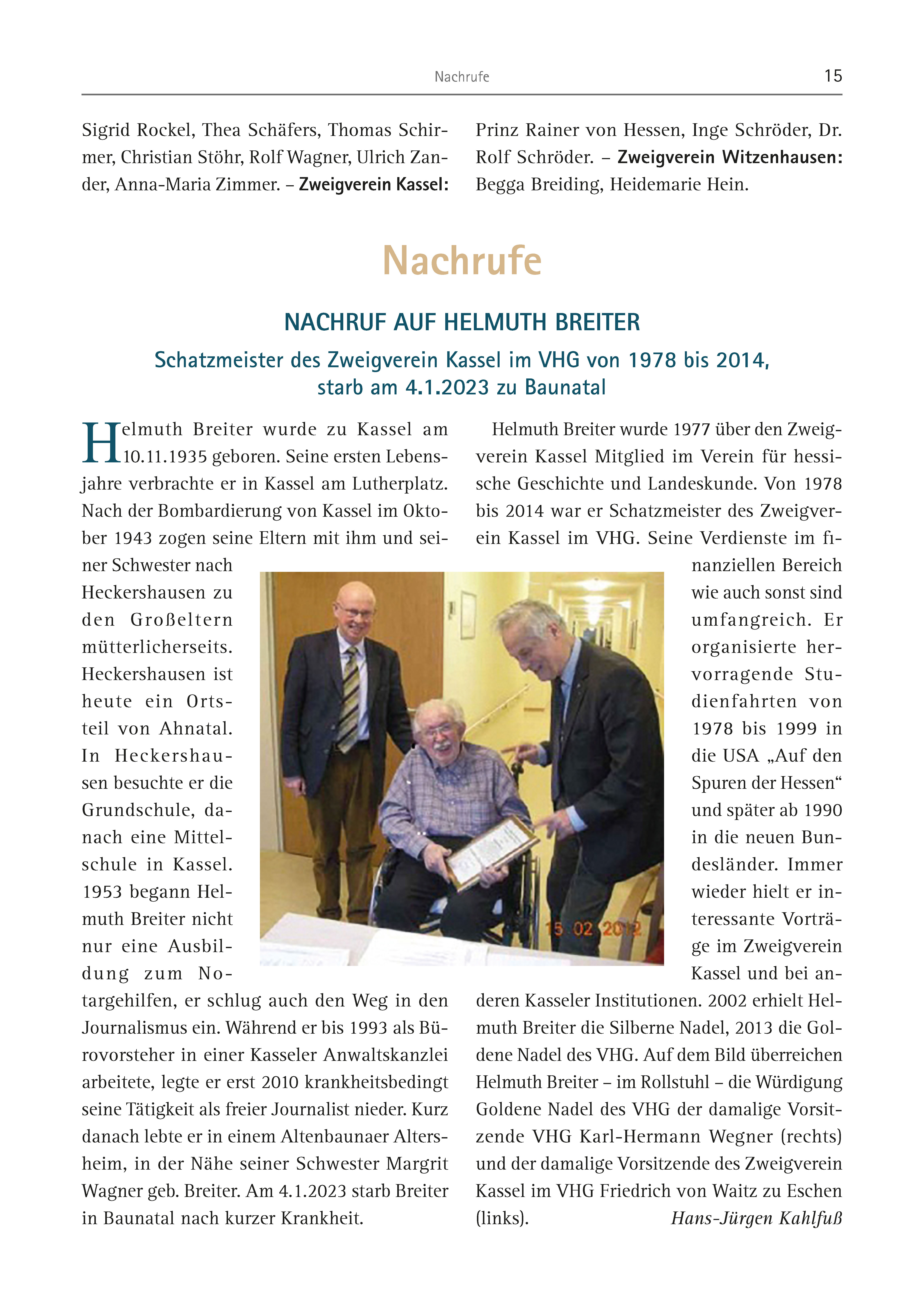 Nachrufe 15 Nachrufe NACHRUF AUF HELMUTH BREITER Schatzmeister des Zweigverein Kassel im VHG von 1978 bis 2014, starb am 4.1.2023 zu Baunatal Helmuth Breiter wurde zu Kassel am 10.11.1935 geboren. Seine ersten Lebensjahre verbrachte er in Kassel am Lutherplatz. Nach der Bombardierung von Kassel im Oktober 1943 zogen seine Eltern mit ihm und seiner Schwester nach Heckershausen zu den Großeltern mütterlicherseits. Heckershausen ist heute ein Ortsteil von Ahnatal. In Heckershausen besuchte er die Grundschule, danach eine Mittelschule in Kassel. 1953 begann Helmuth Breiter nicht nur eine Ausbildung zum Notargehilfen, er schlug auch den Weg in den Journalismus ein. Während er bis 1993 als Bürovorsteher in einer Kasseler Anwaltskanzlei arbeitete, legte er erst 2010 krankheitsbedingt seine Tätigkeit als freier Journalist nieder. Kurz danach lebte er in einem Altenbaunaer Altersheim, in der Nähe seiner Schwester Margrit Wagner geb. Breiter. Am 4.1.2023 starb Breiter in Baunatal nach kurzer Krankheit. Helmuth Breiter wurde 1977 über den Zweigverein Kassel Mitglied im Verein für hessische Geschichte und Landeskunde. Von 1978 bis 2014 war er Schatzmeister des Zweigverein Kassel im VHG. Seine Verdienste im finanziellen Bereich wie auch sonst sind umfangreich. Er organisierte hervorragende Studienfahrten von 1978 bis 1999 in die USA „Auf den Spuren der Hessen“ und später ab 1990 in die neuen Bundesländer. Immer wieder hielt er interessante Vorträge im Zweigverein Kassel und bei anderen Kasseler Institutionen. 2002 erhielt Helmuth Breiter die Silberne Nadel, 2013 die Goldene Nadel des VHG. Auf dem Bild überreichen Helmuth Breiter – im Rollstuhl – die Würdigung Goldene Nadel des VHG der damalige Vorsitzende VHG Karl-Hermann Wegner (rechts) und der damalige Vorsitzende des Zweigverein Kassel im VHG Friedrich von Waitz zu Eschen (links). Hans-Jürgen Kahlfuß Sigrid Rockel, Thea Schäfers, Thomas Schirmer, Christian Stöhr, Rolf Wagner, Ulrich Zander, Anna-Maria Zimmer. – Zweigverein Kassel: Prinz Rainer von Hessen, Inge Schröder, Dr. Rolf Schröder. – Zweigverein Witzenhausen: Begga Breiding, Heidemarie Hein.