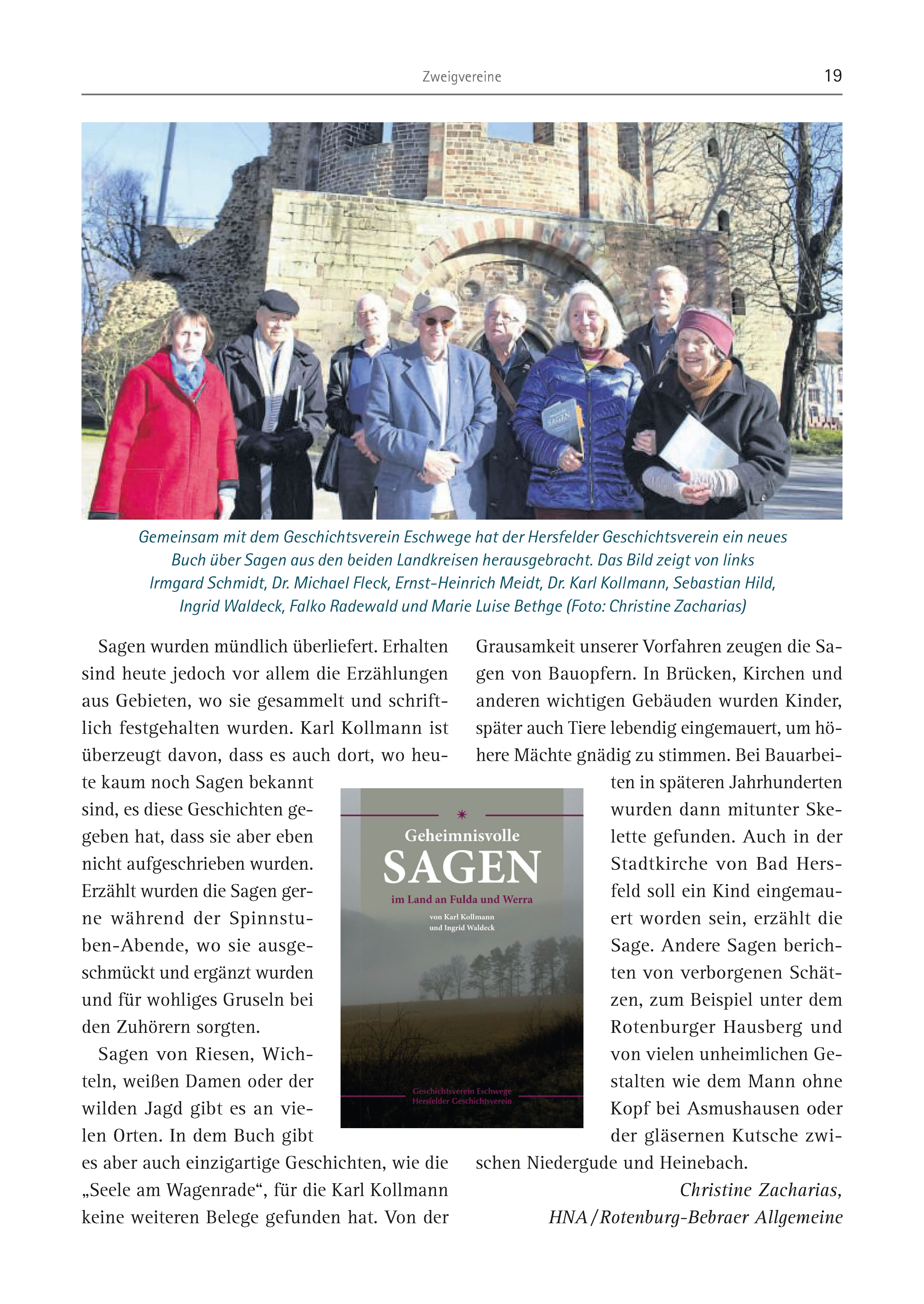 Zweigvereine 19 Sagen wurden mündlich überliefert. Erhalten sind heute jedoch vor allem die Erzählungen aus Gebieten, wo sie gesammelt und schriftlich festgehalten wurden. Karl Kollmann ist überzeugt davon, dass es auch dort, wo heute kaum noch Sagen bekannt sind, es diese Geschichten gegeben hat, dass sie aber eben nicht aufgeschrieben wurden. Erzählt wurden die Sagen gerne während der Spinnstuben- Abende, wo sie ausgeschmückt und ergänzt wurden und für wohliges Gruseln bei den Zuhörern sorgten. Sagen von Riesen, Wichteln, weißen Damen oder der wilden Jagd gibt es an vielen Orten. In dem Buch gibt es aber auch einzigartige Geschichten, wie die „Seele am Wagenrade“, für die Karl Kollmann keine weiteren Belege gefunden hat. Von der Grausamkeit unserer Vorfahren zeugen die Sagen von Bauopfern. In Brücken, Kirchen und anderen wichtigen Gebäuden wurden Kinder, später auch Tiere lebendig eingemauert, um höhere Mächte gnädig zu stimmen. Bei Bauarbeiten in späteren Jahrhunderten wurden dann mitunter Skelette gefunden. Auch in der Stadtkirche von Bad Hersfeld soll ein Kind eingemauert worden sein, erzählt die Sage. Andere Sagen berichten von verborgenen Schätzen, zum Beispiel unter dem Rotenburger Hausberg und von vielen unheimlichen Gestalten wie dem Mann ohne Kopf bei Asmushausen oder der gläsernen Kutsche zwischen Niedergude und Heinebach. Christine Zacharias, HNA / Rotenburg-Bebraer Allgemeine Gemeinsam mit dem Geschichtsverein Eschwege hat der Hersfelder Geschichtsverein ein neues Buch über Sagen aus den beiden Landkreisen herausgebracht. Das Bild zeigt von links lrmgard Schmidt, Dr. Michael Fleck, Ernst-Heinrich Meidt, Dr. Karl Kollmann, Sebastian Hild, Ingrid Waldeck, Falko Radewald und Marie Luise Bethge (Foto: Christine Zacharias)