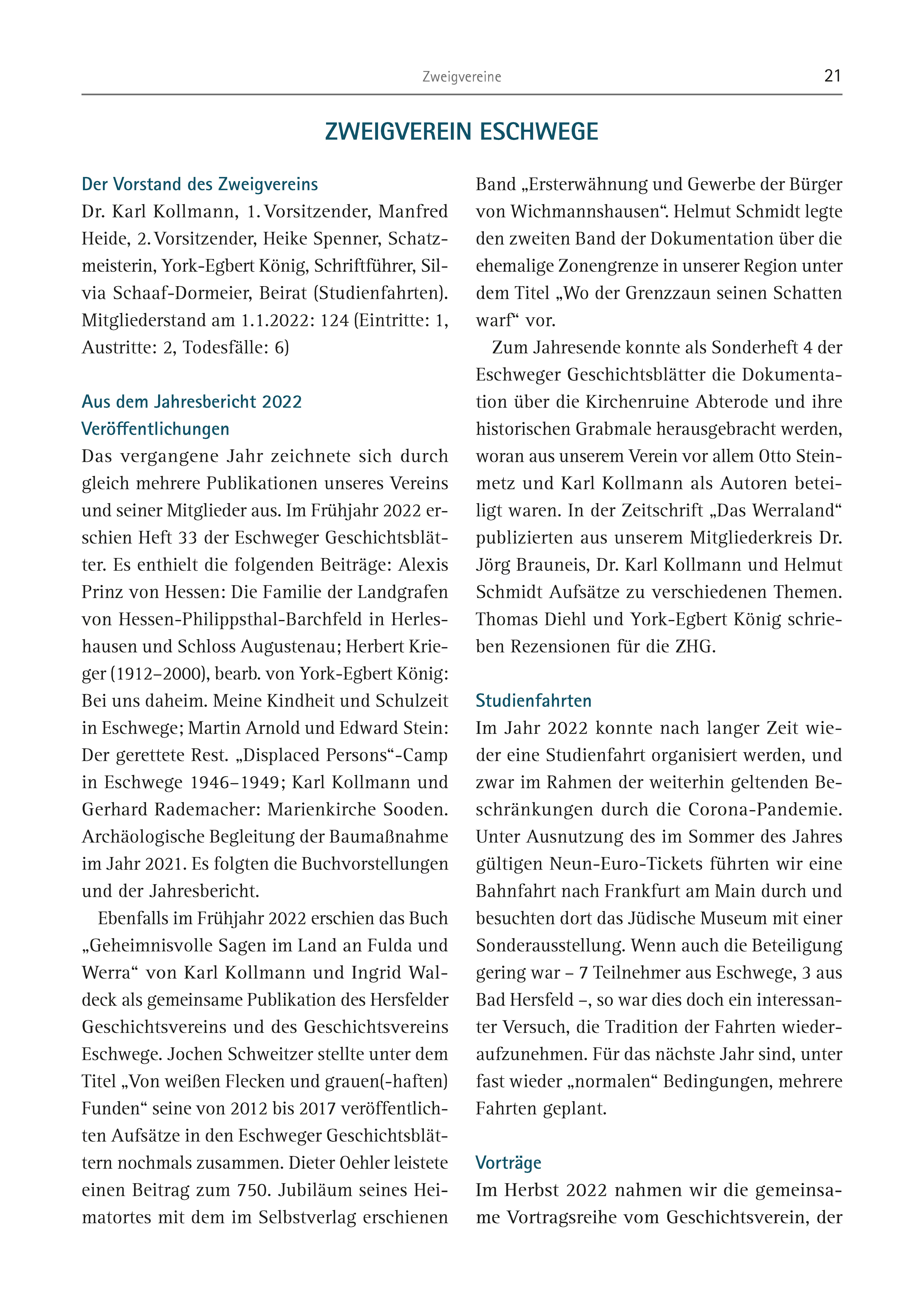Zweigvereine 21 Der Vorstand des Zweigvereins Dr. Karl Kollmann, 1. Vorsitzender, Manfred Heide, 2. Vorsitzender, Heike Spenner, Schatzmeisterin, York-Egbert König, Schriftführer, Silvia Schaaf-Dormeier, Beirat (Studienfahrten). Mitgliederstand am 1.1.2022: 124 (Eintritte: 1, Austritte: 2, Todesfälle: 6) Aus dem Jahresbericht 2022 Veröffentlichungen Das vergangene Jahr zeichnete sich durch gleich mehrere Publikationen unseres Vereins und seiner Mitglieder aus. Im Frühjahr 2022 erschien Heft 33 der Eschweger Geschichtsblätter. Es enthielt die folgenden Beiträge: Alexis Prinz von Hessen: Die Familie der Landgrafen von Hessen-Philippsthal-Barchfeld in Herleshausen und Schloss Augustenau; Herbert Krieger (1912–2000), bearb. von York-Egbert König: Bei uns daheim. Meine Kindheit und Schulzeit in Eschwege; Martin Arnold und Edward Stein: Der gerettete Rest. „Displaced Persons“-Camp in Eschwege 1946–1949; Karl Kollmann und Gerhard Rademacher: Marienkirche Sooden. Archäologische Begleitung der Baumaßnahme im Jahr 2021. Es folgten die Buchvorstellungen und der Jahresbericht. Ebenfalls im Frühjahr 2022 erschien das Buch „Geheimnisvolle Sagen im Land an Fulda und Werra“ von Karl Kollmann und Ingrid Waldeck als gemeinsame Publikation des Hersfelder Geschichtsvereins und des Geschichtsvereins Eschwege. Jochen Schweitzer stellte unter dem Titel „Von weißen Flecken und grauen(-haften) Funden“ seine von 2012 bis 2017 veröffentlichten Aufsätze in den Eschweger Geschichtsblättern nochmals zusammen. Dieter Oehler leistete einen Beitrag zum 750. Jubiläum seines Heimatortes mit dem im Selbstverlag erschienen Band „Ersterwähnung und Gewerbe der Bürger von Wichmannshausen“. Helmut Schmidt legte den zweiten Band der Dokumentation über die ehemalige Zonengrenze in unserer Region unter dem Titel „Wo der Grenzzaun seinen Schatten warf“ vor. Zum Jahresende konnte als Sonderheft 4 der Eschweger Geschichtsblätter die Dokumentation über die Kirchenruine Abterode und ihre historischen Grabmale herausgebracht werden, woran aus unserem Verein vor allem Otto Steinmetz und Karl Kollmann als Autoren beteiligt waren. In der Zeitschrift „Das Werraland“ publizierten aus unserem Mitgliederkreis Dr. Jörg Brauneis, Dr. Karl Kollmann und Helmut Schmidt Aufsätze zu verschiedenen Themen. Thomas Diehl und York-Egbert König schrieben Rezensionen für die ZHG. Studienfahrten Im Jahr 2022 konnte nach langer Zeit wieder eine Studienfahrt organisiert werden, und zwar im Rahmen der weiterhin geltenden Beschränkungen durch die Corona-Pandemie. Unter Ausnutzung des im Sommer des Jahres gültigen Neun-Euro-Tickets führten wir eine Bahnfahrt nach Frankfurt am Main durch und besuchten dort das Jüdische Museum mit einer Sonderausstellung. Wenn auch die Beteiligung gering war – 7 Teilnehmer aus Eschwege, 3 aus Bad Hersfeld –, so war dies doch ein interessanter Versuch, die Tradition der Fahrten wiederaufzunehmen. Für das nächste Jahr sind, unter fast wieder „normalen“ Bedingungen, mehrere Fahrten geplant. Vorträge Im Herbst 2022 nahmen wir die gemeinsame Vortragsreihe vom Geschichtsverein, der ZWEIGVEREIN ESCHWEGE