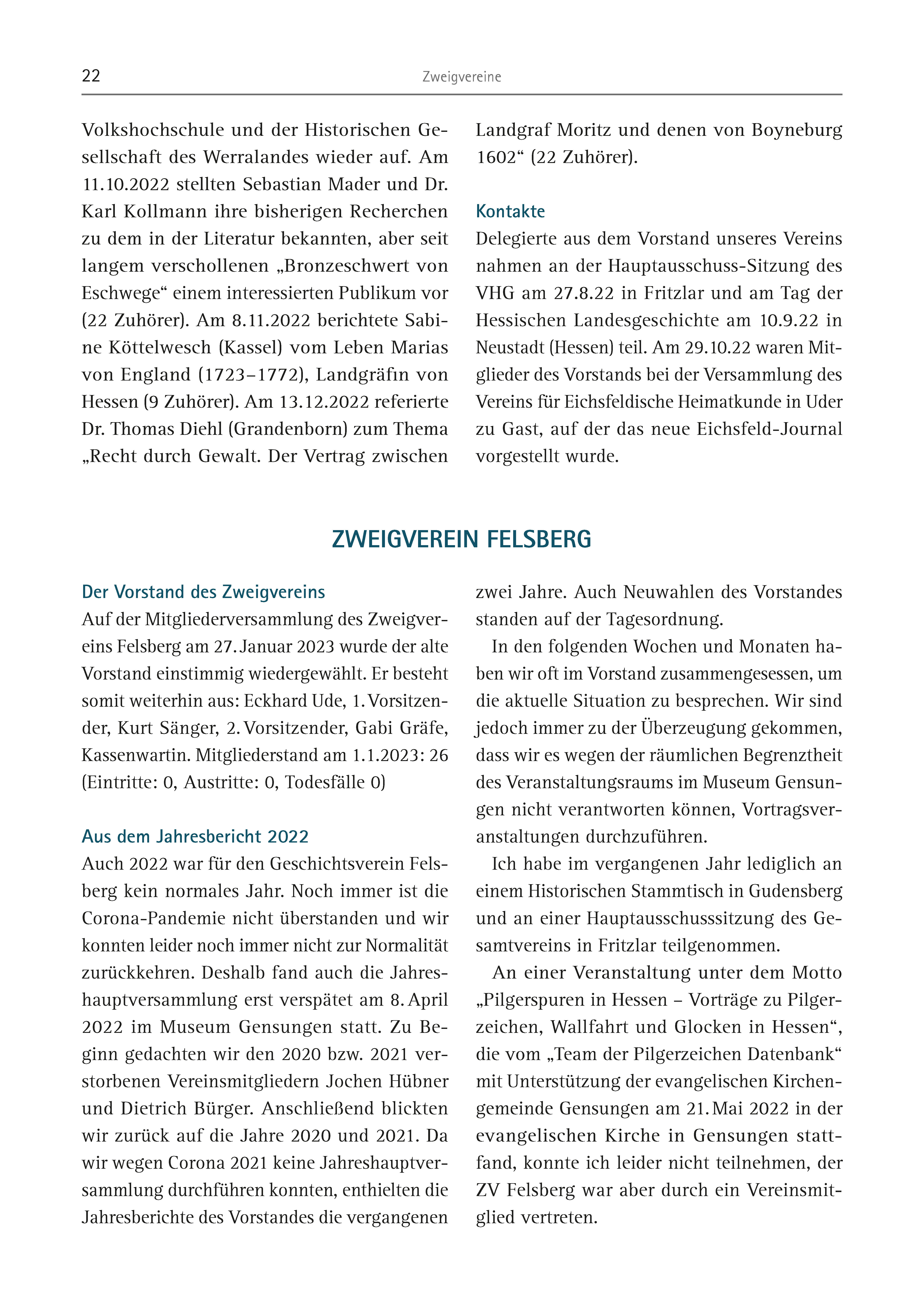 22 Zweigvereine Landgraf Moritz und denen von Boyneburg 1602“ (22 Zuhörer). Kontakte Delegierte aus dem Vorstand unseres Vereins nahmen an der Hauptausschuss-Sitzung des VHG am 27.8.22 in Fritzlar und am Tag der Hessischen Landesgeschichte am 10.9.22 in Neustadt (Hessen) teil. Am 29.10.22 waren Mitglieder des Vorstands bei der Versammlung des Vereins für Eichsfeldische Heimatkunde in Uder zu Gast, auf der das neue Eichsfeld-Journal vorgestellt wurde. Volkshochschule und der Historischen Gesellschaft des Werralandes wieder auf. Am 11.10.2022 stellten Sebastian Mader und Dr. Karl Kollmann ihre bisherigen Recherchen zu dem in der Literatur bekannten, aber seit langem verschollenen „Bronzeschwert von Eschwege“ einem interessierten Publikum vor (22 Zuhörer). Am 8.11.2022 berichtete Sabine Köttelwesch (Kassel) vom Leben Marias von England (1723–1772), Landgräfin von Hessen (9 Zuhörer). Am 13.12.2022 referierte Dr. Thomas Diehl (Grandenborn) zum Thema „Recht durch Gewalt. Der Vertrag zwischen Der Vorstand des Zweigvereins Auf der Mitgliederversammlung des Zweigvereins Felsberg am 27. Januar 2023 wurde der alte Vorstand einstimmig wiedergewählt. Er besteht somit weiterhin aus: Eckhard Ude, 1. Vorsitzender, Kurt Sänger, 2. Vorsitzender, Gabi Gräfe, Kassenwartin. Mitgliederstand am 1.1.2023: 26 (Eintritte: 0, Austritte: 0, Todesfälle 0) Aus dem Jahresbericht 2022 Auch 2022 war für den Geschichtsverein Felsberg kein normales Jahr. Noch immer ist die Corona-Pandemie nicht überstanden und wir konnten leider noch immer nicht zur Normalität zurückkehren. Deshalb fand auch die Jahreshauptversammlung erst verspätet am 8. April 2022 im Museum Gensungen statt. Zu Beginn gedachten wir den 2020 bzw. 2021 verstorbenen Vereinsmitgliedern Jochen Hübner und Dietrich Bürger. Anschließend blickten wir zurück auf die Jahre 2020 und 2021. Da wir wegen Corona 2021 keine Jahreshauptversammlung durchführen konnten, enthielten die Jahresberichte des Vorstandes die vergangenen zwei Jahre. Auch Neuwahlen des Vorstandes standen auf der Tagesordnung. In den folgenden Wochen und Monaten haben wir oft im Vorstand zusammengesessen, um die aktuelle Situation zu besprechen. Wir sind jedoch immer zu der Überzeugung gekommen, dass wir es wegen der räumlichen Begrenztheit des Veranstaltungsraums im Museum Gensungen nicht verantworten können, Vortragsveranstaltungen durchzuführen. Ich habe im vergangenen Jahr lediglich an einem Historischen Stammtisch in Gudensberg und an einer Hauptausschusssitzung des Gesamtvereins in Fritzlar teilgenommen. An einer Veranstaltung unter dem Motto „Pilgerspuren in Hessen – Vorträge zu Pilgerzeichen, Wallfahrt und Glocken in Hessen“, die vom „Team der Pilgerzeichen Datenbank“ mit Unterstützung der evangelischen Kirchengemeinde Gensungen am 21. Mai 2022 in der evangelischen Kirche in Gensungen stattfand, konnte ich leider nicht teilnehmen, der ZV Felsberg war aber durch ein Vereinsmitglied vertreten. ZWEIGVEREIN FELSBERG