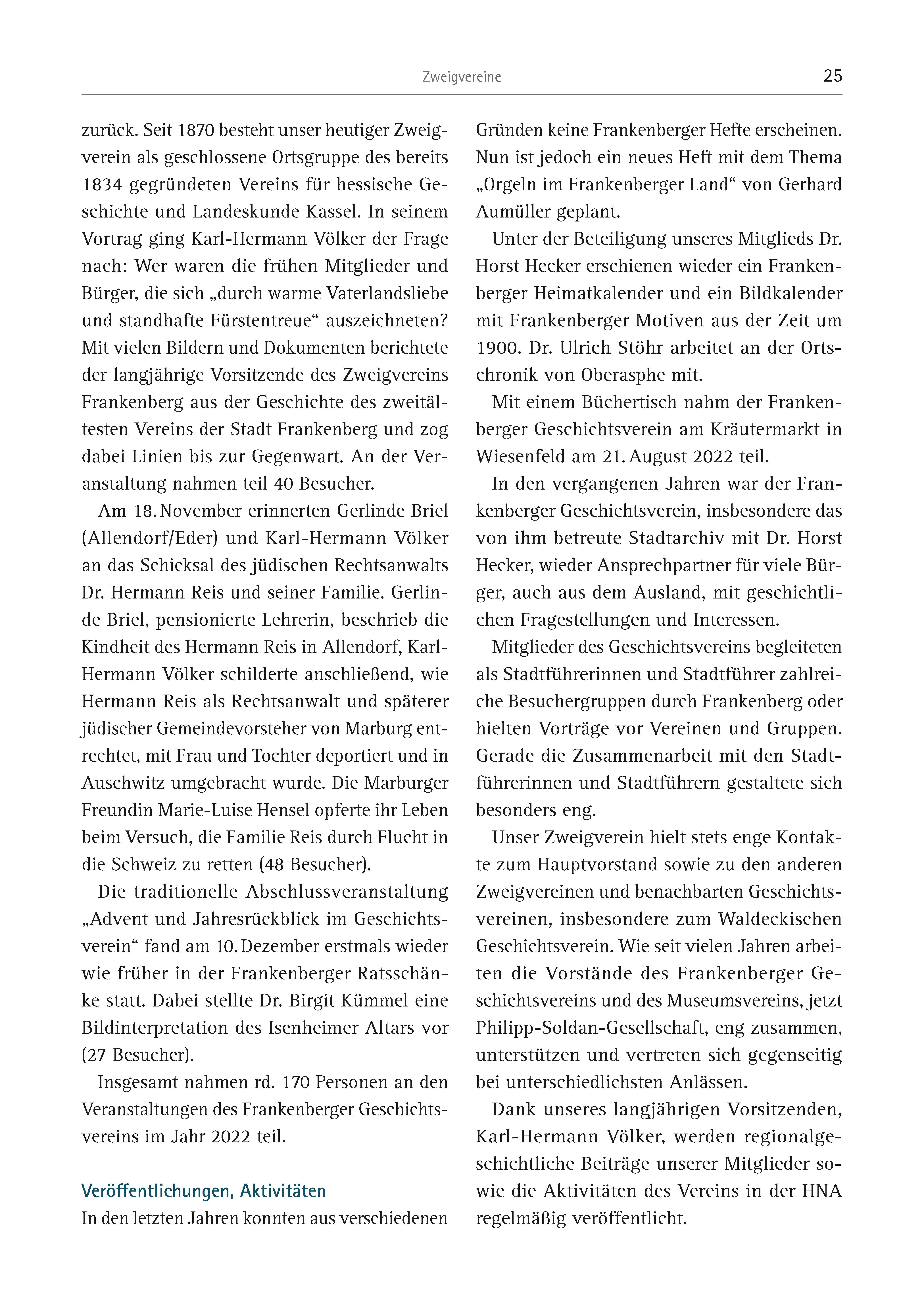 Zweigvereine 25 zurück. Seit 1870 besteht unser heutiger Zweigverein als geschlossene Ortsgruppe des bereits 1834 gegründeten Vereins für hessische Geschichte und Landeskunde Kassel. In seinem Vortrag ging Karl-Hermann Völker der Frage nach: Wer waren die frühen Mitglieder und Bürger, die sich „durch warme Vaterlandsliebe und standhafte Fürstentreue“ auszeichneten? Mit vielen Bildern und Dokumenten berichtete der langjährige Vorsitzende des Zweigvereins Frankenberg aus der Geschichte des zweitältesten Vereins der Stadt Frankenberg und zog dabei Linien bis zur Gegenwart. An der Veranstaltung nahmen teil 40 Besucher. Am 18. November erinnerten Gerlinde Briel (Allendorf/Eder) und Karl-Hermann Völker an das Schicksal des jüdischen Rechtsanwalts Dr. Hermann Reis und seiner Familie. Gerlinde Briel, pensionierte Lehrerin, beschrieb die Kindheit des Hermann Reis in Allendorf, Karl- Hermann Völker schilderte anschließend, wie Hermann Reis als Rechtsanwalt und späterer jüdischer Gemeindevorsteher von Marburg entrechtet, mit Frau und Tochter deportiert und in Auschwitz umgebracht wurde. Die Marburger Freundin Marie-Luise Hensel opferte ihr Leben beim Versuch, die Familie Reis durch Flucht in die Schweiz zu retten (48 Besucher). Die traditionelle Abschlussveranstaltung „Advent und Jahresrückblick im Geschichtsverein“ fand am 10. Dezember erstmals wieder wie früher in der Frankenberger Ratsschänke statt. Dabei stellte Dr. Birgit Kümmel eine Bildinterpretation des Isenheimer Altars vor (27 Besucher). Insgesamt nahmen rd. 170 Personen an den Veranstaltungen des Frankenberger Geschichtsvereins im Jahr 2022 teil. Veröffentlichungen, Aktivitäten In den letzten Jahren konnten aus verschiedenen Gründen keine Frankenberger Hefte erscheinen. Nun ist jedoch ein neues Heft mit dem Thema „Orgeln im Frankenberger Land“ von Gerhard Aumüller geplant. Unter der Beteiligung unseres Mitglieds Dr. Horst Hecker erschienen wieder ein Frankenberger Heimatkalender und ein Bildkalender mit Frankenberger Motiven aus der Zeit um 1900. Dr. Ulrich Stöhr arbeitet an der Ortschronik von Oberasphe mit. Mit einem Büchertisch nahm der Frankenberger Geschichtsverein am Kräutermarkt in Wiesenfeld am 21. August 2022 teil. In den vergangenen Jahren war der Frankenberger Geschichtsverein, insbesondere das von ihm betreute Stadtarchiv mit Dr. Horst Hecker, wieder Ansprechpartner für viele Bürger, auch aus dem Ausland, mit geschichtlichen Fragestellungen und Interessen. Mitglieder des Geschichtsvereins begleiteten als Stadtführerinnen und Stadtführer zahlreiche Besuchergruppen durch Frankenberg oder hielten Vorträge vor Vereinen und Gruppen. Gerade die Zusammenarbeit mit den Stadtführerinnen und Stadtführern gestaltete sich besonders eng. Unser Zweigverein hielt stets enge Kontakte zum Hauptvorstand sowie zu den anderen Zweigvereinen und benachbarten Geschichtsvereinen, insbesondere zum Waldeckischen Geschichtsverein. Wie seit vielen Jahren arbeiten die Vorstände des Frankenberger Geschichtsvereins und des Museumsvereins, jetzt Philipp-Soldan-Gesellschaft, eng zusammen, unterstützen und vertreten sich gegenseitig bei unterschiedlichsten Anlässen. Dank unseres langjährigen Vorsitzenden, Karl-Hermann Völker, werden regionalgeschichtliche Beiträge unserer Mitglieder sowie die Aktivitäten des Vereins in der HNA regelmäßig veröffentlicht.