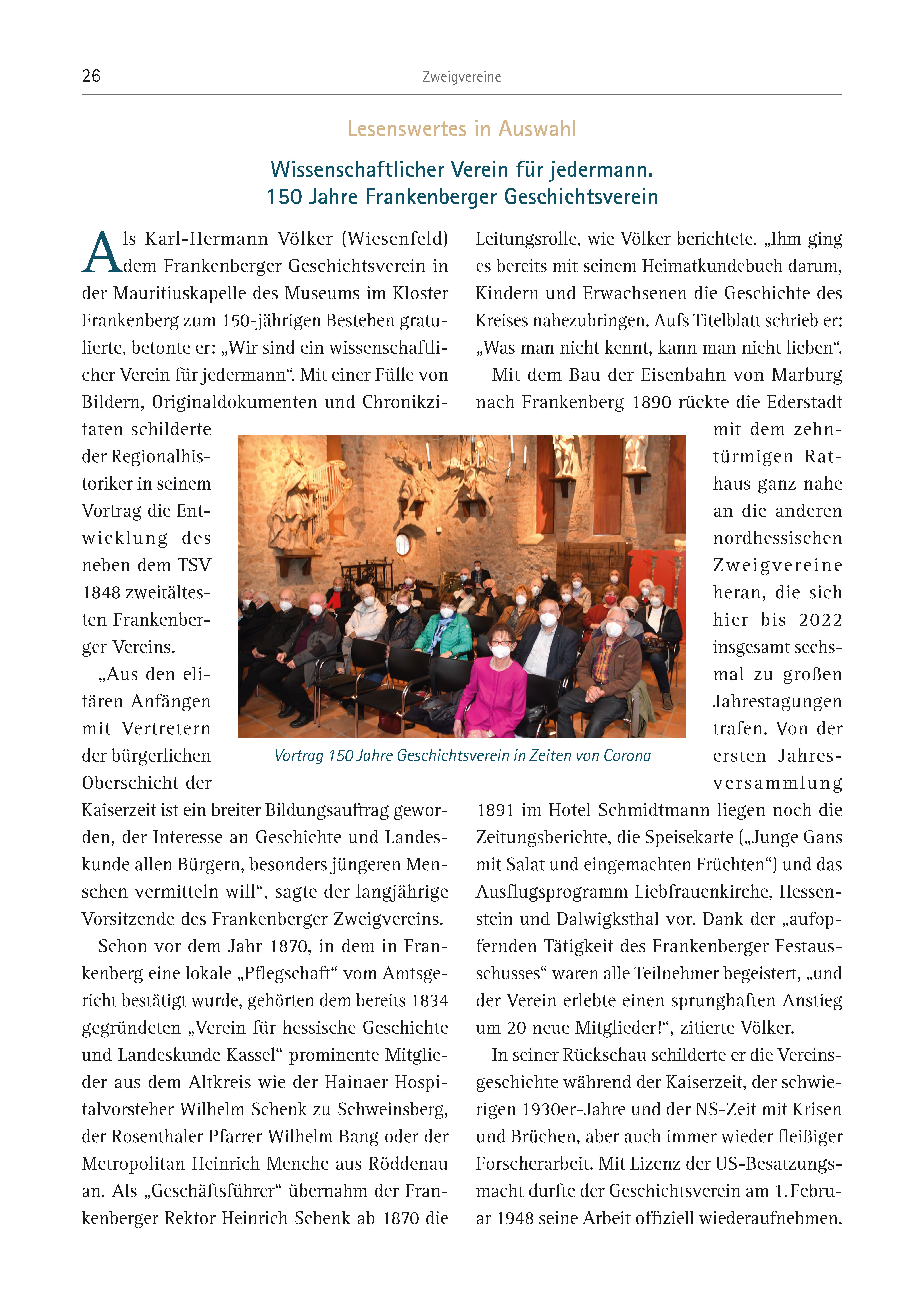 26 Zweigvereine Als Karl-Hermann Völker (Wiesenfeld) dem Frankenberger Geschichtsverein in der Mauritiuskapelle des Museums im Kloster Frankenberg zum 150-jährigen Bestehen gratulierte, betonte er: „Wir sind ein wissenschaftlicher Verein für jedermann“. Mit einer Fülle von Bildern, Originaldokumenten und Chronikzitaten schilderte der Regionalhistoriker in seinem Vortrag die Entwicklung des neben dem TSV 1848 zweitältesten Frankenberger Vereins. „Aus den elitären Anfängen mit Vertretern der bürgerlichen Oberschicht der Kaiserzeit ist ein breiter Bildungsauftrag geworden, der Interesse an Geschichte und Landeskunde allen Bürgern, besonders jüngeren Menschen vermitteln will“, sagte der langjährige Vorsitzende des Frankenberger Zweigvereins. Schon vor dem Jahr 1870, in dem in Frankenberg eine lokale „Pflegschaft“ vom Amtsgericht bestätigt wurde, gehörten dem bereits 1834 gegründeten „Verein für hessische Geschichte und Landeskunde Kassel“ prominente Mitglieder aus dem Altkreis wie der Hainaer Hospitalvorsteher Wilhelm Schenk zu Schweinsberg, der Rosenthaler Pfarrer Wilhelm Bang oder der Metropolitan Heinrich Menche aus Röddenau an. Als „Geschäftsführer“ übernahm der Frankenberger Rektor Heinrich Schenk ab 1870 die Leitungsrolle, wie Völker berichtete. „Ihm ging es bereits mit seinem Heimatkundebuch darum, Kindern und Erwachsenen die Geschichte des Kreises nahezubringen. Aufs Titelblatt schrieb er: „Was man nicht kennt, kann man nicht lieben“. Mit dem Bau der Eisenbahn von Marburg nach Frankenberg 1890 rückte die Ederstadt mit dem zehntürmigen Rathaus ganz nahe an die anderen nordhessischen Zweigvereine heran, die sich hier bis 2022 insgesamt sechsmal zu großen Jahrestagungen trafen. Von der ersten Jahresversammlung 1891 im Hotel Schmidtmann liegen noch die Zeitungsberichte, die Speisekarte („Junge Gans mit Salat und eingemachten Früchten“) und das Ausflugsprogramm Liebfrauenkirche, Hessenstein und Dalwigksthal vor. Dank der „aufopfernden Tätigkeit des Frankenberger Festausschusses“ waren alle Teilnehmer begeistert, „und der Verein erlebte einen sprunghaften Anstieg um 20 neue Mitglieder!“, zitierte Völker. In seiner Rückschau schilderte er die Vereinsgeschichte während der Kaiserzeit, der schwierigen 1930er-Jahre und der NS-Zeit mit Krisen und Brüchen, aber auch immer wieder fleißiger Forscherarbeit. Mit Lizenz der US-Besatzungsmacht durfte der Geschichtsverein am 1. Februar 1948 seine Arbeit offiziell wiederaufnehmen. Lesenswertes in Auswahl Wissenschaftlicher Verein für jedermann. 150 Jahre Frankenberger Geschichtsverein Vortrag 150 Jahre Geschichtsverein in Zeiten von Corona