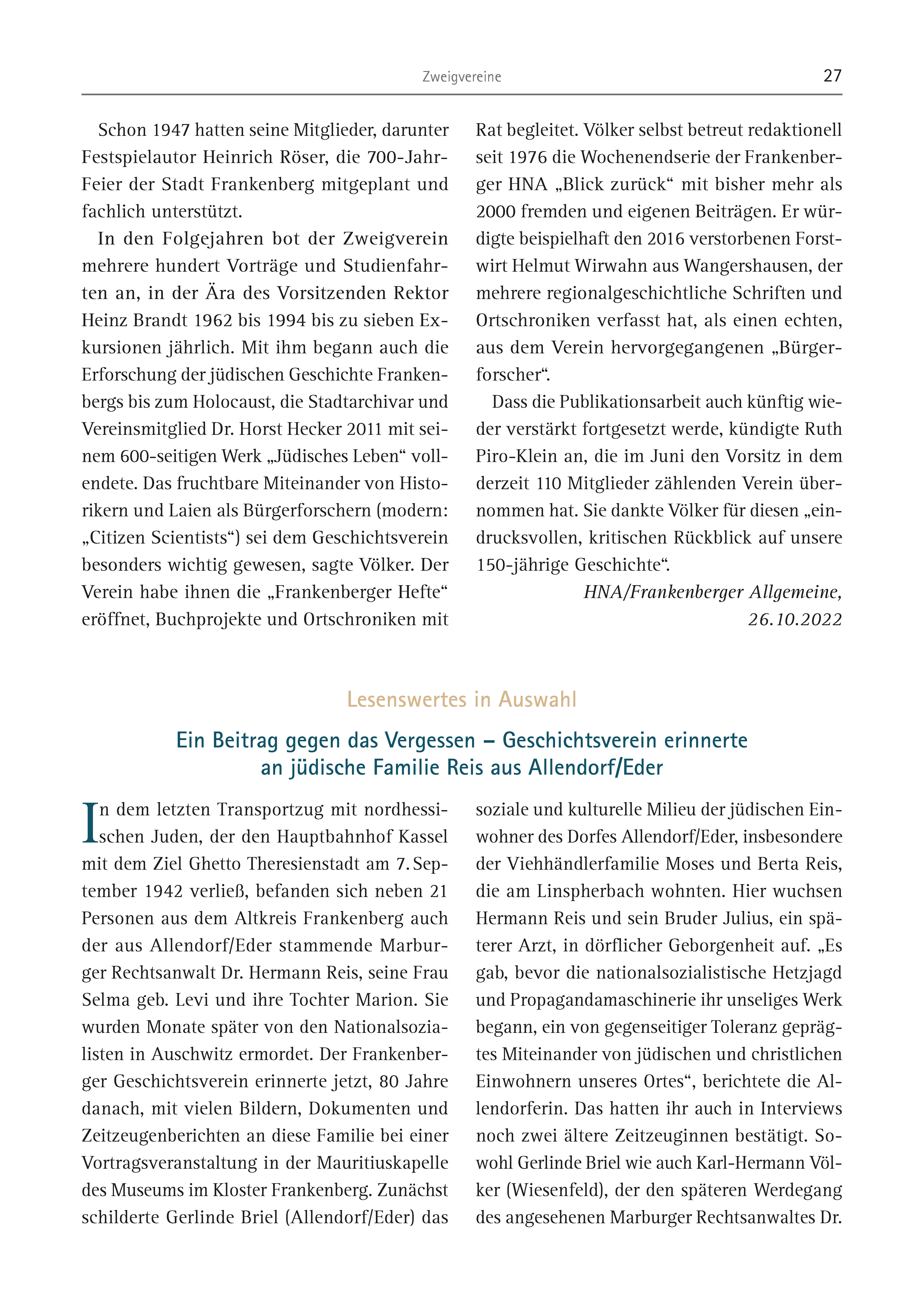 Zweigvereine 27 Schon 1947 hatten seine Mitglieder, darunter Festspielautor Heinrich Röser, die 700-Jahr- Feier der Stadt Frankenberg mitgeplant und fachlich unterstützt. In den Folgejahren bot der Zweigverein mehrere hundert Vorträge und Studienfahrten an, in der Ära des Vorsitzenden Rektor Heinz Brandt 1962 bis 1994 bis zu sieben Exkursionen jährlich. Mit ihm begann auch die Erforschung der jüdischen Geschichte Frankenbergs bis zum Holocaust, die Stadtarchivar und Vereinsmitglied Dr. Horst Hecker 2011 mit seinem 600-seitigen Werk „Jüdisches Leben“ vollendete. Das fruchtbare Miteinander von Historikern und Laien als Bürgerforschern (modern: „Citizen Scientists“) sei dem Geschichtsverein besonders wichtig gewesen, sagte Völker. Der Verein habe ihnen die „Frankenberger Hefte“ eröffnet, Buchprojekte und Ortschroniken mit Rat begleitet. Völker selbst betreut redaktionell seit 1976 die Wochenendserie der Frankenberger HNA „Blick zurück“ mit bisher mehr als 2000 fremden und eigenen Beiträgen. Er würdigte beispielhaft den 2016 verstorbenen Forstwirt Helmut Wirwahn aus Wangershausen, der mehrere regionalgeschichtliche Schriften und Ortschroniken verfasst hat, als einen echten, aus dem Verein hervorgegangenen „Bürgerforscher“. Dass die Publikationsarbeit auch künftig wieder verstärkt fortgesetzt werde, kündigte Ruth Piro-Klein an, die im Juni den Vorsitz in dem derzeit 110 Mitglieder zählenden Verein übernommen hat. Sie dankte Völker für diesen „eindrucksvollen, kritischen Rückblick auf unsere 150-jährige Geschichte“. HNA/Frankenberger Allgemeine, 26.10.2022 In dem letzten Transportzug mit nordhessischen Juden, der den Hauptbahnhof Kassel mit dem Ziel Ghetto Theresienstadt am 7. September 1942 verließ, befanden sich neben 21 Personen aus dem Altkreis Frankenberg auch der aus Allendorf/Eder stammende Marburger Rechtsanwalt Dr. Hermann Reis, seine Frau Selma geb. Levi und ihre Tochter Marion. Sie wurden Monate später von den Nationalsozialisten in Auschwitz ermordet. Der Frankenberger Geschichtsverein erinnerte jetzt, 80 Jahre danach, mit vielen Bildern, Dokumenten und Zeitzeugenberichten an diese Familie bei einer Vortragsveranstaltung in der Mauritiuskapelle des Museums im Kloster Frankenberg. Zunächst schilderte Gerlinde Briel (Allendorf/Eder) das soziale und kulturelle Milieu der jüdischen Einwohner des Dorfes Allendorf/Eder, insbesondere der Viehhändlerfamilie Moses und Berta Reis, die am Linspherbach wohnten. Hier wuchsen Hermann Reis und sein Bruder Julius, ein späterer Arzt, in dörflicher Geborgenheit auf. „Es gab, bevor die nationalsozialistische Hetzjagd und Propagandamaschinerie ihr unseliges Werk begann, ein von gegenseitiger Toleranz geprägtes Miteinander von jüdischen und christlichen Einwohnern unseres Ortes“, berichtete die Allendorferin. Das hatten ihr auch in Interviews noch zwei ältere Zeitzeuginnen bestätigt. Sowohl Gerlinde Briel wie auch Karl-Hermann Völker (Wiesenfeld), der den späteren Werdegang des angesehenen Marburger Rechtsanwaltes Dr. Lesenswertes in Auswahl Ein Beitrag gegen das Vergessen – Geschichtsverein erinnerte an jüdische Familie Reis aus Allendorf/Eder