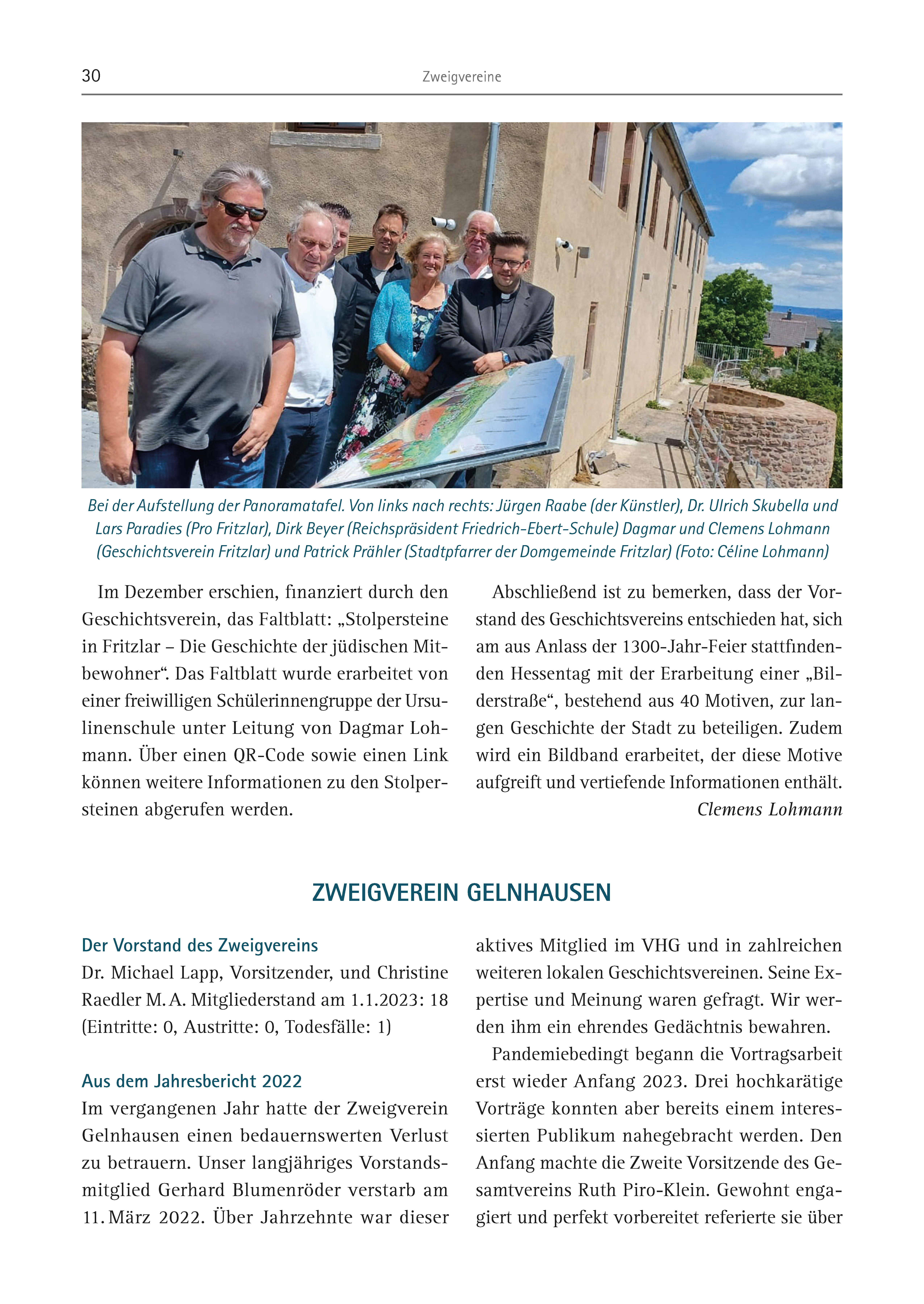 30 Zweigvereine Im Dezember erschien, finanziert durch den Geschichtsverein, das Faltblatt: „Stolpersteine in Fritzlar – Die Geschichte der jüdischen Mitbewohner“. Das Faltblatt wurde erarbeitet von einer freiwilligen Schülerinnengruppe der Ursulinenschule unter Leitung von Dagmar Lohmann. Über einen QR-Code sowie einen Link können weitere Informationen zu den Stolpersteinen abgerufen werden. Abschließend ist zu bemerken, dass der Vorstand des Geschichtsvereins entschieden hat, sich am aus Anlass der 1300-Jahr-Feier stattfindenden Hessentag mit der Erarbeitung einer „Bilderstraße“, bestehend aus 40 Motiven, zur langen Geschichte der Stadt zu beteiligen. Zudem wird ein Bildband erarbeitet, der diese Motive aufgreift und vertiefende Informationen enthält. Clemens Lohmann Der Vorstand des Zweigvereins Dr. Michael Lapp, Vorsitzender, und Christine Raedler M. A. Mitgliederstand am 1.1.2023: 18 (Eintritte: 0, Austritte: 0, Todesfälle: 1) Aus dem Jahresbericht 2022 Im vergangenen Jahr hatte der Zweigverein Gelnhausen einen bedauernswerten Verlust zu betrauern. Unser langjähriges Vorstandsmitglied Gerhard Blumenröder verstarb am 11. März 2022. Über Jahrzehnte war dieser aktives Mitglied im VHG und in zahlreichen weiteren lokalen Geschichtsvereinen. Seine Expertise und Meinung waren gefragt. Wir werden ihm ein ehrendes Gedächtnis bewahren. Pandemiebedingt begann die Vortragsarbeit erst wieder Anfang 2023. Drei hochkarätige Vorträge konnten aber bereits einem interessierten Publikum nahegebracht werden. Den Anfang machte die Zweite Vorsitzende des Gesamtvereins Ruth Piro-Klein. Gewohnt engagiert und perfekt vorbereitet referierte sie über ZWEIGVEREIN GELNHAUSEN Bei der Aufstellung der Panoramatafel. Von links nach rechts: Jürgen Raabe (der Künstler), Dr. Ulrich Skubella und Lars Paradies (Pro Fritzlar), Dirk Beyer (Reichspräsident Friedrich-Ebert-Schule) Dagmar und Clemens Lohmann (Geschichtsverein Fritzlar) und Patrick Prähler (Stadtpfarrer der Domgemeinde Fritzlar) (Foto: Céline Lohmann)