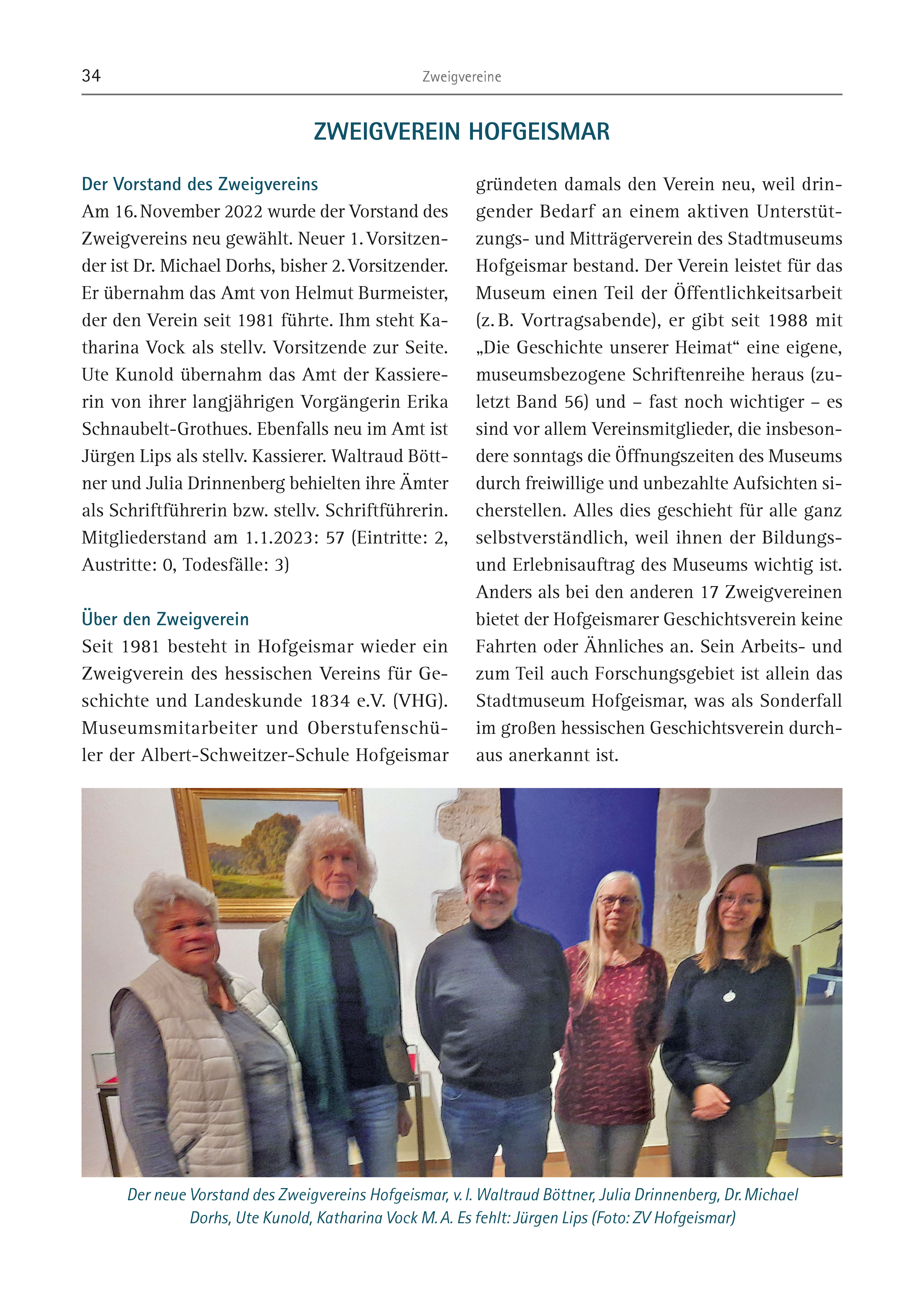 34 Zweigvereine Der Vorstand des Zweigvereins Am 16. November 2022 wurde der Vorstand des Zweigvereins neu gewählt. Neuer 1. Vorsitzender ist Dr. Michael Dorhs, bisher 2. Vorsitzender. Er übernahm das Amt von Helmut Burmeister, der den Verein seit 1981 führte. Ihm steht Katharina Vock als stellv. Vorsitzende zur Seite. Ute Kunold übernahm das Amt der Kassiererin von ihrer langjährigen Vorgängerin Erika Schnaubelt-Grothues. Ebenfalls neu im Amt ist Jürgen Lips als stellv. Kassierer. Waltraud Böttner und Julia Drinnenberg behielten ihre Ämter als Schriftführerin bzw. stellv. Schriftführerin. Mitgliederstand am 1.1.2023: 57 (Eintritte: 2, Austritte: 0, Todesfälle: 3) Über den Zweigverein Seit 1981 besteht in Hofgeismar wieder ein Zweigverein des hessischen Vereins für Geschichte und Landeskunde 1834 e.V. (VHG). Museumsmitarbeiter und Oberstufenschüler der Albert-Schweitzer-Schule Hofgeismar ZWEIGVEREIN HOFGEISMAR gründeten damals den Verein neu, weil dringender Bedarf an einem aktiven Unterstützungs- und Mitträgerverein des Stadtmuseums Hofgeismar bestand. Der Verein leistet für das Museum einen Teil der Öffentlichkeitsarbeit (z. B. Vortragsabende), er gibt seit 1988 mit „Die Geschichte unserer Heimat“ eine eigene, museumsbezogene Schriftenreihe heraus (zuletzt Band 56) und – fast noch wichtiger – es sind vor allem Vereinsmitglieder, die insbesondere sonntags die Öffnungszeiten des Museums durch freiwillige und unbezahlte Aufsichten sicherstellen. Alles dies geschieht für alle ganz selbstverständlich, weil ihnen der Bildungsund Erlebnisauftrag des Museums wichtig ist. Anders als bei den anderen 17 Zweigvereinen bietet der Hofgeismarer Geschichtsverein keine Fahrten oder Ähnliches an. Sein Arbeits- und zum Teil auch Forschungsgebiet ist allein das Stadtmuseum Hofgeismar, was als Sonderfall im großen hessischen Geschichtsverein durchaus anerkannt ist. Der neue Vorstand des Zweigvereins Hofgeismar, v. l. Waltraud Böttner, Julia Drinnenberg, Dr. Michael Dorhs, Ute Kunold, Katharina Vock M. A. Es fehlt: Jürgen Lips (Foto: ZV Hofgeismar)
