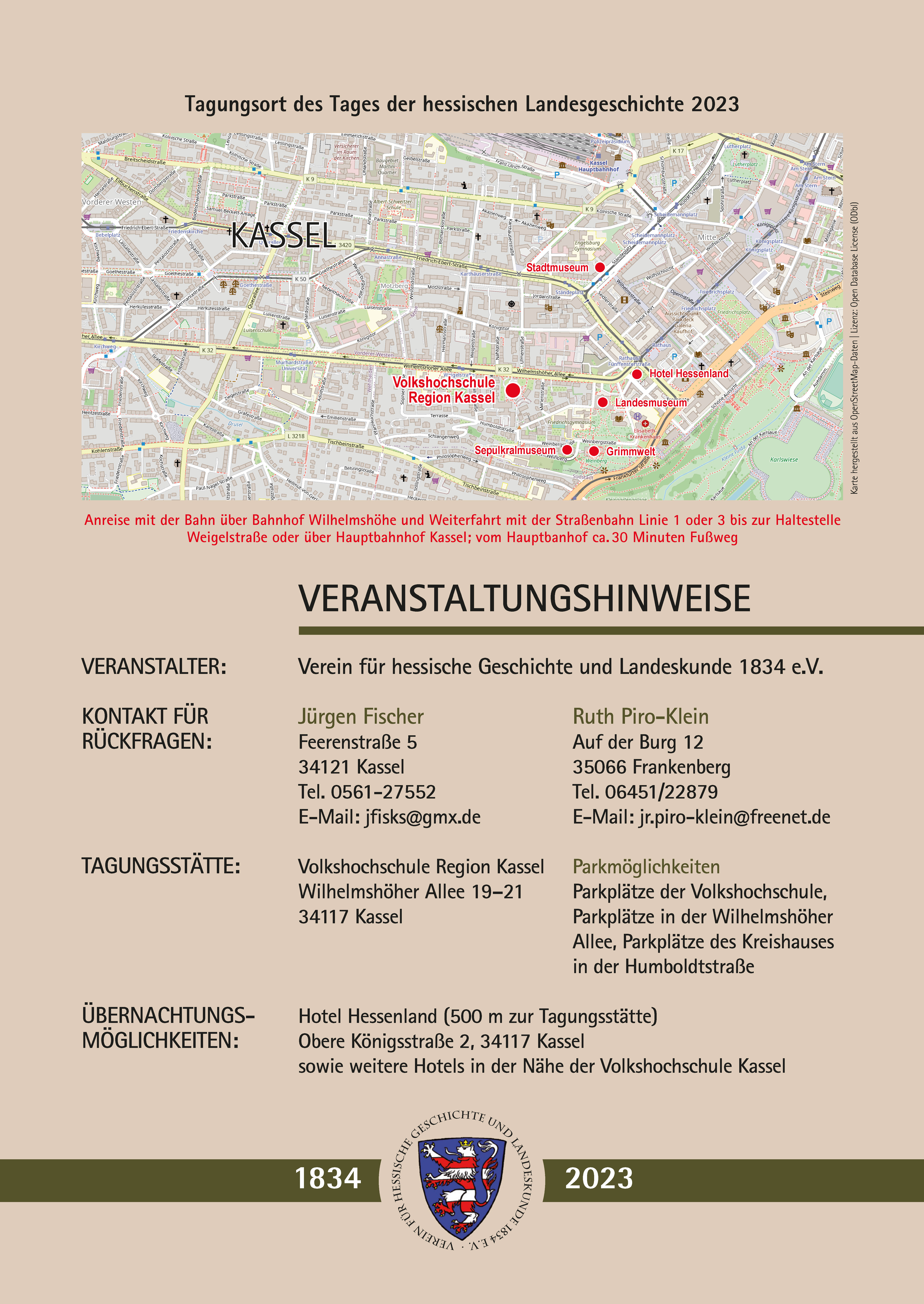 40 Zweigvereine VEREIN FÜR HESSISCHE GESCHICHTE UND LANDESKUNDE 1834 E.V. · VERANSTALTUNGSHINWEISE Tagungsort des Tages der hessischen Landesgeschichte 2023 Anreise mit der Bahn über Bahnhof Wilhelmshöhe und Weiterfahrt mit der Straßenbahn Linie 1 oder 3 bis zur Haltestelle Weigelstraße oder über Hauptbahnhof Kassel; vom Hauptbanhof ca. 30 Minuten Fußweg VERANSTALTER: Verein für hessische Geschichte und Landeskunde 1834 e.V. KONTAKT FÜR Jürgen Fischer Ruth Piro-Klein RÜCKFRAGEN: Feerenstraße 5 Auf der Burg 12 34121 Kassel 35066 Frankenberg Tel. 0561-27552 Tel. 06451/22879 E-Mail: jfi sks@gmx.de E-Mail: jr.piro-klein@freenet.de TAGUNGSSTÄTTE: Volkshochschule Region Kassel Parkmöglichkeiten Wilhelmshöher Allee 19–21 Parkplätze der Volkshochschule, 34117 Kassel Parkplätze in der Wilhelmshöher Allee, Parkplätze des Kreishauses in der Humboldtstraße ÜBERNACHTUNGS- Hotel Hessenland (500 m zur Tagungsstätte) MÖGLICHKEITEN: Obere Königsstraße 2, 34117 Kassel sowie weitere Hotels in der Nähe der Volkshochschule Kassel 1834 2023 Karte hergestellt aus OpenStreetMap-Daten | Lizenz: Open Database License (ODbl) Volkshochschule Region Kassel Landesmuseum Stadtmuseum Hotel Hessenland Sepulkralmuseum Grimmwelt