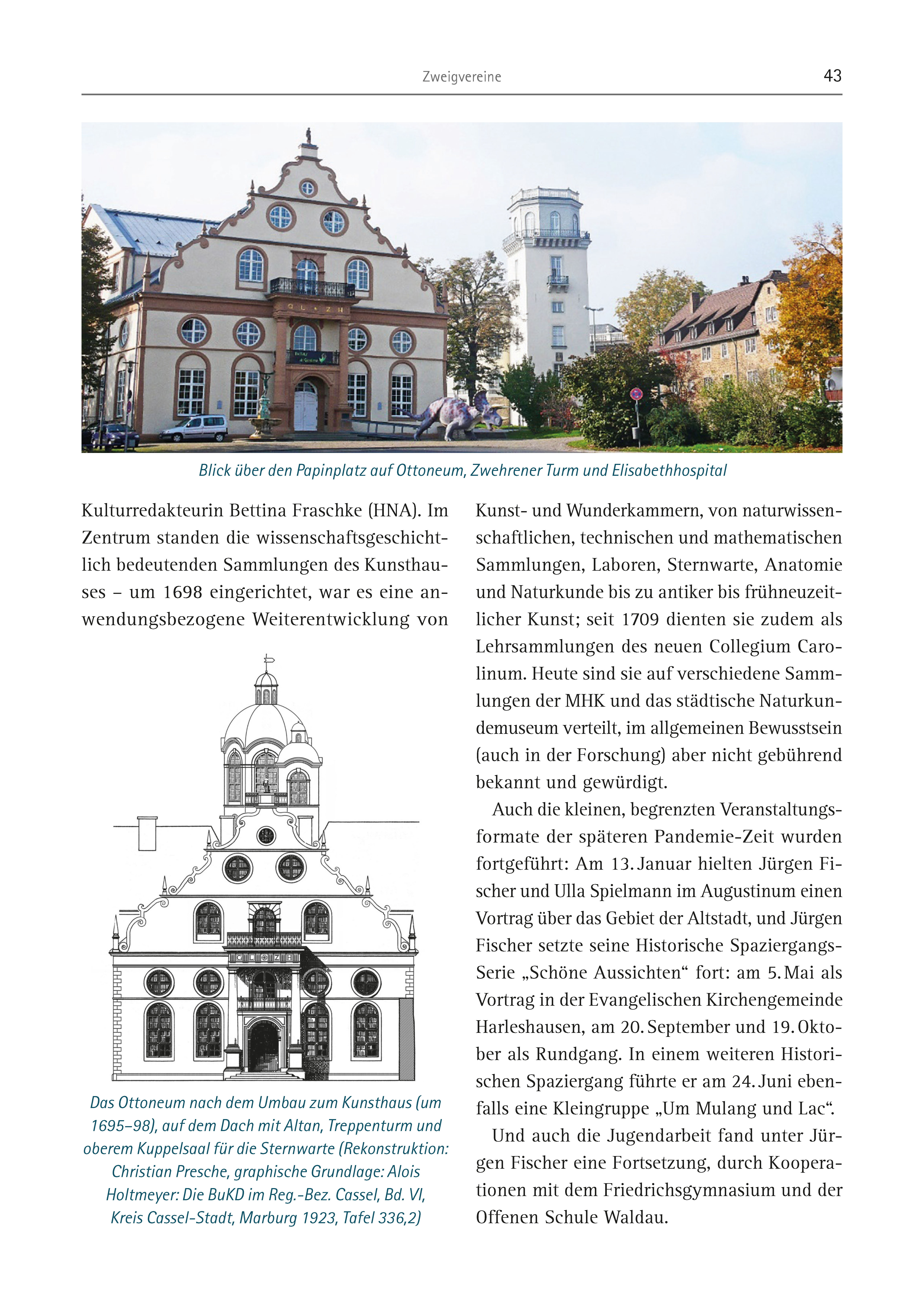 Zweigvereine 43 Kulturredakteurin Bettina Fraschke (HNA). Im Zentrum standen die wissenschaftsgeschichtlich bedeutenden Sammlungen des Kunsthauses – um 1698 eingerichtet, war es eine anwendungsbezogene Weiterentwicklung von Kunst- und Wunderkammern, von naturwissenschaftlichen, technischen und mathematischen Sammlungen, Laboren, Sternwarte, Anatomie und Naturkunde bis zu antiker bis frühneuzeitlicher Kunst; seit 1709 dienten sie zudem als Lehrsammlungen des neuen Collegium Carolinum. Heute sind sie auf verschiedene Sammlungen der MHK und das städtische Naturkundemuseum verteilt, im allgemeinen Bewusstsein (auch in der Forschung) aber nicht gebührend bekannt und gewürdigt. Auch die kleinen, begrenzten Veranstaltungsformate der späteren Pandemie-Zeit wurden fortgeführt: Am 13. Januar hielten Jürgen Fischer und Ulla Spielmann im Augustinum einen Vortrag über das Gebiet der Altstadt, und Jürgen Fischer setzte seine Historische Spaziergangs- Serie „Schöne Aussichten“ fort: am 5. Mai als Vortrag in der Evangelischen Kirchengemeinde Harleshausen, am 20. September und 19. Oktober als Rundgang. In einem weiteren Historischen Spaziergang führte er am 24. Juni ebenfalls eine Kleingruppe „Um Mulang und Lac“. Und auch die Jugendarbeit fand unter Jürgen Fischer eine Fortsetzung, durch Kooperationen mit dem Friedrichsgymnasium und der Offenen Schule Waldau. Blick über den Papinplatz auf Ottoneum, Zwehrener Turm und Elisabethhospital Das Ottoneum nach dem Umbau zum Kunsthaus (um 1695–98), auf dem Dach mit Altan, Treppenturm und oberem Kuppelsaal für die Sternwarte (Rekonstruktion: Christian Presche, graphische Grundlage: Alois Holtmeyer: Die BuKD im Reg.-Bez. Cassel, Bd. VI, Kreis Cassel-Stadt, Marburg 1923, Tafel 336,2)