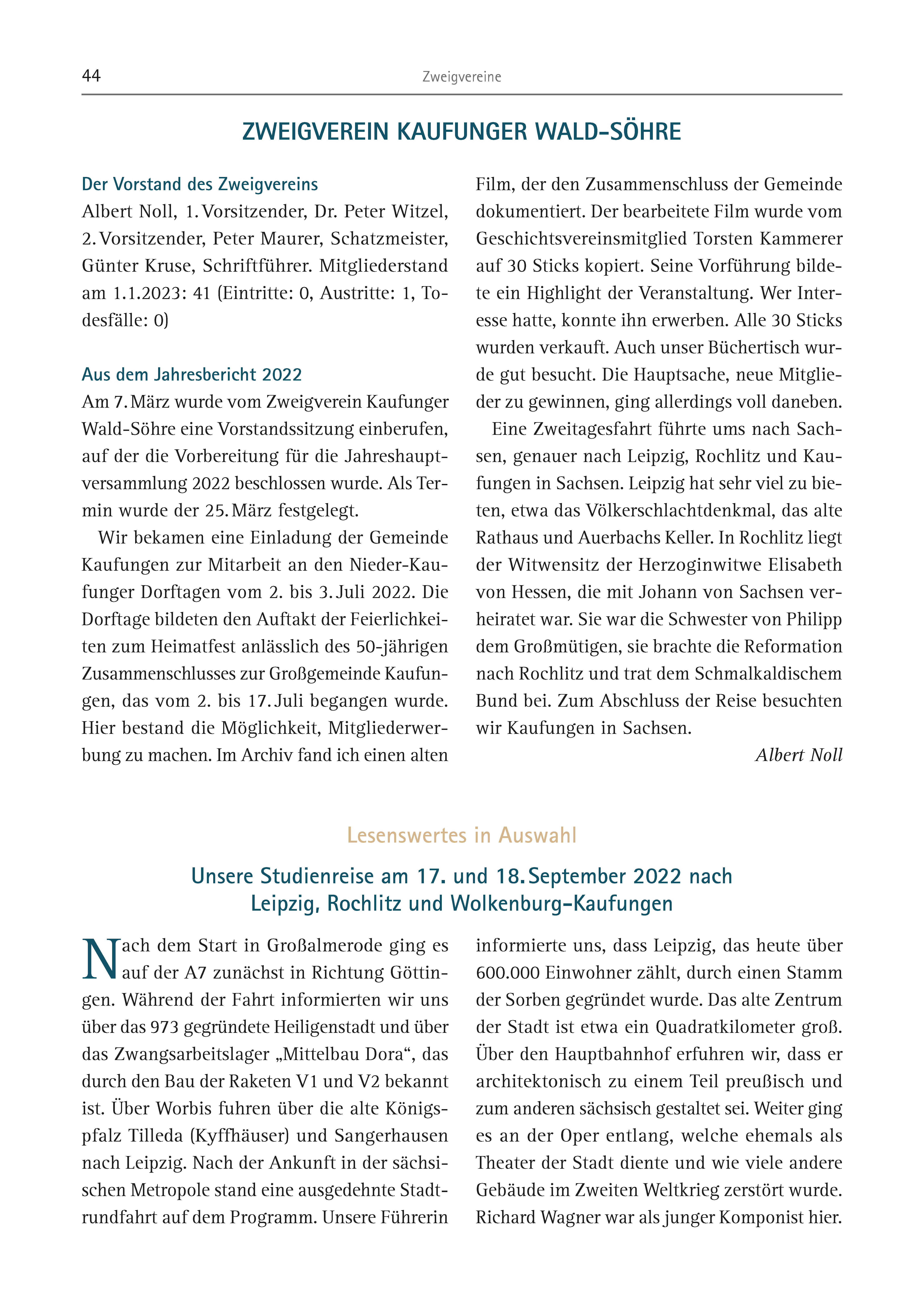 44 Zweigvereine ZWEIGVEREIN KAUFUNGER WALD-SÖHRE Der Vorstand des Zweigvereins Albert Noll, 1. Vorsitzender, Dr. Peter Witzel, 2. Vorsitzender, Peter Maurer, Schatzmeister, Günter Kruse, Schriftführer. Mitgliederstand am 1.1.2023: 41 (Eintritte: 0, Austritte: 1, Todesfälle: 0) Aus dem Jahresbericht 2022 Am 7. März wurde vom Zweigverein Kaufunger Wald-Söhre eine Vorstandssitzung einberufen, auf der die Vorbereitung für die Jahreshauptversammlung 2022 beschlossen wurde. Als Termin wurde der 25. März festgelegt. Wir bekamen eine Einladung der Gemeinde Kaufungen zur Mitarbeit an den Nieder-Kaufunger Dorftagen vom 2. bis 3. Juli 2022. Die Dorftage bildeten den Auftakt der Feierlichkeiten zum Heimatfest anlässlich des 50-jährigen Zusammenschlusses zur Großgemeinde Kaufungen, das vom 2. bis 17. Juli begangen wurde. Hier bestand die Möglichkeit, Mitgliederwerbung zu machen. Im Archiv fand ich einen alten Film, der den Zusammenschluss der Gemeinde dokumentiert. Der bearbeitete Film wurde vom Geschichtsvereinsmitglied Torsten Kammerer auf 30 Sticks kopiert. Seine Vorführung bildete ein Highlight der Veranstaltung. Wer Interesse hatte, konnte ihn erwerben. Alle 30 Sticks wurden verkauft. Auch unser Büchertisch wurde gut besucht. Die Hauptsache, neue Mitglieder zu gewinnen, ging allerdings voll daneben. Eine Zweitagesfahrt führte ums nach Sachsen, genauer nach Leipzig, Rochlitz und Kaufungen in Sachsen. Leipzig hat sehr viel zu bieten, etwa das Völkerschlachtdenkmal, das alte Rathaus und Auerbachs Keller. In Rochlitz liegt der Witwensitz der Herzoginwitwe Elisabeth von Hessen, die mit Johann von Sachsen verheiratet war. Sie war die Schwester von Philipp dem Großmütigen, sie brachte die Reformation nach Rochlitz und trat dem Schmalkaldischem Bund bei. Zum Abschluss der Reise besuchten wir Kaufungen in Sachsen. Albert Noll Nach dem Start in Großalmerode ging es auf der A7 zunächst in Richtung Göttingen. Während der Fahrt informierten wir uns über das 973 gegründete Heiligenstadt und über das Zwangsarbeitslager „Mittelbau Dora“, das durch den Bau der Raketen V1 und V2 bekannt ist. Über Worbis fuhren über die alte Königspfalz Tilleda (Kyffhäuser) und Sangerhausen nach Leipzig. Nach der Ankunft in der sächsischen Metropole stand eine ausgedehnte Stadtrundfahrt auf dem Programm. Unsere Führerin informierte uns, dass Leipzig, das heute über 600.000 Einwohner zählt, durch einen Stamm der Sorben gegründet wurde. Das alte Zentrum der Stadt ist etwa ein Quadratkilometer groß. Über den Hauptbahnhof erfuhren wir, dass er architektonisch zu einem Teil preußisch und zum anderen sächsisch gestaltet sei. Weiter ging es an der Oper entlang, welche ehemals als Theater der Stadt diente und wie viele andere Gebäude im Zweiten Weltkrieg zerstört wurde. Richard Wagner war als junger Komponist hier. Lesenswertes in Auswahl Unsere Studienreise am 17. und 18. September 2022 nach Leipzig, Rochlitz und Wolkenburg-Kaufungen