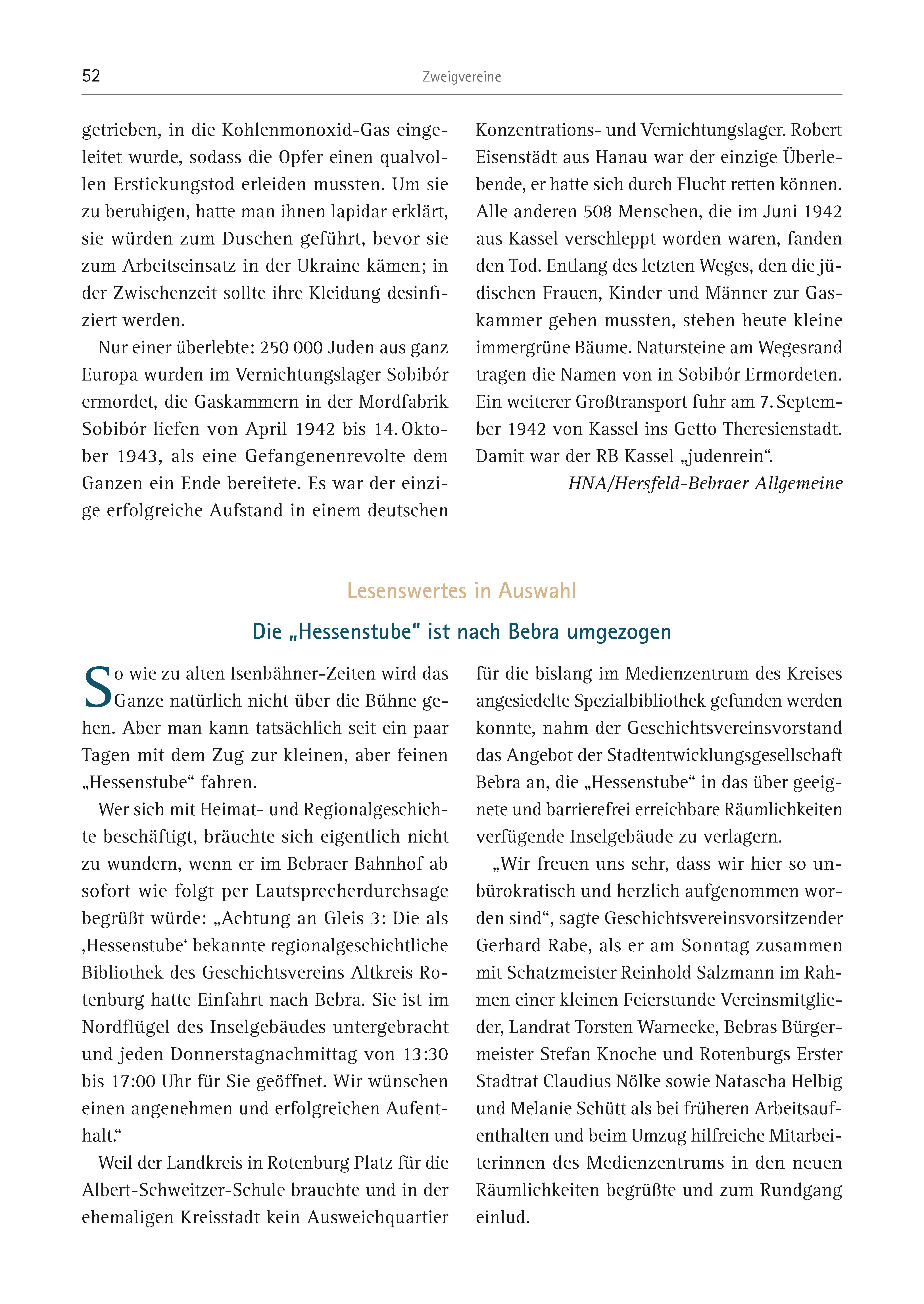 52 Zweigvereine getrieben, in die Kohlenmonoxid-Gas eingeleitet wurde, sodass die Opfer einen qualvollen Erstickungstod erleiden mussten. Um sie zu beruhigen, hatte man ihnen lapidar erklärt, sie würden zum Duschen geführt, bevor sie zum Arbeitseinsatz in der Ukraine kämen; in der Zwischenzeit sollte ihre Kleidung desinfiziert werden. Nur einer überlebte: 250 000 Juden aus ganz Europa wurden im Vernichtungslager Sobibór ermordet, die Gaskammern in der Mordfabrik Sobibór liefen von April 1942 bis 14. Oktober 1943, als eine Gefangenenrevolte dem Ganzen ein Ende bereitete. Es war der einzige erfolgreiche Aufstand in einem deutschen Konzentrations- und Vernichtungslager. Robert Eisenstädt aus Hanau war der einzige Überlebende, er hatte sich durch Flucht retten können. Alle anderen 508 Menschen, die im Juni 1942 aus Kassel verschleppt worden waren, fanden den Tod. Entlang des letzten Weges, den die jüdischen Frauen, Kinder und Männer zur Gaskammer gehen mussten, stehen heute kleine immergrüne Bäume. Natursteine am Wegesrand tragen die Namen von in Sobibór Ermordeten. Ein weiterer Großtransport fuhr am 7. September 1942 von Kassel ins Getto Theresienstadt. Damit war der RB Kassel „judenrein“. HNA/Hersfeld-Bebraer Allgemeine So wie zu alten Isenbähner-Zeiten wird das Ganze natürlich nicht über die Bühne gehen. Aber man kann tatsächlich seit ein paar Tagen mit dem Zug zur kleinen, aber feinen „Hessenstube“ fahren. Wer sich mit Heimat- und Regionalgeschichte beschäftigt, bräuchte sich eigentlich nicht zu wundern, wenn er im Bebraer Bahnhof ab sofort wie folgt per Lautsprecherdurchsage begrüßt würde: „Achtung an Gleis 3: Die als ,Hessenstube‘ bekannte regionalgeschichtliche Bibliothek des Geschichtsvereins Altkreis Rotenburg hatte Einfahrt nach Bebra. Sie ist im Nordflügel des Inselgebäudes untergebracht und jeden Donnerstagnachmittag von 13:30 bis 17:00 Uhr für Sie geöffnet. Wir wünschen einen angenehmen und erfolgreichen Aufenthalt.“ Weil der Landkreis in Rotenburg Platz für die Albert-Schweitzer-Schule brauchte und in der ehemaligen Kreisstadt kein Ausweichquartier für die bislang im Medienzentrum des Kreises angesiedelte Spezialbibliothek gefunden werden konnte, nahm der Geschichtsvereinsvorstand das Angebot der Stadtentwicklungsgesellschaft Bebra an, die „Hessenstube“ in das über geeignete und barrierefrei erreichbare Räumlichkeiten verfügende Inselgebäude zu verlagern. „Wir freuen uns sehr, dass wir hier so unbürokratisch und herzlich aufgenommen worden sind“, sagte Geschichtsvereinsvorsitzender Gerhard Rabe, als er am Sonntag zusammen mit Schatzmeister Reinhold Salzmann im Rahmen einer kleinen Feierstunde Vereinsmitglieder, Landrat Torsten Warnecke, Bebras Bürgermeister Stefan Knoche und Rotenburgs Erster Stadtrat Claudius Nölke sowie Natascha Helbig und Melanie Schütt als bei früheren Arbeitsaufenthalten und beim Umzug hilfreiche Mitarbeiterinnen des Medienzentrums in den neuen Räumlichkeiten begrüßte und zum Rundgang einlud. Lesenswertes in Auswahl Die „Hessenstube“ ist nach Bebra umgezogen
