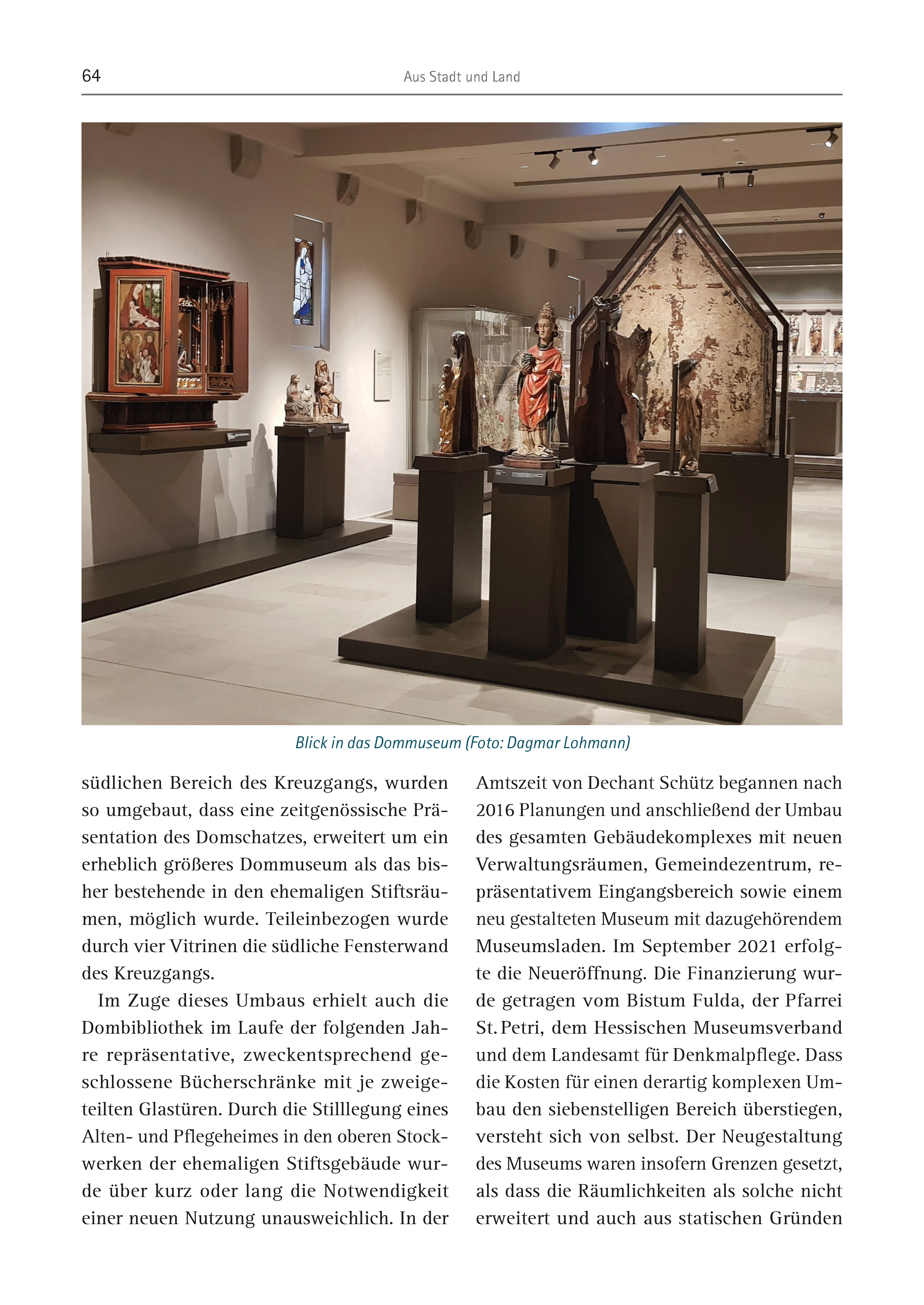 64 Aus Stadt und Land südlichen Bereich des Kreuzgangs, wurden so umgebaut, dass eine zeitgenössische Präsentation des Domschatzes, erweitert um ein erheblich größeres Dommuseum als das bisher bestehende in den ehemaligen Stiftsräumen, möglich wurde. Teileinbezogen wurde durch vier Vitrinen die südliche Fensterwand des Kreuzgangs. Im Zuge dieses Umbaus erhielt auch die Dombibliothek im Laufe der folgenden Jahre repräsentative, zweckentsprechend geschlossene Bücherschränke mit je zweigeteilten Glastüren. Durch die Stilllegung eines Alten- und Pflegeheimes in den oberen Stockwerken der ehemaligen Stiftsgebäude wurde über kurz oder lang die Notwendigkeit einer neuen Nutzung unausweichlich. In der Amtszeit von Dechant Schütz begannen nach 2016 Planungen und anschließend der Umbau des gesamten Gebäudekomplexes mit neuen Verwaltungsräumen, Gemeindezentrum, repräsentativem Eingangsbereich sowie einem neu gestalteten Museum mit dazugehörendem Museumsladen. Im September 2021 erfolgte die Neueröffnung. Die Finanzierung wurde getragen vom Bistum Fulda, der Pfarrei St. Petri, dem Hessischen Museumsverband und dem Landesamt für Denkmalpflege. Dass die Kosten für einen derartig komplexen Umbau den siebenstelligen Bereich überstiegen, versteht sich von selbst. Der Neugestaltung des Museums waren insofern Grenzen gesetzt, als dass die Räumlichkeiten als solche nicht erweitert und auch aus statischen Gründen Blick in das Dommuseum (Foto: Dagmar Lohmann)