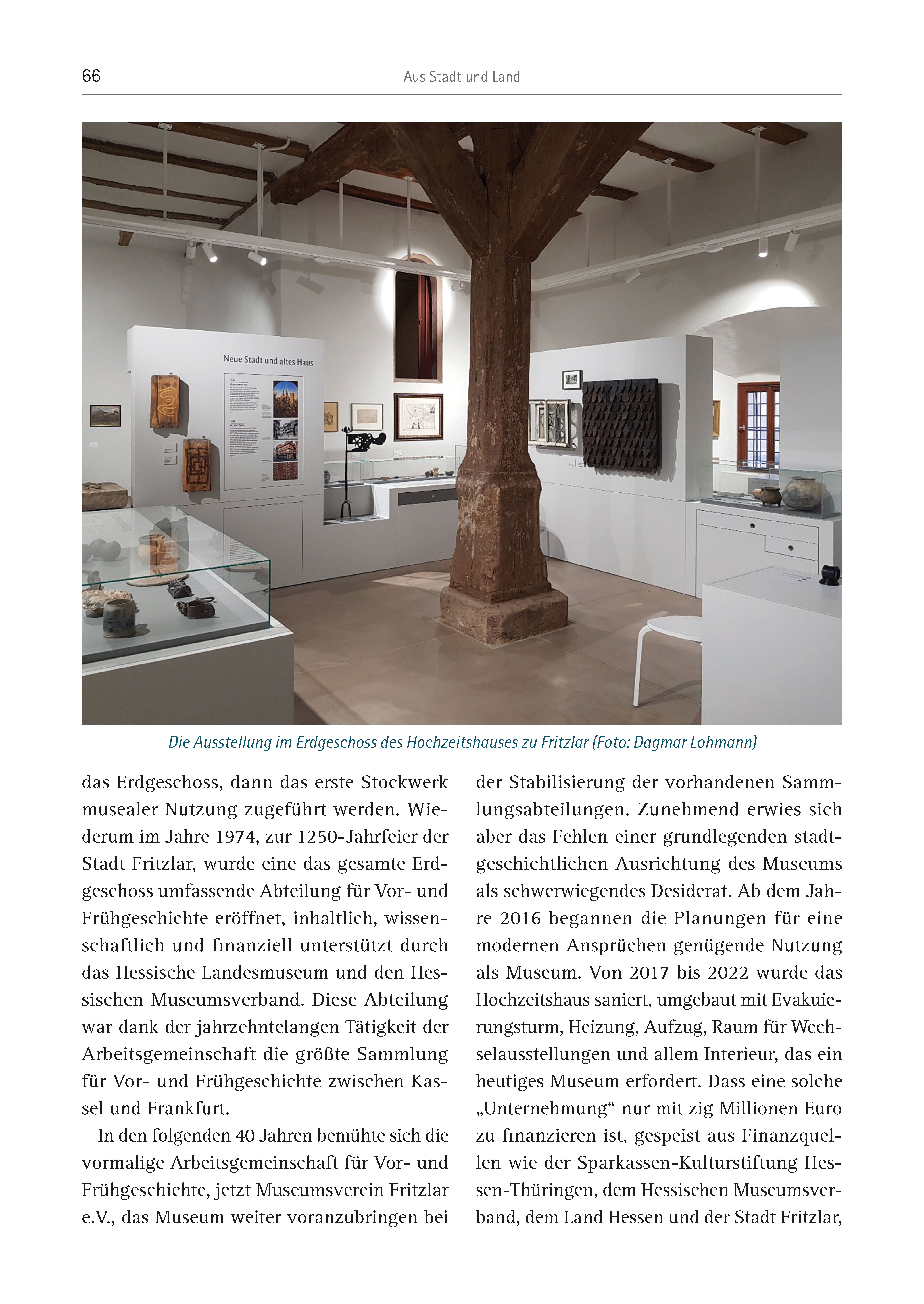 66 Aus Stadt und Land das Erdgeschoss, dann das erste Stockwerk musealer Nutzung zugeführt werden. Wiederum im Jahre 1974, zur 1250-Jahrfeier der Stadt Fritzlar, wurde eine das gesamte Erdgeschoss umfassende Abteilung für Vor- und Frühgeschichte eröffnet, inhaltlich, wissenschaftlich und finanziell unterstützt durch das Hessische Landesmuseum und den Hessischen Museumsverband. Diese Abteilung war dank der jahrzehntelangen Tätigkeit der Arbeitsgemeinschaft die größte Sammlung für Vor- und Frühgeschichte zwischen Kassel und Frankfurt. In den folgenden 40 Jahren bemühte sich die vormalige Arbeitsgemeinschaft für Vor- und Frühgeschichte, jetzt Museumsverein Fritzlar e.V., das Museum weiter voranzubringen bei der Stabilisierung der vorhandenen Sammlungsabteilungen. Zunehmend erwies sich aber das Fehlen einer grundlegenden stadtgeschichtlichen Ausrichtung des Museums als schwerwiegendes Desiderat. Ab dem Jahre 2016 begannen die Planungen für eine modernen Ansprüchen genügende Nutzung als Museum. Von 2017 bis 2022 wurde das Hochzeitshaus saniert, umgebaut mit Evakuierungsturm, Heizung, Aufzug, Raum für Wechselausstellungen und allem Interieur, das ein heutiges Museum erfordert. Dass eine solche „Unternehmung“ nur mit zig Millionen Euro zu finanzieren ist, gespeist aus Finanzquellen wie der Sparkassen-Kulturstiftung Hessen- Thüringen, dem Hessischen Museumsverband, dem Land Hessen und der Stadt Fritzlar, Die Ausstellung im Erdgeschoss des Hochzeitshauses zu Fritzlar (Foto: Dagmar Lohmann)