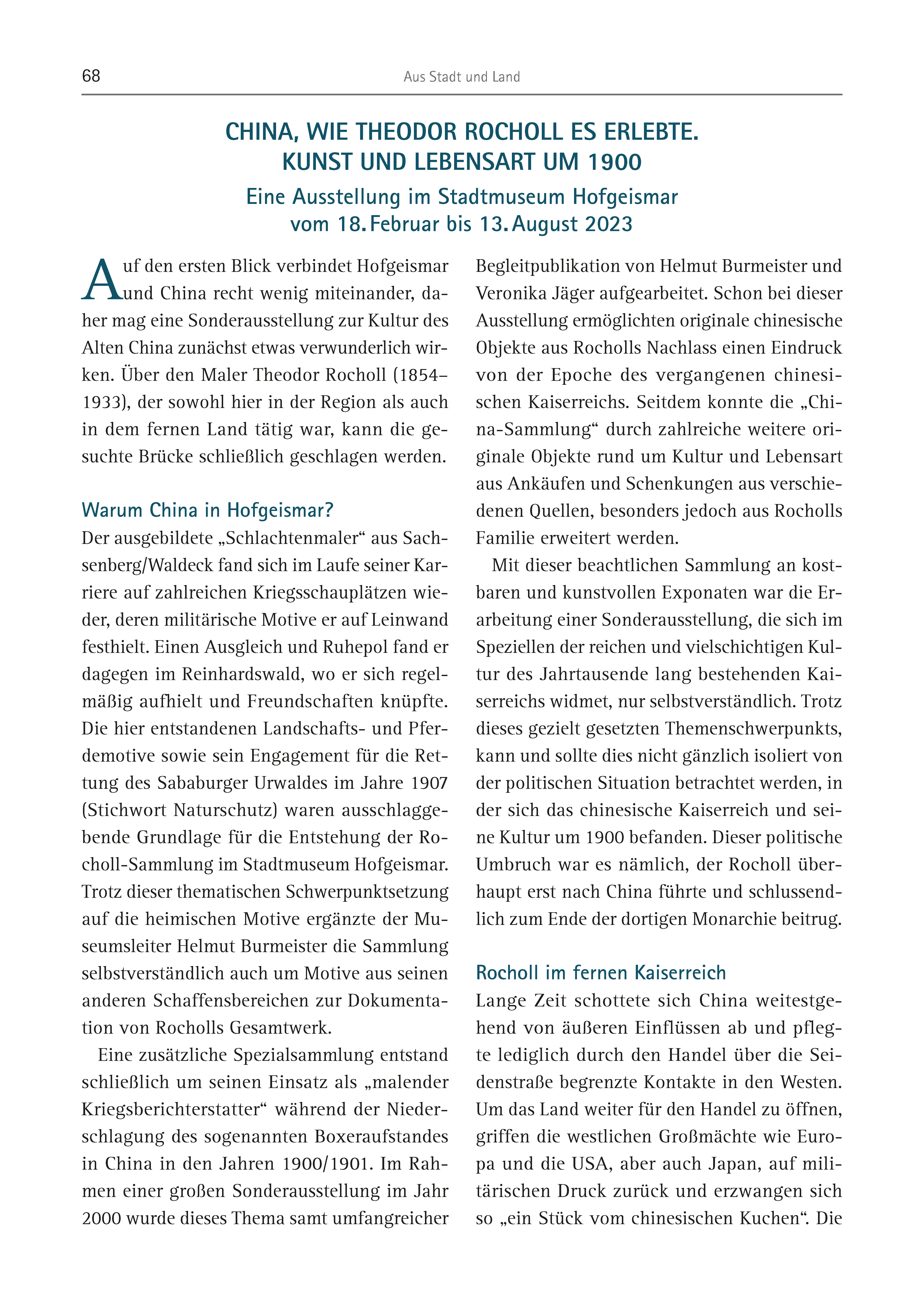 68 Aus Stadt und Land Auf den ersten Blick verbindet Hofgeismar und China recht wenig miteinander, daher mag eine Sonderausstellung zur Kultur des Alten China zunächst etwas verwunderlich wirken. Über den Maler Theodor Rocholl (1854– 1933), der sowohl hier in der Region als auch in dem fernen Land tätig war, kann die gesuchte Brücke schließlich geschlagen werden. Warum China in Hofgeismar? Der ausgebildete „Schlachtenmaler“ aus Sachsenberg/ Waldeck fand sich im Laufe seiner Karriere auf zahlreichen Kriegsschauplätzen wieder, deren militärische Motive er auf Leinwand festhielt. Einen Ausgleich und Ruhepol fand er dagegen im Reinhardswald, wo er sich regelmäßig aufhielt und Freundschaften knüpfte. Die hier entstandenen Landschafts- und Pferdemotive sowie sein Engagement für die Rettung des Sababurger Urwaldes im Jahre 1907 (Stichwort Naturschutz) waren ausschlaggebende Grundlage für die Entstehung der Rocholl- Sammlung im Stadtmuseum Hofgeismar. Trotz dieser thematischen Schwerpunktsetzung auf die heimischen Motive ergänzte der Museumsleiter Helmut Burmeister die Sammlung selbstverständlich auch um Motive aus seinen anderen Schaffensbereichen zur Dokumentation von Rocholls Gesamtwerk. Eine zusätzliche Spezialsammlung entstand schließlich um seinen Einsatz als „malender Kriegsberichterstatter“ während der Niederschlagung des sogenannten Boxeraufstandes in China in den Jahren 1900/1901. Im Rahmen einer großen Sonderausstellung im Jahr 2000 wurde dieses Thema samt umfangreicher Begleitpublikation von Helmut Burmeister und Veronika Jäger aufgearbeitet. Schon bei dieser Ausstellung ermöglichten originale chinesische Objekte aus Rocholls Nachlass einen Eindruck von der Epoche des vergangenen chinesischen Kaiserreichs. Seitdem konnte die „China- Sammlung“ durch zahlreiche weitere originale Objekte rund um Kultur und Lebensart aus Ankäufen und Schenkungen aus verschiedenen Quellen, besonders jedoch aus Rocholls Familie erweitert werden. Mit dieser beachtlichen Sammlung an kostbaren und kunstvollen Exponaten war die Erarbeitung einer Sonderausstellung, die sich im Speziellen der reichen und vielschichtigen Kultur des Jahrtausende lang bestehenden Kaiserreichs widmet, nur selbstverständlich. Trotz dieses gezielt gesetzten Themenschwerpunkts, kann und sollte dies nicht gänzlich isoliert von der politischen Situation betrachtet werden, in der sich das chinesische Kaiserreich und seine Kultur um 1900 befanden. Dieser politische Umbruch war es nämlich, der Rocholl überhaupt erst nach China führte und schlussendlich zum Ende der dortigen Monarchie beitrug. Rocholl im fernen Kaiserreich Lange Zeit schottete sich China weitestgehend von äußeren Einflüssen ab und pflegte lediglich durch den Handel über die Seidenstraße begrenzte Kontakte in den Westen. Um das Land weiter für den Handel zu öffnen, griffen die westlichen Großmächte wie Europa und die USA, aber auch Japan, auf militärischen Druck zurück und erzwangen sich so „ein Stück vom chinesischen Kuchen“. Die CHINA, WIE THEODOR ROCHOLL ES ERLEBTE. KUNST UND LEBENSART UM 1900 Eine Ausstellung im Stadtmuseum Hofgeismar vom 18. Februar bis 13. August 2023