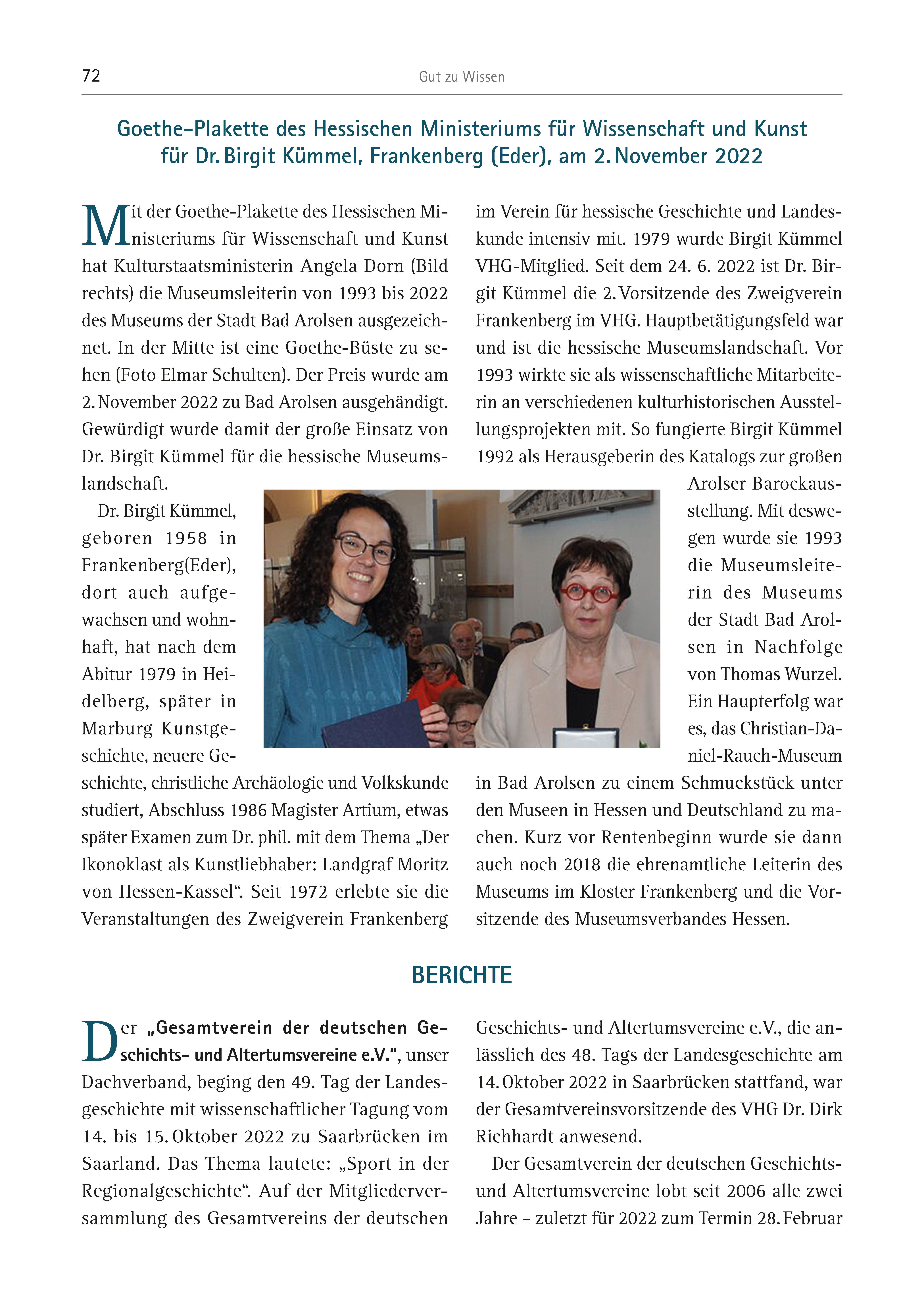 72 Gut zu Wissen Mit der Goethe-Plakette des Hessischen Ministeriums für Wissenschaft und Kunst hat Kulturstaatsministerin Angela Dorn (Bild rechts) die Museumsleiterin von 1993 bis 2022 des Museums der Stadt Bad Arolsen ausgezeichnet. In der Mitte ist eine Goethe-Büste zu sehen (Foto Elmar Schulten). Der Preis wurde am 2. November 2022 zu Bad Arolsen ausgehändigt. Gewürdigt wurde damit der große Einsatz von Dr. Birgit Kümmel für die hessische Museumslandschaft. Dr. Birgit Kümmel, geboren 1958 in Frankenberg(Eder), dort auch aufgewachsen und wohnhaft, hat nach dem Abitur 1979 in Heidelberg, später in Marburg Kunstgeschichte, neuere Geschichte, christliche Archäologie und Volkskunde studiert, Abschluss 1986 Magister Artium, etwas später Examen zum Dr. phil. mit dem Thema „Der Ikonoklast als Kunstliebhaber: Landgraf Moritz von Hessen-Kassel“. Seit 1972 erlebte sie die Veranstaltungen des Zweigverein Frankenberg im Verein für hessische Geschichte und Landeskunde intensiv mit. 1979 wurde Birgit Kümmel VHG-Mitglied. Seit dem 24. 6. 2022 ist Dr. Birgit Kümmel die 2. Vorsitzende des Zweigverein Frankenberg im VHG. Hauptbetätigungsfeld war und ist die hessische Museumslandschaft. Vor 1993 wirkte sie als wissenschaftliche Mitarbeiterin an verschiedenen kulturhistorischen Ausstellungsprojekten mit. So fungierte Birgit Kümmel 1992 als Herausgeberin des Katalogs zur großen Arolser Barockausstellung. Mit deswegen wurde sie 1993 die Museumsleiterin des Museums der Stadt Bad Arolsen in Nachfolge von Thomas Wurzel. Ein Haupterfolg war es, das Christian-Daniel- Rauch-Museum in Bad Arolsen zu einem Schmuckstück unter den Museen in Hessen und Deutschland zu machen. Kurz vor Rentenbeginn wurde sie dann auch noch 2018 die ehrenamtliche Leiterin des Museums im Kloster Frankenberg und die Vorsitzende des Museumsverbandes Hessen. Goethe-Plakette des Hessischen Ministeriums für Wissenschaft und Kunst für Dr. Birgit Kümmel, Frankenberg (Eder), am 2. November 2022 Der „Gesamtverein der deutschen Geschichts- und Altertumsvereine e.V.“, unser Dachverband, beging den 49. Tag der Landesgeschichte mit wissenschaftlicher Tagung vom 14. bis 15. Oktober 2022 zu Saarbrücken im Saarland. Das Thema lautete: „Sport in der Regionalgeschichte“. Auf der Mitgliederversammlung des Gesamtvereins der deutschen Geschichts- und Altertumsvereine e.V., die anlässlich des 48. Tags der Landesgeschichte am 14. Oktober 2022 in Saarbrücken stattfand, war der Gesamtvereinsvorsitzende des VHG Dr. Dirk Richhardt anwesend. Der Gesamtverein der deutschen Geschichtsund Altertumsvereine lobt seit 2006 alle zwei Jahre – zuletzt für 2022 zum Termin 28. Februar BERICHTE