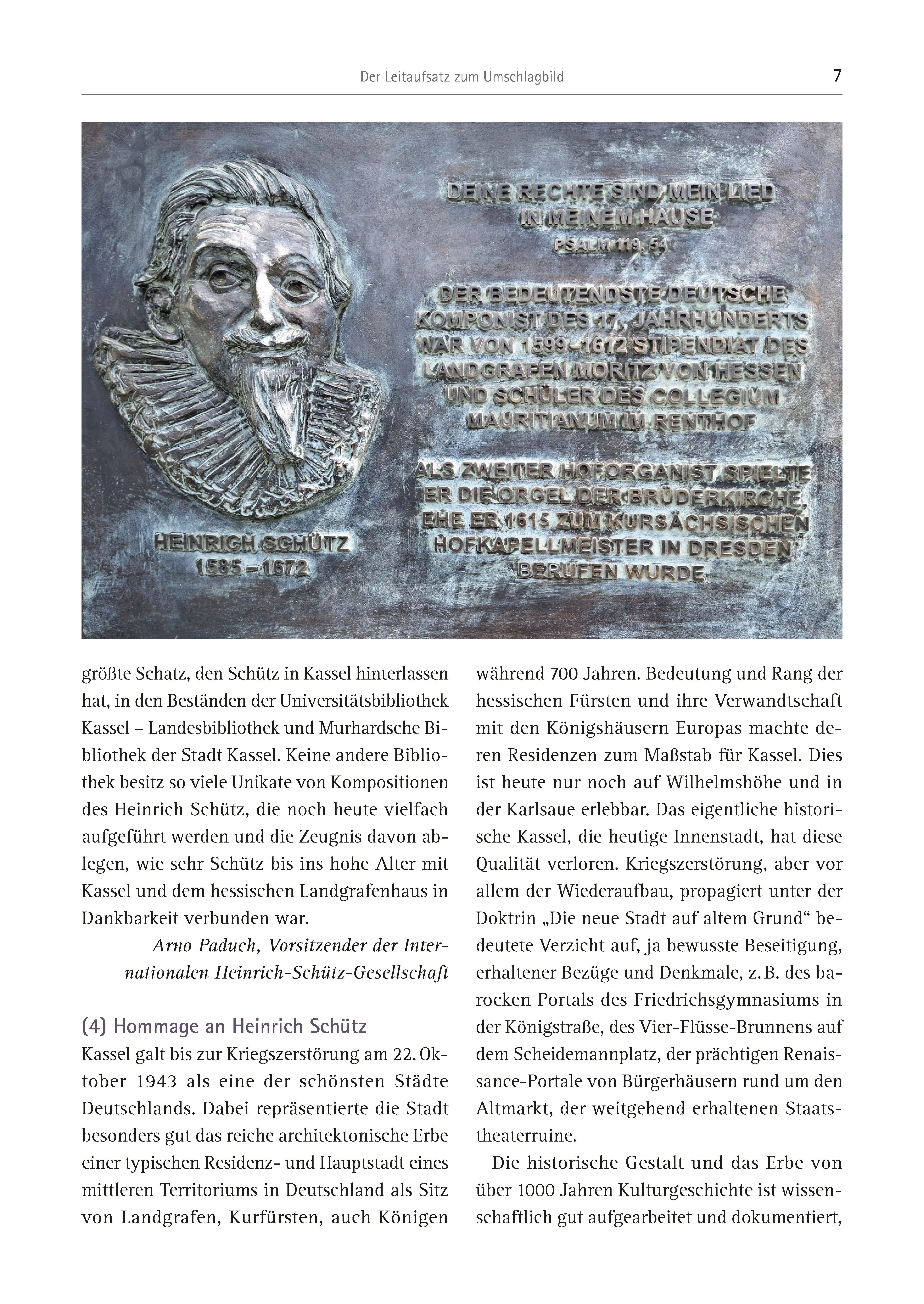 Der Leitaufsatz zum Umschlagbild 7 größte Schatz, den Schütz in Kassel hinterlassen hat, in den Beständen der Universitätsbibliothek Kassel – Landesbibliothek und Murhardsche Bibliothek der Stadt Kassel. Keine andere Bibliothek besitz so viele Unikate von Kompositionen des Heinrich Schütz, die noch heute vielfach aufgeführt werden und die Zeugnis davon ablegen, wie sehr Schütz bis ins hohe Alter mit Kassel und dem hessischen Landgrafenhaus in Dankbarkeit verbunden war. Arno Paduch, Vorsitzender der Internationalen Heinrich-Schütz-Gesellschaft (4) Hommage an Heinrich Schütz Kassel galt bis zur Kriegszerstörung am 22. Oktober 1943 als eine der schönsten Städte Deutschlands. Dabei repräsentierte die Stadt besonders gut das reiche architektonische Erbe einer typischen Residenz- und Hauptstadt eines mittleren Territoriums in Deutschland als Sitz von Landgrafen, Kurfürsten, auch Königen während 700 Jahren. Bedeutung und Rang der hessischen Fürsten und ihre Verwandtschaft mit den Königshäusern Europas machte deren Residenzen zum Maßstab für Kassel. Dies ist heute nur noch auf Wilhelmshöhe und in der Karlsaue erlebbar. Das eigentliche historische Kassel, die heutige Innenstadt, hat diese Qualität verloren. Kriegszerstörung, aber vor allem der Wiederaufbau, propagiert unter der Doktrin „Die neue Stadt auf altem Grund“ bedeutete Verzicht auf, ja bewusste Beseitigung, erhaltener Bezüge und Denkmale, z. B. des barocken Portals des Friedrichsgymnasiums in der Königstraße, des Vier-Flüsse-Brunnens auf dem Scheidemannplatz, der prächtigen Renaissance- Portale von Bürgerhäusern rund um den Altmarkt, der weitgehend erhaltenen Staatstheaterruine. Die historische Gestalt und das Erbe von über 1000 Jahren Kulturgeschichte ist wissenschaftlich gut aufgearbeitet und dokumentiert,