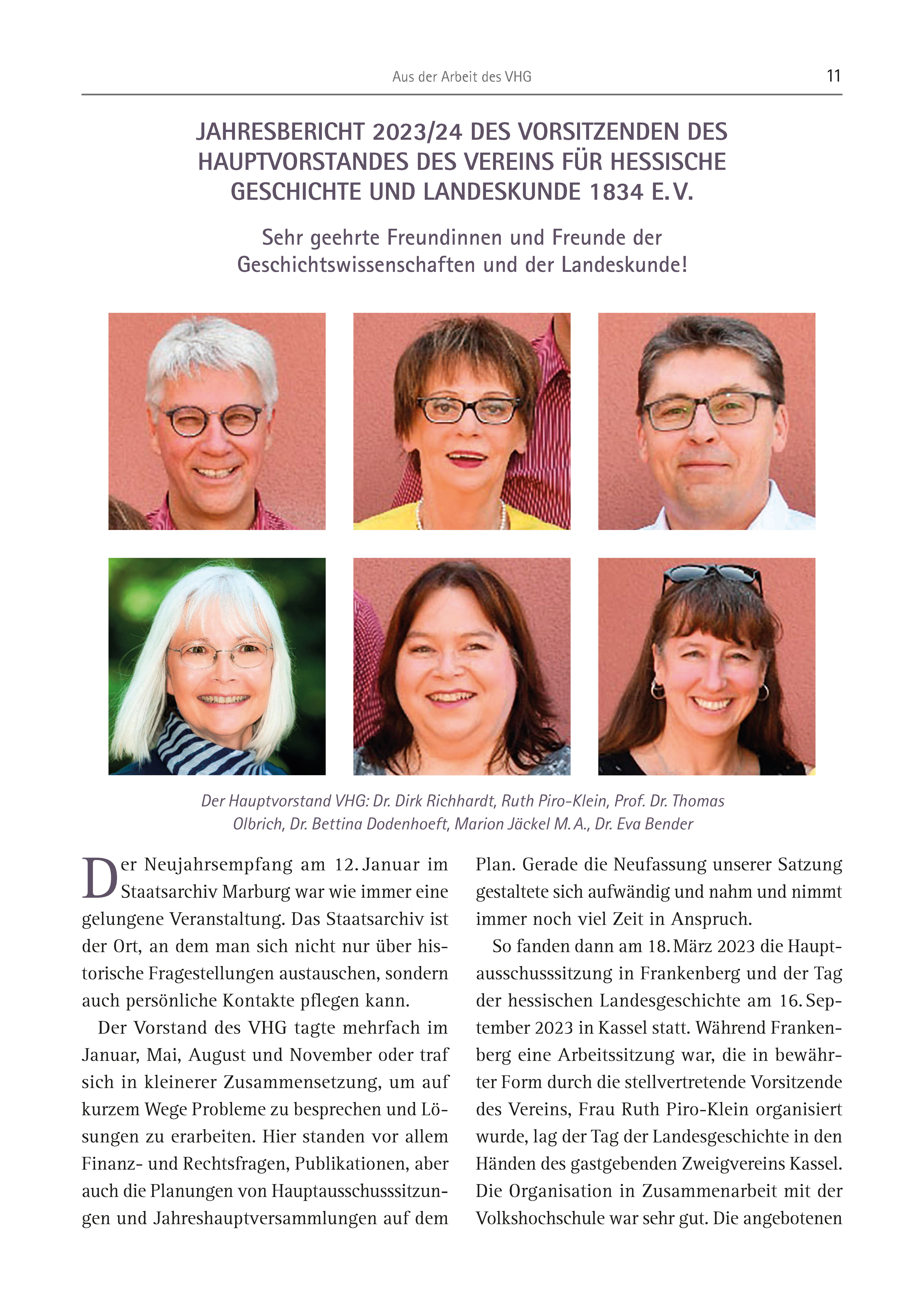 Aus der Arbeit des VHG 11 Der Neujahrsempfang am 12. Januar im Staatsarchiv Marburg war wie immer eine gelungene Veranstaltung. Das Staatsarchiv ist der Ort, an dem man sich nicht nur über historische Fragestellungen austauschen, sondern auch persönliche Kontakte pflegen kann. Der Vorstand des VHG tagte mehrfach im Januar, Mai, August und November oder traf sich in kleinerer Zusammensetzung, um auf kurzem Wege Probleme zu besprechen und Lösungen zu erarbeiten. Hier standen vor allem Finanz- und Rechtsfragen, Publikationen, aber auch die Planungen von Hauptausschusssitzungen und Jahreshauptversammlungen auf dem JAHRESBERICHT 2023/24 DES VORSITZENDEN DES HAUPTVORSTANDES DES VEREINS FÜR HESSISCHE GESCHICHTE UND LANDESKUNDE 1834 E. V. Sehr geehrte Freundinnen und Freunde der Geschichtswissenschaften und der Landeskunde! Plan. Gerade die Neufassung unserer Satzung gestaltete sich aufwändig und nahm und nimmt immer noch viel Zeit in Anspruch. So fanden dann am 18. März 2023 die Hauptausschusssitzung in Frankenberg und der Tag der hessischen Landesgeschichte am 16. September 2023 in Kassel statt. Während Frankenberg eine Arbeitssitzung war, die in bewährter Form durch die stellvertretende Vorsitzende des Vereins, Frau Ruth Piro-Klein organisiert wurde, lag der Tag der Landesgeschichte in den Händen des gastgebenden Zweigvereins Kassel. Die Organisation in Zusammenarbeit mit der Volkshochschule war sehr gut. Die angebotenen Der Hauptvorstand VHG: Dr. Dirk Richhardt, Ruth Piro-Klein, Prof. Dr. Thomas Olbrich, Dr. Bettina Dodenhoeft, Marion Jäckel M. A., Dr. Eva Bender