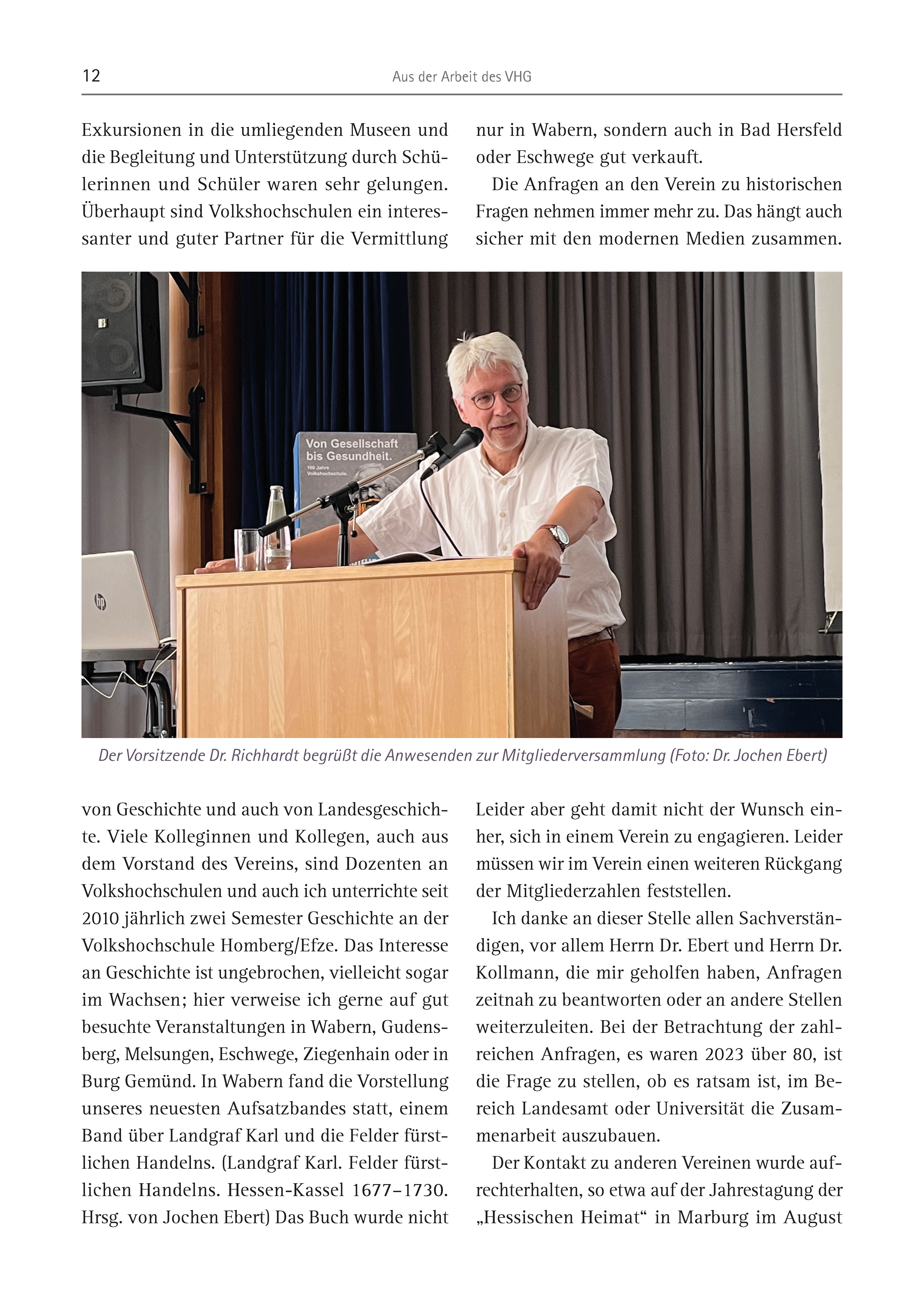 12 Aus der Arbeit des VHG Exkursionen in die umliegenden Museen und die Begleitung und Unterstützung durch Schülerinnen und Schüler waren sehr gelungen. Überhaupt sind Volkshochschulen ein interessanter und guter Partner für die Vermittlung von Geschichte und auch von Landesgeschichte. Viele Kolleginnen und Kollegen, auch aus dem Vorstand des Vereins, sind Dozenten an Volkshochschulen und auch ich unterrichte seit 2010 jährlich zwei Semester Geschichte an der Volkshochschule Homberg/Efze. Das Interesse an Geschichte ist ungebrochen, vielleicht sogar im Wachsen; hier verweise ich gerne auf gut besuchte Veranstaltungen in Wabern, Gudensberg, Melsungen, Eschwege, Ziegenhain oder in Burg Gemünd. In Wabern fand die Vorstellung unseres neuesten Aufsatzbandes statt, einem Band über Landgraf Karl und die Felder fürstlichen Handelns. (Landgraf Karl. Felder fürstlichen Handelns. Hessen-Kassel 1677–1730. Hrsg. von Jochen Ebert) Das Buch wurde nicht nur in Wabern, sondern auch in Bad Hersfeld oder Eschwege gut verkauft. Die Anfragen an den Verein zu historischen Fragen nehmen immer mehr zu. Das hängt auch sicher mit den modernen Medien zusammen. Leider aber geht damit nicht der Wunsch einher, sich in einem Verein zu engagieren. Leider müssen wir im Verein einen weiteren Rückgang der Mitgliederzahlen feststellen. Ich danke an dieser Stelle allen Sachverständigen, vor allem Herrn Dr. Ebert und Herrn Dr. Kollmann, die mir geholfen haben, Anfragen zeitnah zu beantworten oder an andere Stellen weiterzuleiten. Bei der Betrachtung der zahlreichen Anfragen, es waren 2023 über 80, ist die Frage zu stellen, ob es ratsam ist, im Bereich Landesamt oder Universität die Zusammenarbeit auszubauen. Der Kontakt zu anderen Vereinen wurde aufrechterhalten, so etwa auf der Jahrestagung der „Hessischen Heimat“ in Marburg im August Der Vorsitzende Dr. Richhardt begrüßt die Anwesenden zur Mitgliederversammlung (Foto: Dr. Jochen Ebert)