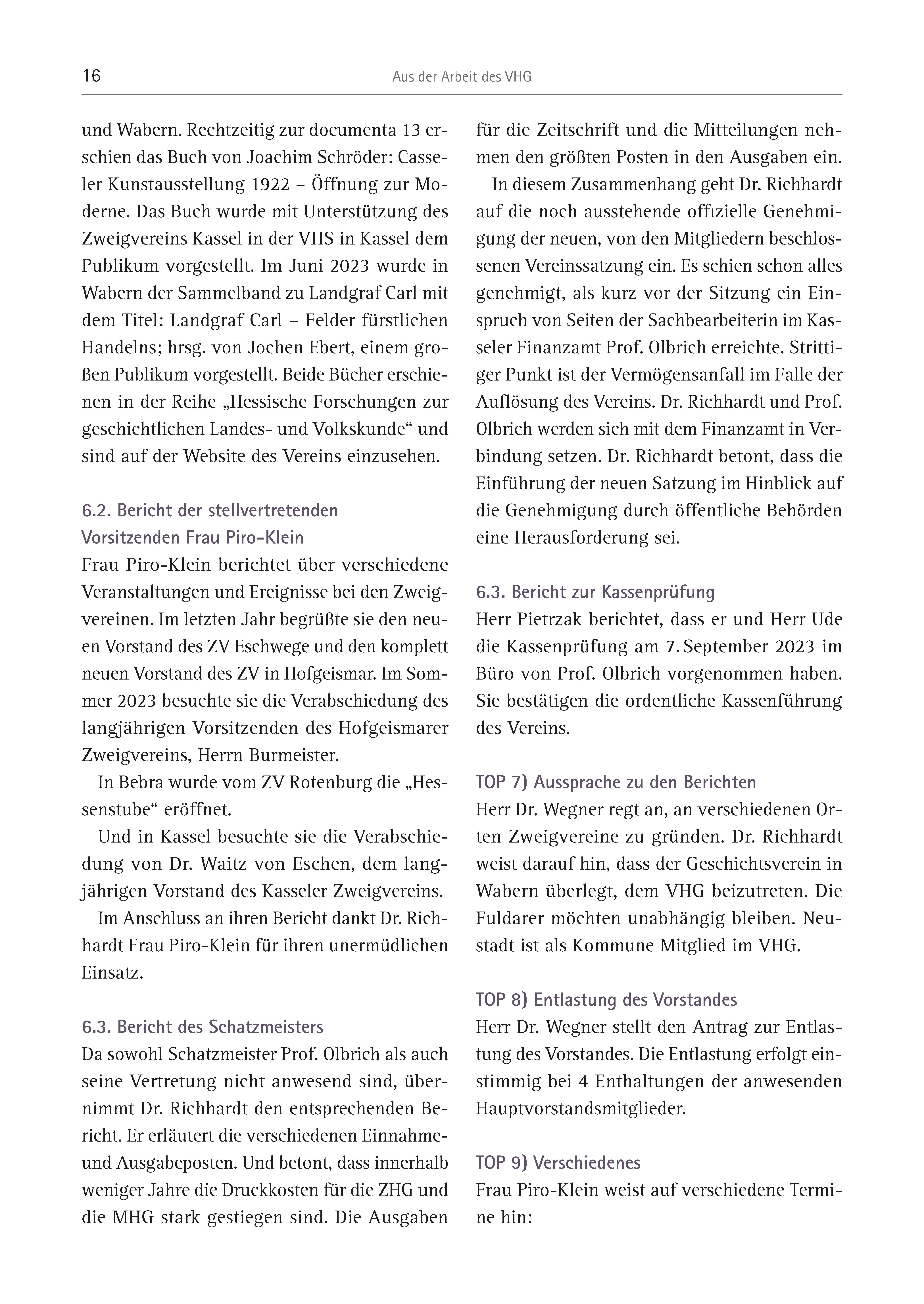 16 Aus der Arbeit des VHG und Wabern. Rechtzeitig zur documenta 13 erschien das Buch von Joachim Schröder: Casseler Kunstausstellung 1922 – Öffnung zur Moderne. Das Buch wurde mit Unterstützung des Zweigvereins Kassel in der VHS in Kassel dem Publikum vorgestellt. Im Juni 2023 wurde in Wabern der Sammelband zu Landgraf Carl mit dem Titel: Landgraf Carl – Felder fürstlichen Handelns; hrsg. von Jochen Ebert, einem großen Publikum vorgestellt. Beide Bücher erschienen in der Reihe „Hessische Forschungen zur geschichtlichen Landes- und Volkskunde“ und sind auf der Website des Vereins einzusehen. 6.2. Bericht der stellvertretenden Vorsitzenden Frau Piro-Klein Frau Piro-Klein berichtet über verschiedene Veranstaltungen und Ereignisse bei den Zweigvereinen. Im letzten Jahr begrüßte sie den neuen Vorstand des ZV Eschwege und den komplett neuen Vorstand des ZV in Hofgeismar. Im Sommer 2023 besuchte sie die Verabschiedung des langjährigen Vorsitzenden des Hofgeismarer Zweigvereins, Herrn Burmeister. In Bebra wurde vom ZV Rotenburg die „Hessenstube“ eröffnet. Und in Kassel besuchte sie die Verabschiedung von Dr. Waitz von Eschen, dem langjährigen Vorstand des Kasseler Zweigvereins. Im Anschluss an ihren Bericht dankt Dr. Richhardt Frau Piro-Klein für ihren unermüdlichen Einsatz. 6.3. Bericht des Schatzmeisters Da sowohl Schatzmeister Prof. Olbrich als auch seine Vertretung nicht anwesend sind, übernimmt Dr. Richhardt den entsprechenden Bericht. Er erläutert die verschiedenen Einnahmeund Ausgabeposten. Und betont, dass innerhalb weniger Jahre die Druckkosten für die ZHG und die MHG stark gestiegen sind. Die Ausgaben für die Zeitschrift und die Mitteilungen nehmen den größten Posten in den Ausgaben ein. In diesem Zusammenhang geht Dr. Richhardt auf die noch ausstehende offizielle Genehmigung der neuen, von den Mitgliedern beschlossenen Vereinssatzung ein. Es schien schon alles genehmigt, als kurz vor der Sitzung ein Einspruch von Seiten der Sachbearbeiterin im Kasseler Finanzamt Prof. Olbrich erreichte. Strittiger Punkt ist der Vermögensanfall im Falle der Auflösung des Vereins. Dr. Richhardt und Prof. Olbrich werden sich mit dem Finanzamt in Verbindung setzen. Dr. Richhardt betont, dass die Einführung der neuen Satzung im Hinblick auf die Genehmigung durch öffentliche Behörden eine Herausforderung sei. 6.3. Bericht zur Kassenprüfung Herr Pietrzak berichtet, dass er und Herr Ude die Kassenprüfung am 7. September 2023 im Büro von Prof. Olbrich vorgenommen haben. Sie bestätigen die ordentliche Kassenführung des Vereins. TOP 7) Aussprache zu den Berichten Herr Dr. Wegner regt an, an verschiedenen Orten Zweigvereine zu gründen. Dr. Richhardt weist darauf hin, dass der Geschichtsverein in Wabern überlegt, dem VHG beizutreten. Die Fuldarer möchten unabhängig bleiben. Neustadt ist als Kommune Mitglied im VHG. TOP 8) Entlastung des Vorstandes Herr Dr. Wegner stellt den Antrag zur Entlastung des Vorstandes. Die Entlastung erfolgt einstimmig bei 4 Enthaltungen der anwesenden Hauptvorstandsmitglieder. TOP 9) Verschiedenes Frau Piro-Klein weist auf verschiedene Termine hin: