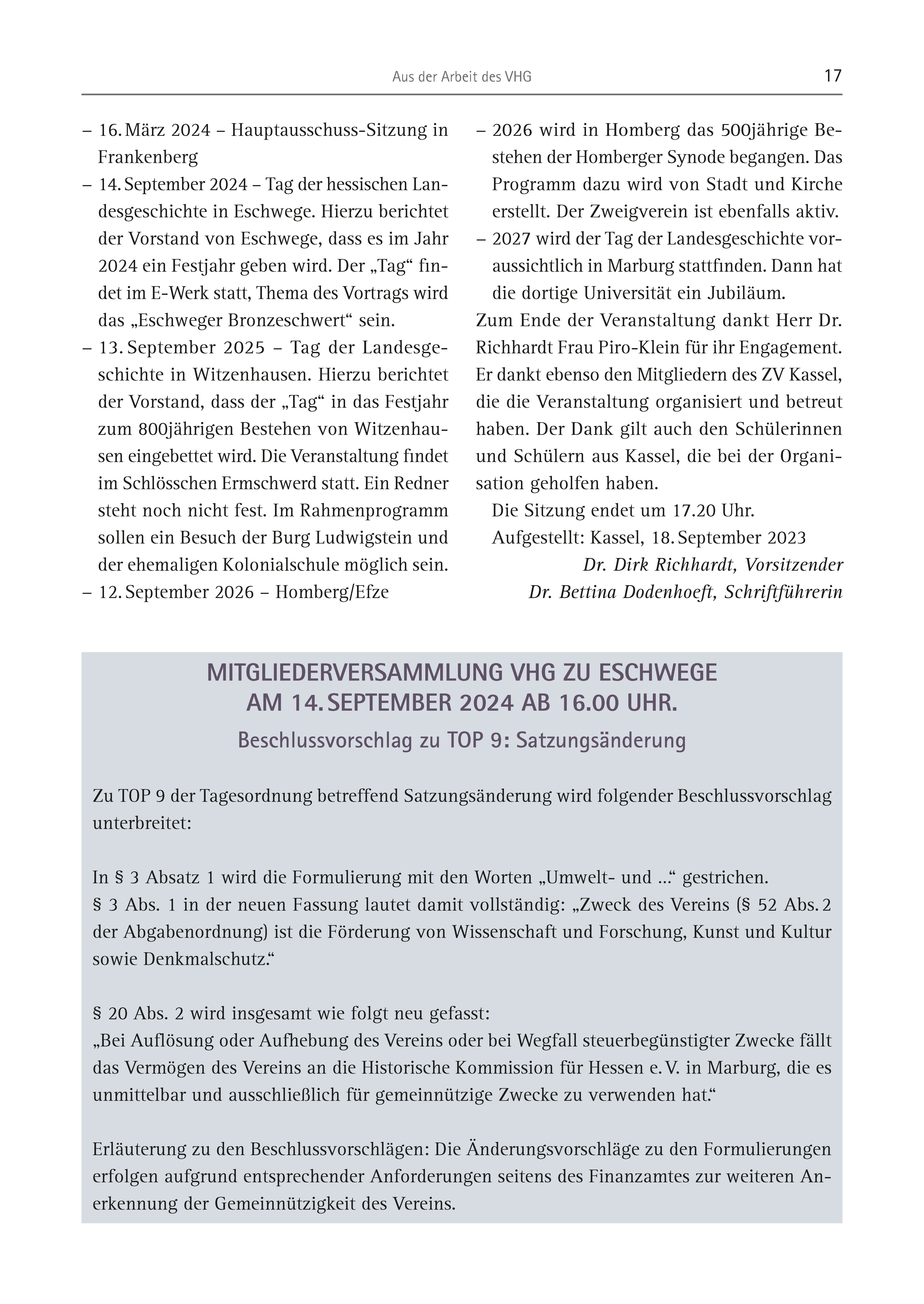 Aus der Arbeit des VHG 17 − 16. März 2024 – Hauptausschuss-Sitzung in Frankenberg − 14. September 2024 – Tag der hessischen Landesgeschichte in Eschwege. Hierzu berichtet der Vorstand von Eschwege, dass es im Jahr 2024 ein Festjahr geben wird. Der „Tag“ findet im E-Werk statt, Thema des Vortrags wird das „Eschweger Bronzeschwert“ sein. − 13. September 2025 – Tag der Landesgeschichte in Witzenhausen. Hierzu berichtet der Vorstand, dass der „Tag“ in das Festjahr zum 800jährigen Bestehen von Witzenhausen eingebettet wird. Die Veranstaltung findet im Schlösschen Ermschwerd statt. Ein Redner steht noch nicht fest. Im Rahmenprogramm sollen ein Besuch der Burg Ludwigstein und der ehemaligen Kolonialschule möglich sein. − 12. September 2026 – Homberg/Efze − 2026 wird in Homberg das 500jährige Bestehen der Homberger Synode begangen. Das Programm dazu wird von Stadt und Kirche erstellt. Der Zweigverein ist ebenfalls aktiv. − 2027 wird der Tag der Landesgeschichte voraussichtlich in Marburg stattfinden. Dann hat die dortige Universität ein Jubiläum. Zum Ende der Veranstaltung dankt Herr Dr. Richhardt Frau Piro-Klein für ihr Engagement. Er dankt ebenso den Mitgliedern des ZV Kassel, die die Veranstaltung organisiert und betreut haben. Der Dank gilt auch den Schülerinnen und Schülern aus Kassel, die bei der Organisation geholfen haben. Die Sitzung endet um 17.20 Uhr. Aufgestellt: Kassel, 18. September 2023 Dr. Dirk Richhardt, Vorsitzender Dr. Bettina Dodenhoeft, Schriftführerin MITGLIEDERVERSAMMLUNG VHG ZU ESCHWEGE AM 14. SEPTEMBER 2024 AB 16.00 UHR. Beschlussvorschlag zu TOP 9: Satzungsänderung Zu TOP 9 der Tagesordnung betreffend Satzungsänderung wird folgender Beschlussvorschlag unterbreitet: In § 3 Absatz 1 wird die Formulierung mit den Worten „Umwelt- und …“ gestrichen. § 3 Abs. 1 in der neuen Fassung lautet damit vollständig: „Zweck des Vereins (§ 52 Abs. 2 der Abgabenordnung) ist die Förderung von Wissenschaft und Forschung, Kunst und Kultur sowie Denkmalschutz.“ § 20 Abs. 2 wird insgesamt wie folgt neu gefasst: „Bei Auflösung oder Aufhebung des Vereins oder bei Wegfall steuerbegünstigter Zwecke fällt das Vermögen des Vereins an die Historische Kommission für Hessen e. V. in Marburg, die es unmittelbar und ausschließlich für gemeinnützige Zwecke zu verwenden hat.“ Erläuterung zu den Beschlussvorschlägen: Die Änderungsvorschläge zu den Formulierungen erfolgen aufgrund entsprechender Anforderungen seitens des Finanzamtes zur weiteren Anerkennung der Gemeinnützigkeit des Vereins.