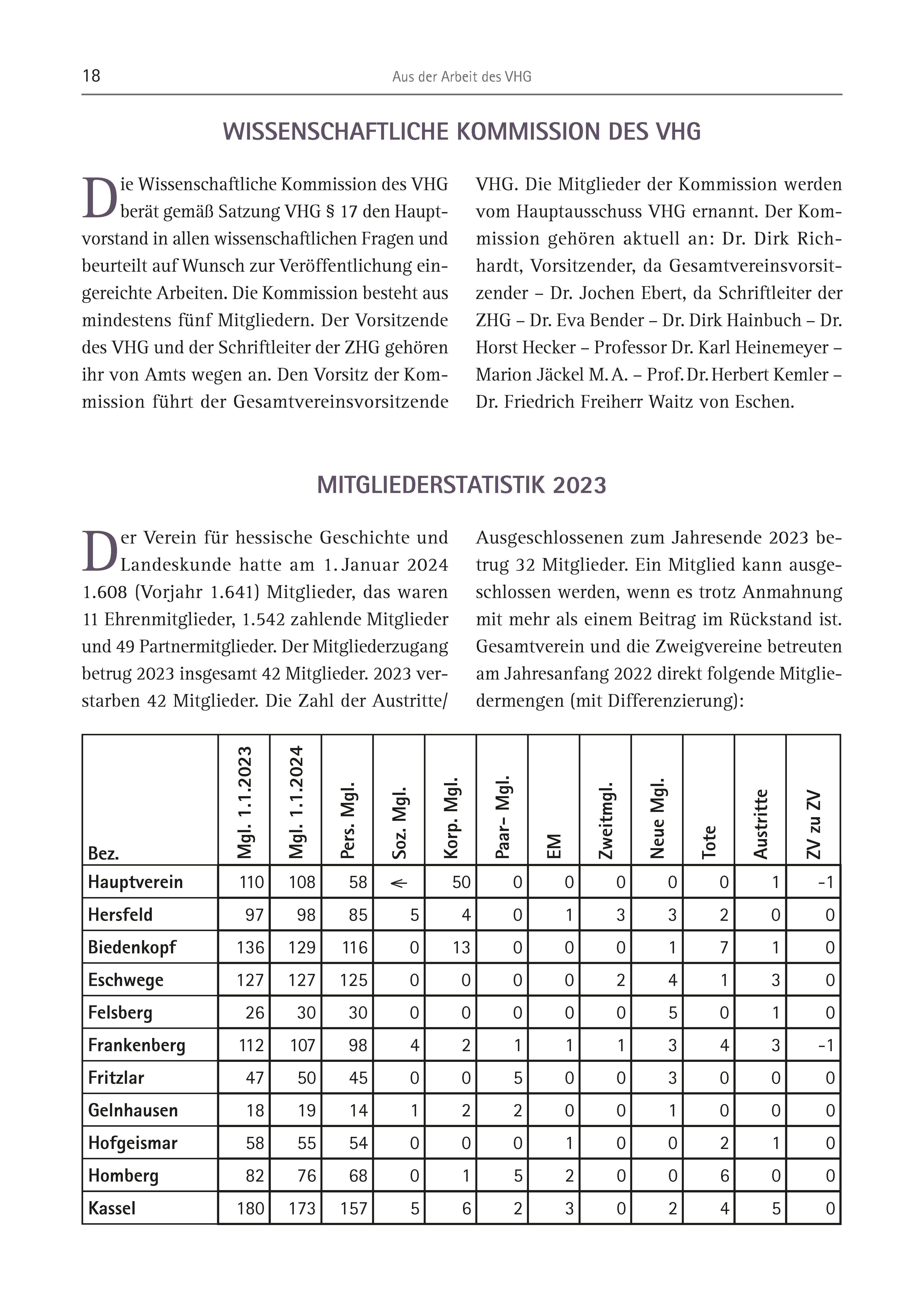18 Aus der Arbeit des VHG WISSENSCHAFTLICHE KOMMISSION DES VHG Die Wissenschaftliche Kommission des VHG berät gemäß Satzung VHG § 17 den Hauptvorstand in allen wissenschaftlichen Fragen und beurteilt auf Wunsch zur Veröffentlichung eingereichte Arbeiten. Die Kommission besteht aus mindestens fünf Mitgliedern. Der Vorsitzende des VHG und der Schriftleiter der ZHG gehören ihr von Amts wegen an. Den Vorsitz der Kommission führt der Gesamtvereinsvorsitzende VHG. Die Mitglieder der Kommission werden vom Hauptausschuss VHG ernannt. Der Kommission gehören aktuell an: Dr. Dirk Richhardt, Vorsitzender, da Gesamtvereinsvorsitzender – Dr. Jochen Ebert, da Schriftleiter der ZHG – Dr. Eva Bender – Dr. Dirk Hainbuch – Dr. Horst Hecker – Professor Dr. Karl Heinemeyer – Marion Jäckel M. A. – Prof. Dr. Herbert Kemler – Dr. Friedrich Freiherr Waitz von Eschen. Der Verein für hessische Geschichte und Landeskunde hatte am 1. Januar 2024 1.608 (Vorjahr 1.641) Mitglieder, das waren 11 Ehrenmitglieder, 1.542 zahlende Mitglieder und 49 Partnermitglieder. Der Mitgliederzugang betrug 2023 insgesamt 42 Mitglieder. 2023 verstarben 42 Mitglieder. Die Zahl der Austritte/ MITGLIEDERSTATISTIK 2023 Ausgeschlossenen zum Jahresende 2023 betrug 32 Mitglieder. Ein Mitglied kann ausgeschlossen werden, wenn es trotz Anmahnung mit mehr als einem Beitrag im Rückstand ist. Gesamtverein und die Zweigvereine betreuten am Jahresanfang 2022 direkt folgende Mitgliedermengen (mit Differenzierung): Bez. Mgl. 1.1.2023 Mgl. 1.1.2024 Pers. Mgl. Soz. Mgl. Korp. Mgl. Paar- Mgl. EM Zweitmgl. Neue Mgl. Tote Austritte ZV zu ZV Hauptverein 110 108 58 <— 50 0 0 0 0 0 1 -1 Hersfeld 97 98 85 5 4 0 1 3 3 2 0 0 Biedenkopf 136 129 116 0 13 0 0 0 1 7 1 0 Eschwege 127 127 125 0 0 0 0 2 4 1 3 0 Felsberg 26 30 30 0 0 0 0 0 5 0 1 0 Frankenberg 112 107 98 4 2 1 1 1 3 4 3 -1 Fritzlar 47 50 45 0 0 5 0 0 3 0 0 0 Gelnhausen 18 19 14 1 2 2 0 0 1 0 0 0 Hofgeismar 58 55 54 0 0 0 1 0 0 2 1 0 Homberg 82 76 68 0 1 5 2 0 0 6 0 0 Kassel 180 173 157 5 6 2 3 0 2 4 5 0