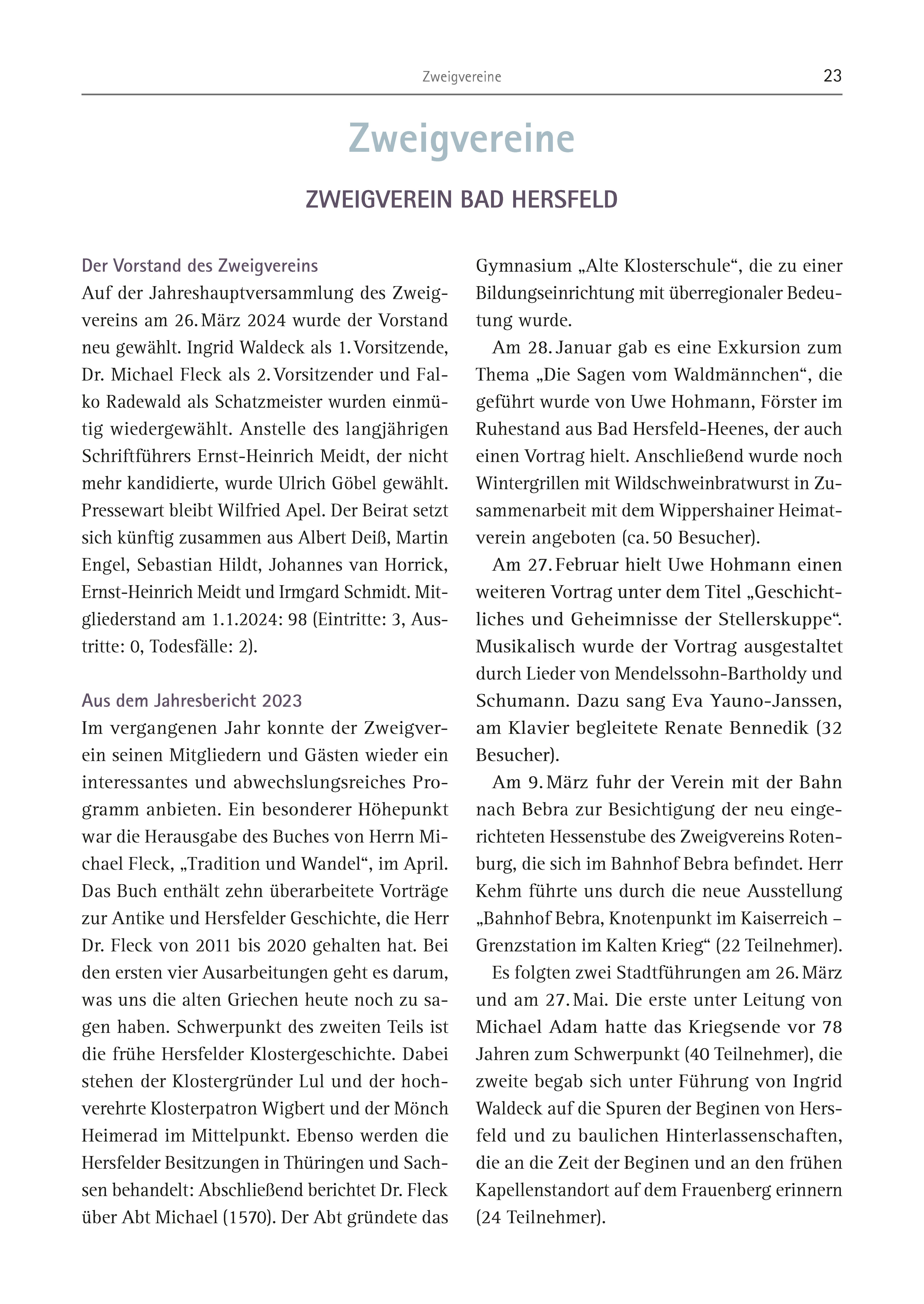 Zweigvereine 23 Zweigvereine ZWEIGVEREIN BAD HERSFELD Der Vorstand des Zweigvereins Auf der Jahreshauptversammlung des Zweigvereins am 26. März 2024 wurde der Vorstand neu gewählt. Ingrid Waldeck als 1. Vorsitzende, Dr. Michael Fleck als 2. Vorsitzender und Falko Radewald als Schatzmeister wurden einmütig wiedergewählt. Anstelle des langjährigen Schriftführers Ernst-Heinrich Meidt, der nicht mehr kandidierte, wurde Ulrich Göbel gewählt. Pressewart bleibt Wilfried Apel. Der Beirat setzt sich künftig zusammen aus Albert Deiß, Martin Engel, Sebastian Hildt, Johannes van Horrick, Ernst-Heinrich Meidt und Irmgard Schmidt. Mitgliederstand am 1.1.2024: 98 (Eintritte: 3, Austritte: 0, Todesfälle: 2). Aus dem Jahresbericht 2023 Im vergangenen Jahr konnte der Zweigverein seinen Mitgliedern und Gästen wieder ein interessantes und abwechslungsreiches Programm anbieten. Ein besonderer Höhepunkt war die Herausgabe des Buches von Herrn Michael Fleck, „Tradition und Wandel“, im April. Das Buch enthält zehn überarbeitete Vorträge zur Antike und Hersfelder Geschichte, die Herr Dr. Fleck von 2011 bis 2020 gehalten hat. Bei den ersten vier Ausarbeitungen geht es darum, was uns die alten Griechen heute noch zu sagen haben. Schwerpunkt des zweiten Teils ist die frühe Hersfelder Klostergeschichte. Dabei stehen der Klostergründer Lul und der hochverehrte Klosterpatron Wigbert und der Mönch Heimerad im Mittelpunkt. Ebenso werden die Hersfelder Besitzungen in Thüringen und Sachsen behandelt: Abschließend berichtet Dr. Fleck über Abt Michael (1570). Der Abt gründete das Gymnasium „Alte Klosterschule“, die zu einer Bildungseinrichtung mit überregionaler Bedeutung wurde. Am 28. Januar gab es eine Exkursion zum Thema „Die Sagen vom Waldmännchen“, die geführt wurde von Uwe Hohmann, Förster im Ruhestand aus Bad Hersfeld-Heenes, der auch einen Vortrag hielt. Anschließend wurde noch Wintergrillen mit Wildschweinbratwurst in Zusammenarbeit mit dem Wippershainer Heimatverein angeboten (ca. 50 Besucher). Am 27. Februar hielt Uwe Hohmann einen weiteren Vortrag unter dem Titel „Geschichtliches und Geheimnisse der Stellerskuppe“. Musikalisch wurde der Vortrag ausgestaltet durch Lieder von Mendelssohn-Bartholdy und Schumann. Dazu sang Eva Yauno-Janssen, am Klavier begleitete Renate Bennedik (32 Besucher). Am 9. März fuhr der Verein mit der Bahn nach Bebra zur Besichtigung der neu eingerichteten Hessenstube des Zweigvereins Rotenburg, die sich im Bahnhof Bebra befindet. Herr Kehm führte uns durch die neue Ausstellung „Bahnhof Bebra, Knotenpunkt im Kaiserreich – Grenzstation im Kalten Krieg“ (22 Teilnehmer). Es folgten zwei Stadtführungen am 26. März und am 27. Mai. Die erste unter Leitung von Michael Adam hatte das Kriegsende vor 78 Jahren zum Schwerpunkt (40 Teilnehmer), die zweite begab sich unter Führung von Ingrid Waldeck auf die Spuren der Beginen von Hersfeld und zu baulichen Hinterlassenschaften, die an die Zeit der Beginen und an den frühen Kapellenstandort auf dem Frauenberg erinnern (24 Teilnehmer).
