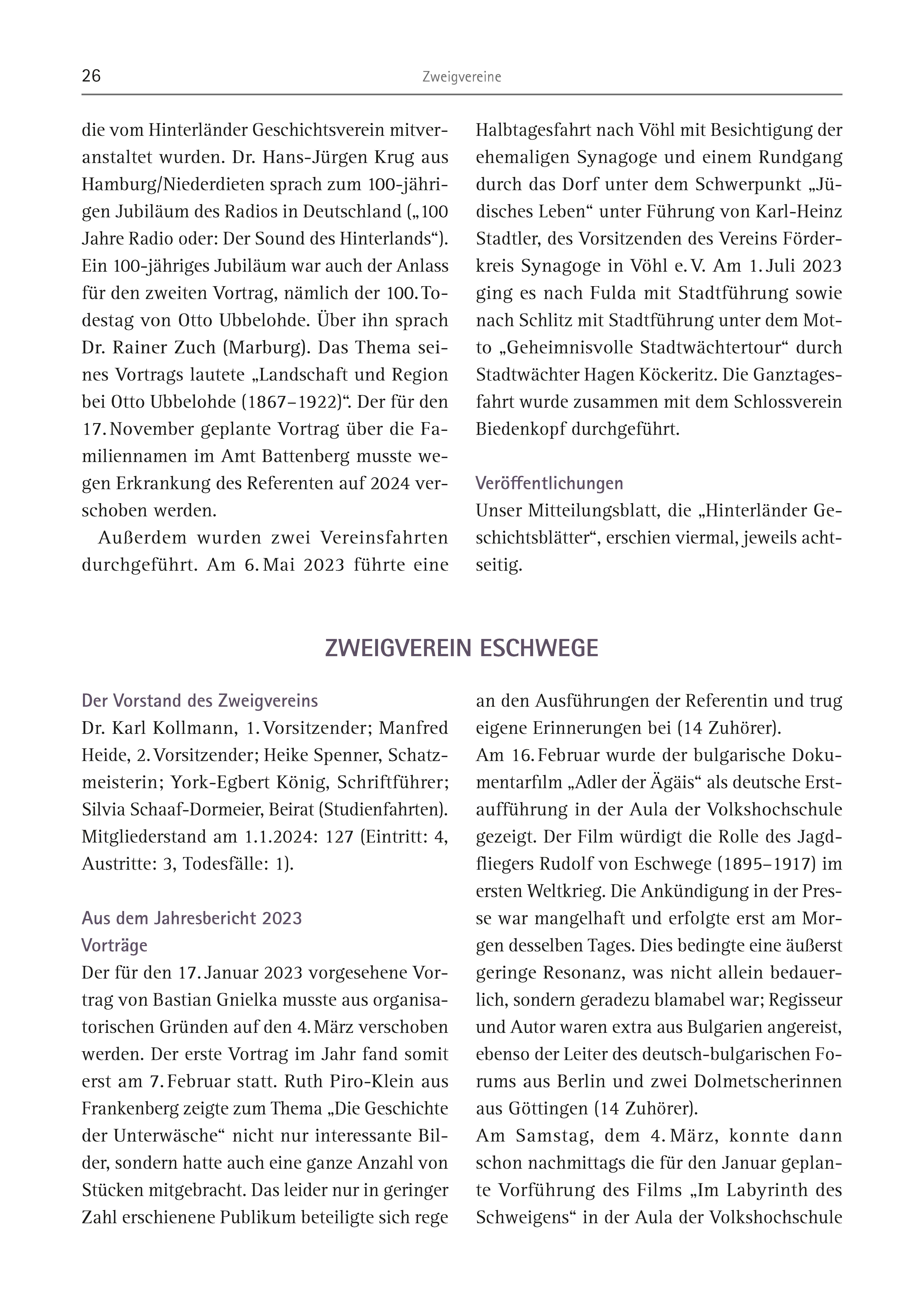 26 Zweigvereine Der Vorstand des Zweigvereins Dr. Karl Kollmann, 1. Vorsitzender; Manfred Heide, 2. Vorsitzender; Heike Spenner, Schatzmeisterin; York-Egbert König, Schriftführer; Silvia Schaaf-Dormeier, Beirat (Studienfahrten). Mitgliederstand am 1.1.2024: 127 (Eintritt: 4, Austritte: 3, Todesfälle: 1). Aus dem Jahresbericht 2023 Vorträge Der für den 17. Januar 2023 vorgesehene Vortrag von Bastian Gnielka musste aus organisatorischen Gründen auf den 4. März verschoben werden. Der erste Vortrag im Jahr fand somit erst am 7. Februar statt. Ruth Piro-Klein aus Frankenberg zeigte zum Thema „Die Geschichte der Unterwäsche“ nicht nur interessante Bilder, sondern hatte auch eine ganze Anzahl von Stücken mitgebracht. Das leider nur in geringer Zahl erschienene Publikum beteiligte sich rege an den Ausführungen der Referentin und trug eigene Erinnerungen bei (14 Zuhörer). Am 16. Februar wurde der bulgarische Dokumentarfilm „Adler der Ägäis“ als deutsche Erstaufführung in der Aula der Volkshochschule gezeigt. Der Film würdigt die Rolle des Jagdfliegers Rudolf von Eschwege (1895–1917) im ersten Weltkrieg. Die Ankündigung in der Presse war mangelhaft und erfolgte erst am Morgen desselben Tages. Dies bedingte eine äußerst geringe Resonanz, was nicht allein bedauerlich, sondern geradezu blamabel war; Regisseur und Autor waren extra aus Bulgarien angereist, ebenso der Leiter des deutsch-bulgarischen Forums aus Berlin und zwei Dolmetscherinnen aus Göttingen (14 Zuhörer). Am Samstag, dem 4. März, konnte dann schon nachmittags die für den Januar geplante Vorführung des Films „Im Labyrinth des Schweigens“ in der Aula der Volkshochschule ZWEIGVEREIN ESCHWEGE die vom Hinterländer Geschichtsverein mitveranstaltet wurden. Dr. Hans-Jürgen Krug aus Hamburg/Niederdieten sprach zum 100-jährigen Jubiläum des Radios in Deutschland („100 Jahre Radio oder: Der Sound des Hinterlands“). Ein 100-jähriges Jubiläum war auch der Anlass für den zweiten Vortrag, nämlich der 100. Todestag von Otto Ubbelohde. Über ihn sprach Dr. Rainer Zuch (Marburg). Das Thema seines Vortrags lautete „Landschaft und Region bei Otto Ubbelohde (1867–1922)“. Der für den 17. November geplante Vortrag über die Familiennamen im Amt Battenberg musste wegen Erkrankung des Referenten auf 2024 verschoben werden. Außerdem wurden zwei Vereinsfahrten durchgeführt. Am 6. Mai 2023 führte eine Halbtagesfahrt nach Vöhl mit Besichtigung der ehemaligen Synagoge und einem Rundgang durch das Dorf unter dem Schwerpunkt „Jüdisches Leben“ unter Führung von Karl-Heinz Stadtler, des Vorsitzenden des Vereins Förderkreis Synagoge in Vöhl e. V. Am 1. Juli 2023 ging es nach Fulda mit Stadtführung sowie nach Schlitz mit Stadtführung unter dem Motto „Geheimnisvolle Stadtwächtertour“ durch Stadtwächter Hagen Köckeritz. Die Ganztagesfahrt wurde zusammen mit dem Schlossverein Biedenkopf durchgeführt. Veröffentlichungen Unser Mitteilungsblatt, die „Hinterländer Geschichtsblätter“, erschien viermal, jeweils achtseitig.
