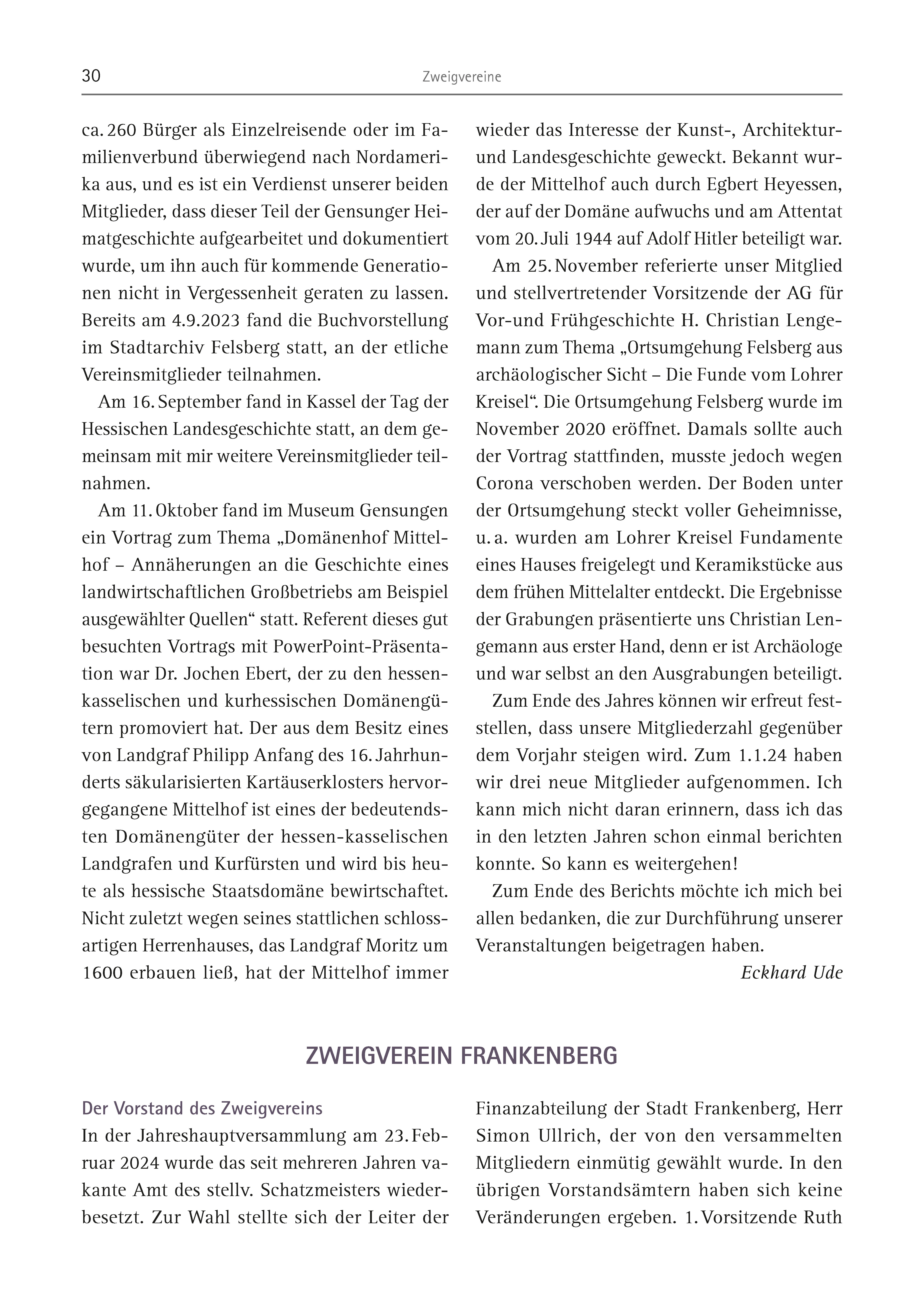30 Zweigvereine ca. 260 Bürger als Einzelreisende oder im Familienverbund überwiegend nach Nordamerika aus, und es ist ein Verdienst unserer beiden Mitglieder, dass dieser Teil der Gensunger Heimatgeschichte aufgearbeitet und dokumentiert wurde, um ihn auch für kommende Generationen nicht in Vergessenheit geraten zu lassen. Bereits am 4.9.2023 fand die Buchvorstellung im Stadtarchiv Felsberg statt, an der etliche Vereinsmitglieder teilnahmen. Am 16. September fand in Kassel der Tag der Hessischen Landesgeschichte statt, an dem gemeinsam mit mir weitere Vereinsmitglieder teilnahmen. Am 11. Oktober fand im Museum Gensungen ein Vortrag zum Thema „Domänenhof Mittelhof – Annäherungen an die Geschichte eines landwirtschaftlichen Großbetriebs am Beispiel ausgewählter Quellen“ statt. Referent dieses gut besuchten Vortrags mit PowerPoint-Präsentation war Dr. Jochen Ebert, der zu den hessenkasselischen und kurhessischen Domänengütern promoviert hat. Der aus dem Besitz eines von Landgraf Philipp Anfang des 16. Jahrhunderts säkularisierten Kartäuserklosters hervorgegangene Mittelhof ist eines der bedeutendsten Domänengüter der hessen-kasselischen Landgrafen und Kurfürsten und wird bis heute als hessische Staatsdomäne bewirtschaftet. Nicht zuletzt wegen seines stattlichen schlossartigen Herrenhauses, das Landgraf Moritz um 1600 erbauen ließ, hat der Mittelhof immer wieder das Interesse der Kunst-, Architekturund Landesgeschichte geweckt. Bekannt wurde der Mittelhof auch durch Egbert Heyessen, der auf der Domäne aufwuchs und am Attentat vom 20. Juli 1944 auf Adolf Hitler beteiligt war. Am 25. November referierte unser Mitglied und stellvertretender Vorsitzende der AG für Vor-und Frühgeschichte H. Christian Lengemann zum Thema „Ortsumgehung Felsberg aus archäologischer Sicht – Die Funde vom Lohrer Kreisel“. Die Ortsumgehung Felsberg wurde im November 2020 eröffnet. Damals sollte auch der Vortrag stattfinden, musste jedoch wegen Corona verschoben werden. Der Boden unter der Ortsumgehung steckt voller Geheimnisse, u. a. wurden am Lohrer Kreisel Fundamente eines Hauses freigelegt und Keramikstücke aus dem frühen Mittelalter entdeckt. Die Ergebnisse der Grabungen präsentierte uns Christian Lengemann aus erster Hand, denn er ist Archäologe und war selbst an den Ausgrabungen beteiligt. Zum Ende des Jahres können wir erfreut feststellen, dass unsere Mitgliederzahl gegenüber dem Vorjahr steigen wird. Zum 1.1.24 haben wir drei neue Mitglieder aufgenommen. Ich kann mich nicht daran erinnern, dass ich das in den letzten Jahren schon einmal berichten konnte. So kann es weitergehen! Zum Ende des Berichts möchte ich mich bei allen bedanken, die zur Durchführung unserer Veranstaltungen beigetragen haben. Eckhard Ude Finanzabteilung der Stadt Frankenberg, Herr Simon Ullrich, der von den versammelten Mitgliedern einmütig gewählt wurde. In den übrigen Vorstandsämtern haben sich keine Veränderungen ergeben. 1. Vorsitzende Ruth ZWEIGVEREIN FRANKENBERG Der Vorstand des Zweigvereins In der Jahreshauptversammlung am 23. Februar 2024 wurde das seit mehreren Jahren vakante Amt des stellv. Schatzmeisters wiederbesetzt. Zur Wahl stellte sich der Leiter der