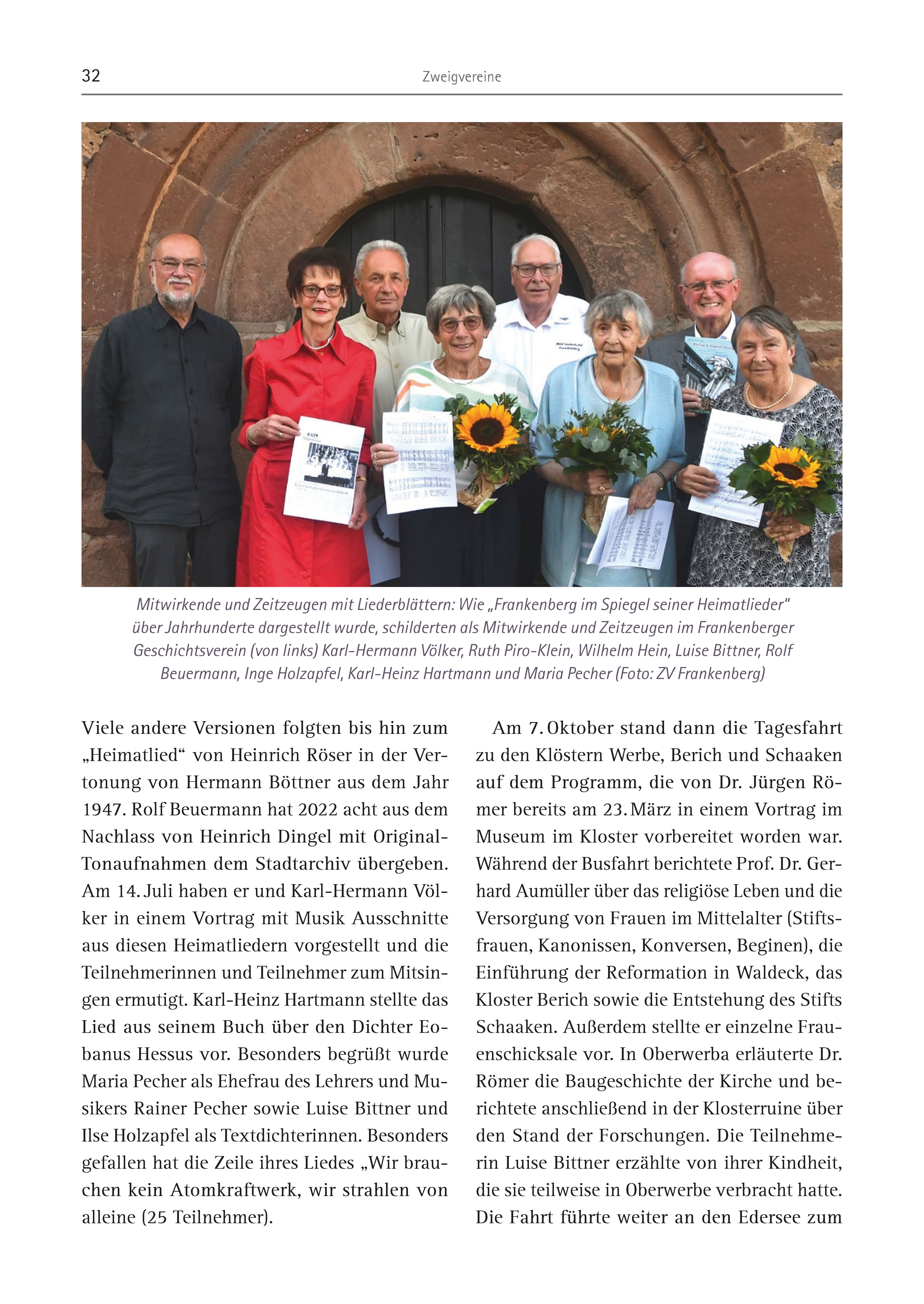 32 Zweigvereine Viele andere Versionen folgten bis hin zum „Heimatlied“ von Heinrich Röser in der Vertonung von Hermann Böttner aus dem Jahr 1947. Rolf Beuermann hat 2022 acht aus dem Nachlass von Heinrich Dingel mit Original- Tonaufnahmen dem Stadtarchiv übergeben. Am 14. Juli haben er und Karl-Hermann Völker in einem Vortrag mit Musik Ausschnitte aus diesen Heimatliedern vorgestellt und die Teilnehmerinnen und Teilnehmer zum Mitsingen ermutigt. Karl-Heinz Hartmann stellte das Lied aus seinem Buch über den Dichter Eobanus Hessus vor. Besonders begrüßt wurde Maria Pecher als Ehefrau des Lehrers und Musikers Rainer Pecher sowie Luise Bittner und Ilse Holzapfel als Textdichterinnen. Besonders gefallen hat die Zeile ihres Liedes „Wir brauchen kein Atomkraftwerk, wir strahlen von alleine (25 Teilnehmer). Am 7. Oktober stand dann die Tagesfahrt zu den Klöstern Werbe, Berich und Schaaken auf dem Programm, die von Dr. Jürgen Römer bereits am 23. März in einem Vortrag im Museum im Kloster vorbereitet worden war. Während der Busfahrt berichtete Prof. Dr. Gerhard Aumüller über das religiöse Leben und die Versorgung von Frauen im Mittelalter (Stiftsfrauen, Kanonissen, Konversen, Beginen), die Einführung der Reformation in Waldeck, das Kloster Berich sowie die Entstehung des Stifts Schaaken. Außerdem stellte er einzelne Frauenschicksale vor. In Oberwerba erläuterte Dr. Römer die Baugeschichte der Kirche und berichtete anschließend in der Klosterruine über den Stand der Forschungen. Die Teilnehmerin Luise Bittner erzählte von ihrer Kindheit, die sie teilweise in Oberwerbe verbracht hatte. Die Fahrt führte weiter an den Edersee zum Mitwirkende und Zeitzeugen mit Liederblättern: Wie „Frankenberg im Spiegel seiner Heimatlieder“ über Jahrhunderte dargestellt wurde, schilderten als Mitwirkende und Zeitzeugen im Frankenberger Geschichtsverein (von links) Karl-Hermann Völker, Ruth Piro-Klein, Wilhelm Hein, Luise Bittner, Rolf Beuermann, Inge Holzapfel, Karl-Heinz Hartmann und Maria Pecher (Foto: ZV Frankenberg)