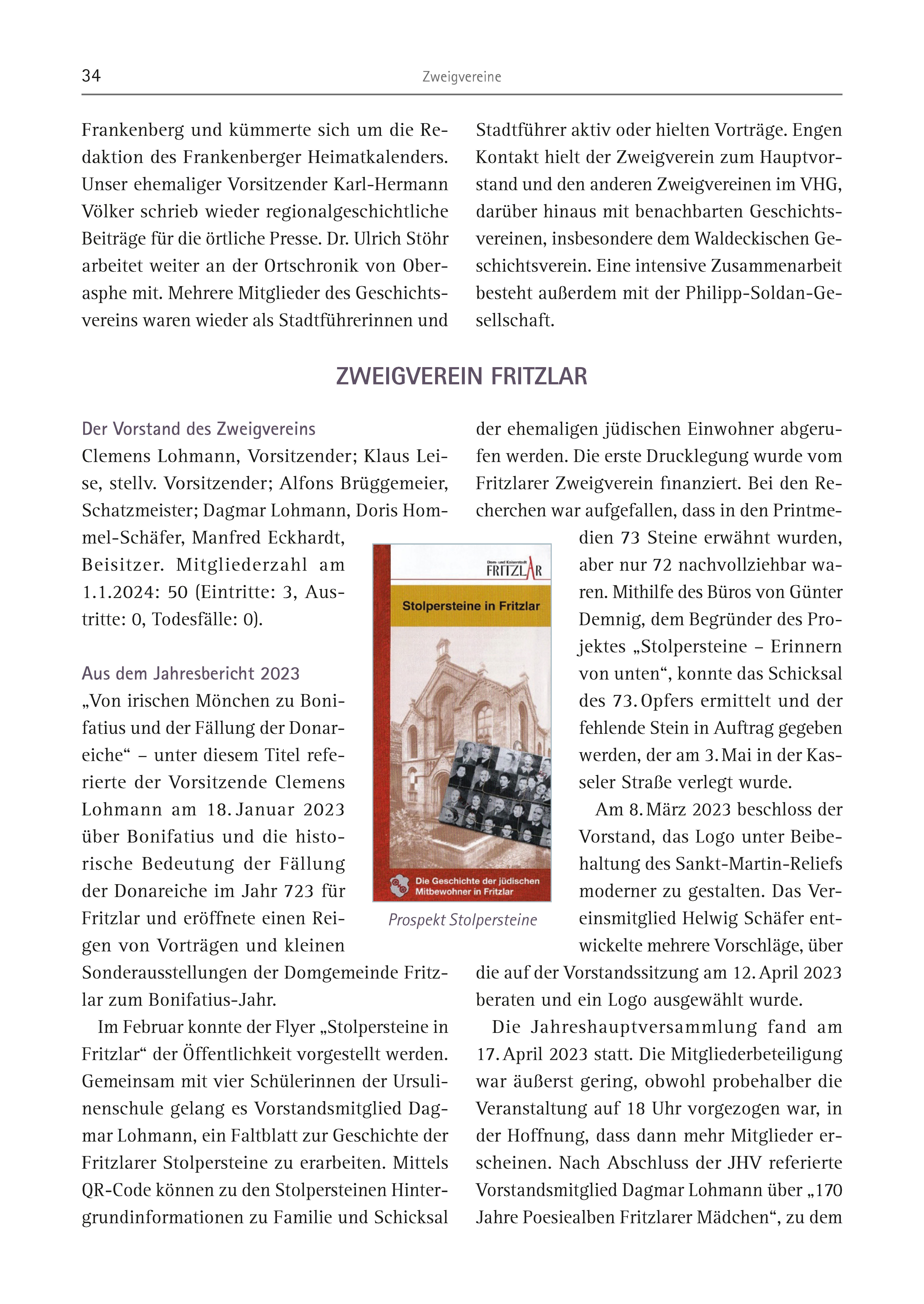 34 Zweigvereine Frankenberg und kümmerte sich um die Redaktion des Frankenberger Heimatkalenders. Unser ehemaliger Vorsitzender Karl-Hermann Völker schrieb wieder regionalgeschichtliche Beiträge für die örtliche Presse. Dr. Ulrich Stöhr arbeitet weiter an der Ortschronik von Oberasphe mit. Mehrere Mitglieder des Geschichtsvereins waren wieder als Stadtführerinnen und Stadtführer aktiv oder hielten Vorträge. Engen Kontakt hielt der Zweigverein zum Hauptvorstand und den anderen Zweigvereinen im VHG, darüber hinaus mit benachbarten Geschichtsvereinen, insbesondere dem Waldeckischen Geschichtsverein. Eine intensive Zusammenarbeit besteht außerdem mit der Philipp-Soldan-Gesellschaft. Der Vorstand des Zweigvereins Clemens Lohmann, Vorsitzender; Klaus Leise, stellv. Vorsitzender; Alfons Brüggemeier, Schatzmeister; Dagmar Lohmann, Doris Hommel- Schäfer, Manfred Eckhardt, Beisitzer. Mitgliederzahl am 1.1.2024: 50 (Eintritte: 3, Austritte: 0, Todesfälle: 0). Aus dem Jahresbericht 2023 „Von irischen Mönchen zu Bonifatius und der Fällung der Donareiche“ – unter diesem Titel referierte der Vorsitzende Clemens Lohmann am 18. Januar 2023 über Bonifatius und die historische Bedeutung der Fällung der Donareiche im Jahr 723 für Fritzlar und eröffnete einen Reigen von Vorträgen und kleinen Sonderausstellungen der Domgemeinde Fritzlar zum Bonifatius-Jahr. Im Februar konnte der Flyer „Stolpersteine in Fritzlar“ der Öffentlichkeit vorgestellt werden. Gemeinsam mit vier Schülerinnen der Ursulinenschule gelang es Vorstandsmitglied Dagmar Lohmann, ein Faltblatt zur Geschichte der Fritzlarer Stolpersteine zu erarbeiten. Mittels QR-Code können zu den Stolpersteinen Hintergrundinformationen zu Familie und Schicksal ZWEIGVEREIN FRITZLAR der ehemaligen jüdischen Einwohner abgerufen werden. Die erste Drucklegung wurde vom Fritzlarer Zweigverein finanziert. Bei den Recherchen war aufgefallen, dass in den Printmedien 73 Steine erwähnt wurden, aber nur 72 nachvollziehbar waren. Mithilfe des Büros von Günter Demnig, dem Begründer des Projektes „Stolpersteine – Erinnern von unten“, konnte das Schicksal des 73. Opfers ermittelt und der fehlende Stein in Auftrag gegeben werden, der am 3. Mai in der Kasseler Straße verlegt wurde. Am 8. März 2023 beschloss der Vorstand, das Logo unter Beibehaltung des Sankt-Martin-Reliefs moderner zu gestalten. Das Vereinsmitglied Helwig Schäfer entwickelte mehrere Vorschläge, über die auf der Vorstandssitzung am 12. April 2023 beraten und ein Logo ausgewählt wurde. Die Jahreshauptversammlung fand am 17. April 2023 statt. Die Mitgliederbeteiligung war äußerst gering, obwohl probehalber die Veranstaltung auf 18 Uhr vorgezogen war, in der Hoffnung, dass dann mehr Mitglieder erscheinen. Nach Abschluss der JHV referierte Vorstandsmitglied Dagmar Lohmann über „170 Jahre Poesiealben Fritzlarer Mädchen“, zu dem Prospekt Stolpersteine