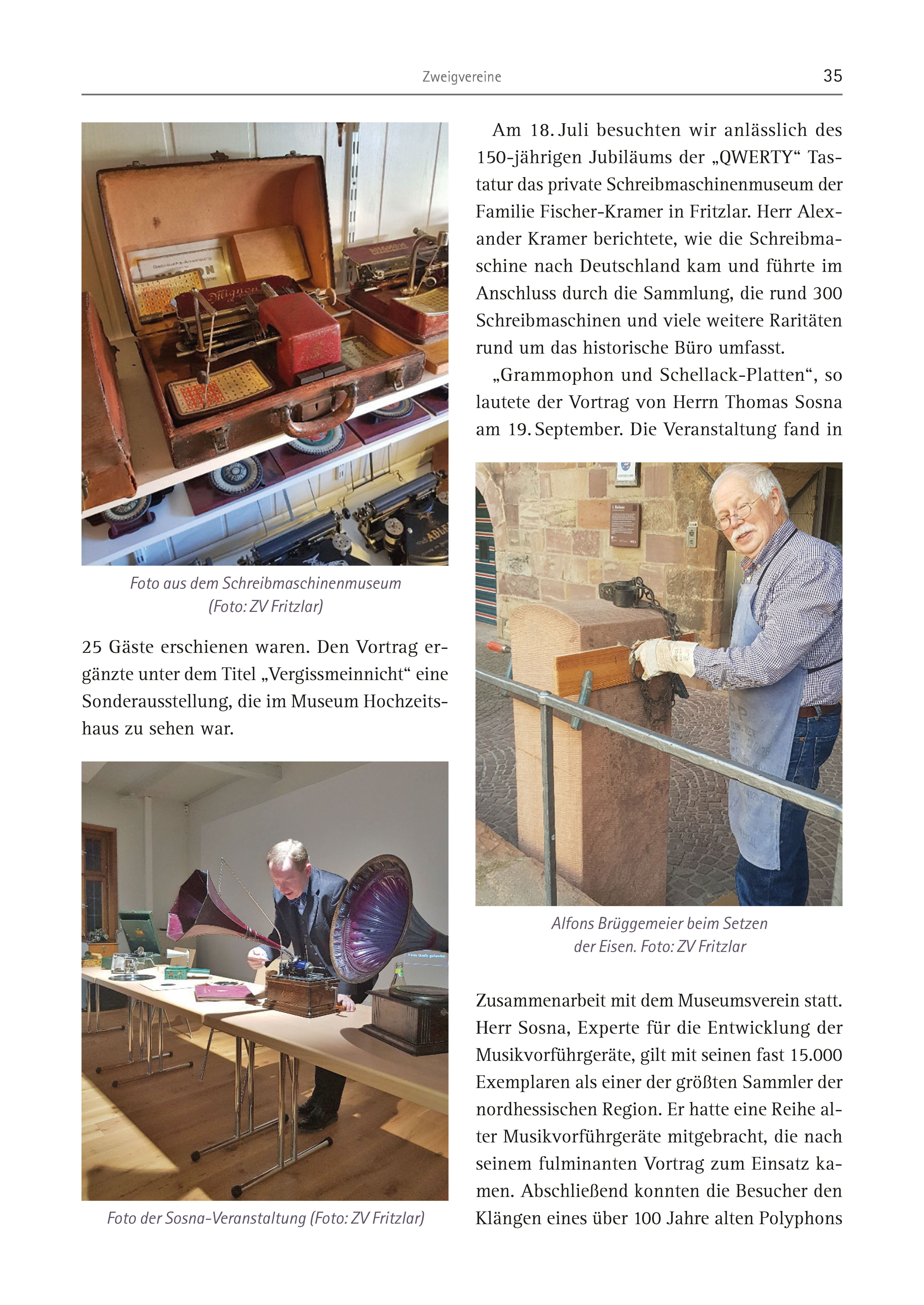 Zweigvereine 35 25 Gäste erschienen waren. Den Vortrag ergänzte unter dem Titel „Vergissmeinnicht“ eine Sonderausstellung, die im Museum Hochzeitshaus zu sehen war. Am 18. Juli besuchten wir anlässlich des 150-jährigen Jubiläums der „QWERTY“ Tastatur das private Schreibmaschinenmuseum der Familie Fischer-Kramer in Fritzlar. Herr Alexander Kramer berichtete, wie die Schreibmaschine nach Deutschland kam und führte im Anschluss durch die Sammlung, die rund 300 Schreibmaschinen und viele weitere Raritäten rund um das historische Büro umfasst. „Grammophon und Schellack-Platten“, so lautete der Vortrag von Herrn Thomas Sosna am 19. September. Die Veranstaltung fand in Zusammenarbeit mit dem Museumsverein statt. Herr Sosna, Experte für die Entwicklung der Musikvorführgeräte, gilt mit seinen fast 15.000 Exemplaren als einer der größten Sammler der nordhessischen Region. Er hatte eine Reihe alter Musikvorführgeräte mitgebracht, die nach seinem fulminanten Vortrag zum Einsatz kamen. Abschließend konnten die Besucher den Klängen eines über 100 Jahre alten Polyphons Foto aus dem Schreibmaschinenmuseum (Foto: ZV Fritzlar) Foto der Sosna-Veranstaltung (Foto: ZV Fritzlar) Alfons Brüggemeier beim Setzen der Eisen. Foto: ZV Fritzlar