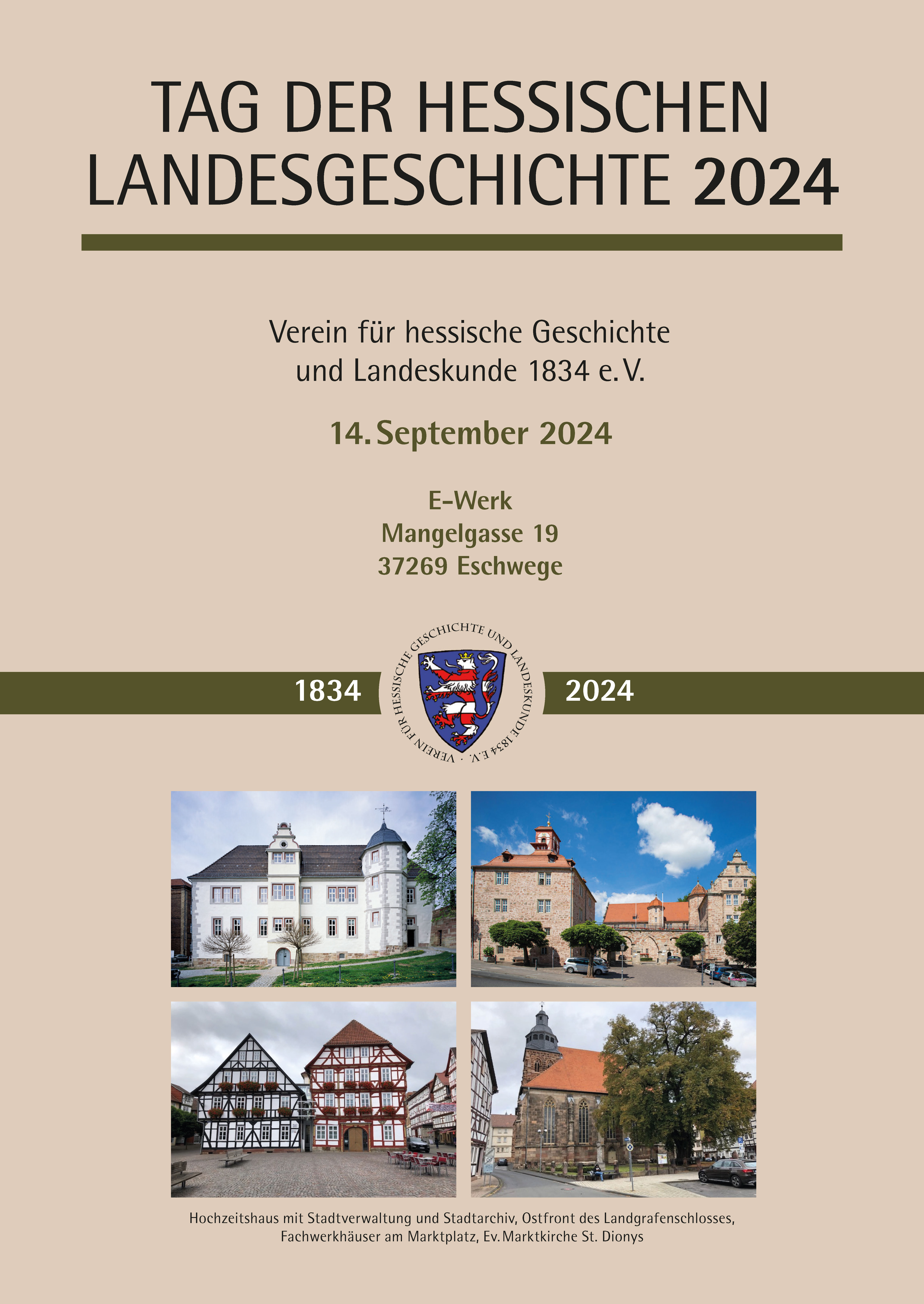 Zweigvereine 39 VEREIN FÜR HESSISCHE GESCHICHTE UND LANDESKUNDE 1834 E.V. · TAG DER HESSISCHEN LANDESGESCHICHTE 2024 Verein für hessische Geschichte und Landeskunde 1834 e. V. 14. September 2024 E-Werk Mangelgasse 19 37269 Eschwege 1834 2024 Hochzeitshaus mit Stadtverwaltung und Stadtarchiv, Ostfront des Landgrafenschlosses, Fachwerkhäuser am Marktplatz, Ev. Marktkirche St. Dionys